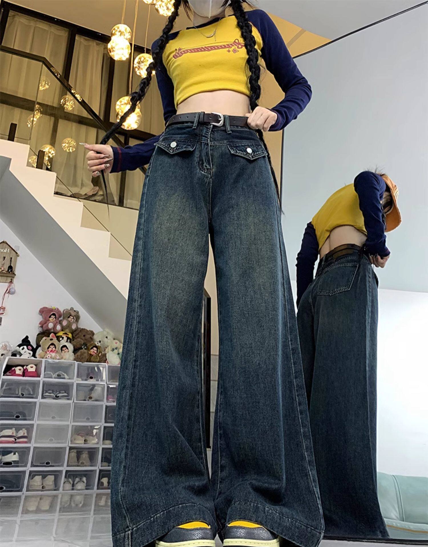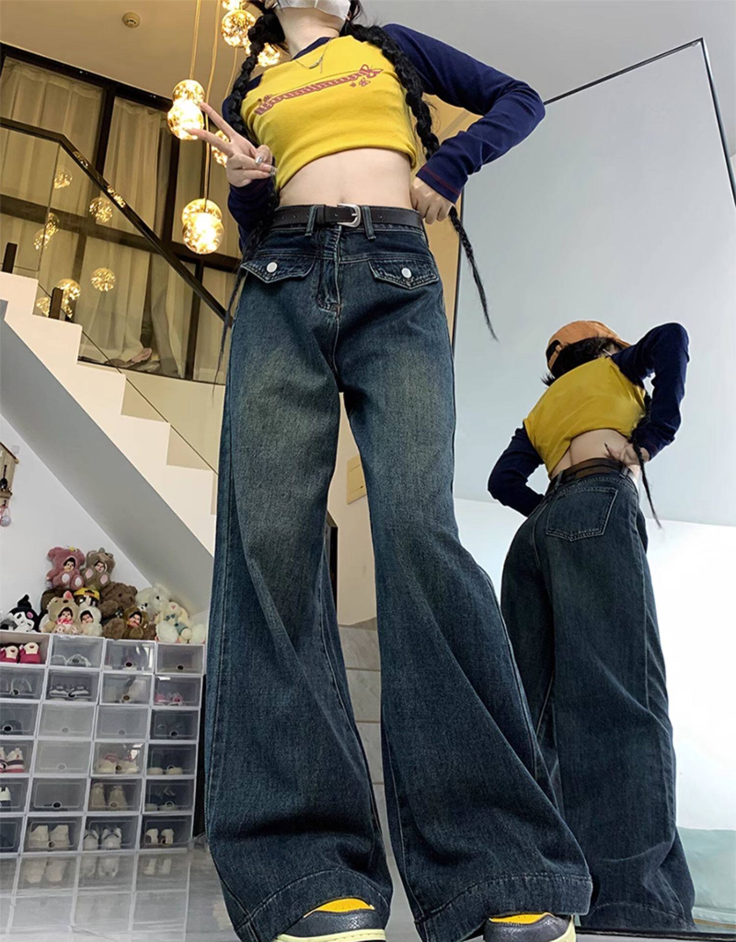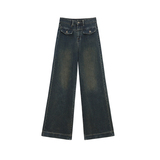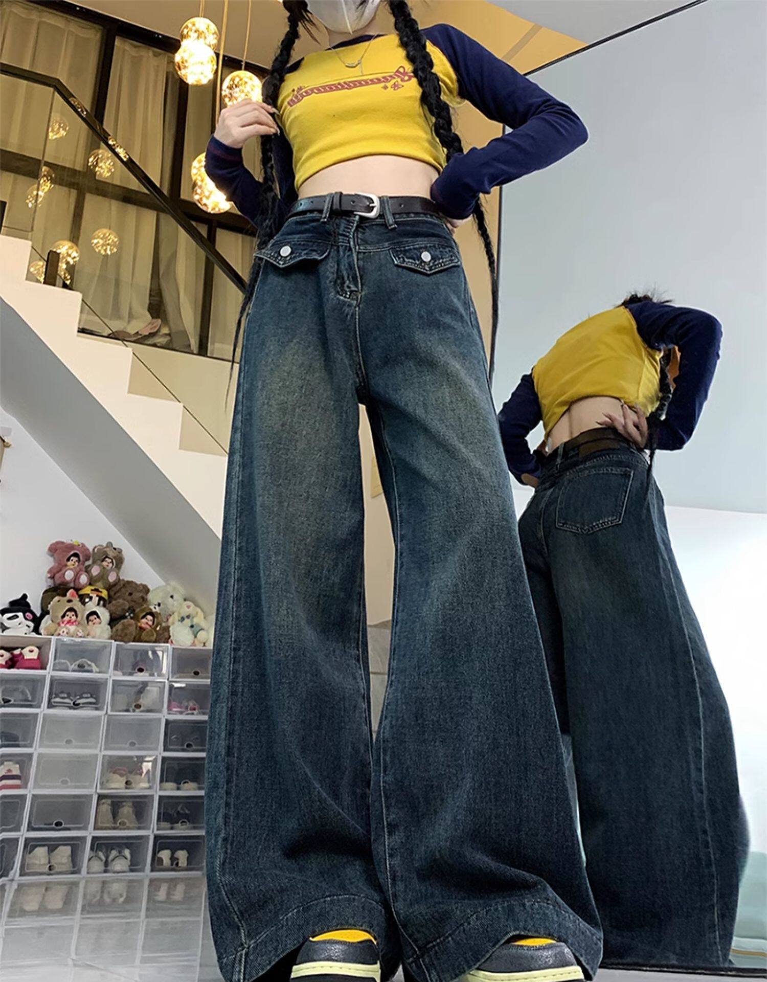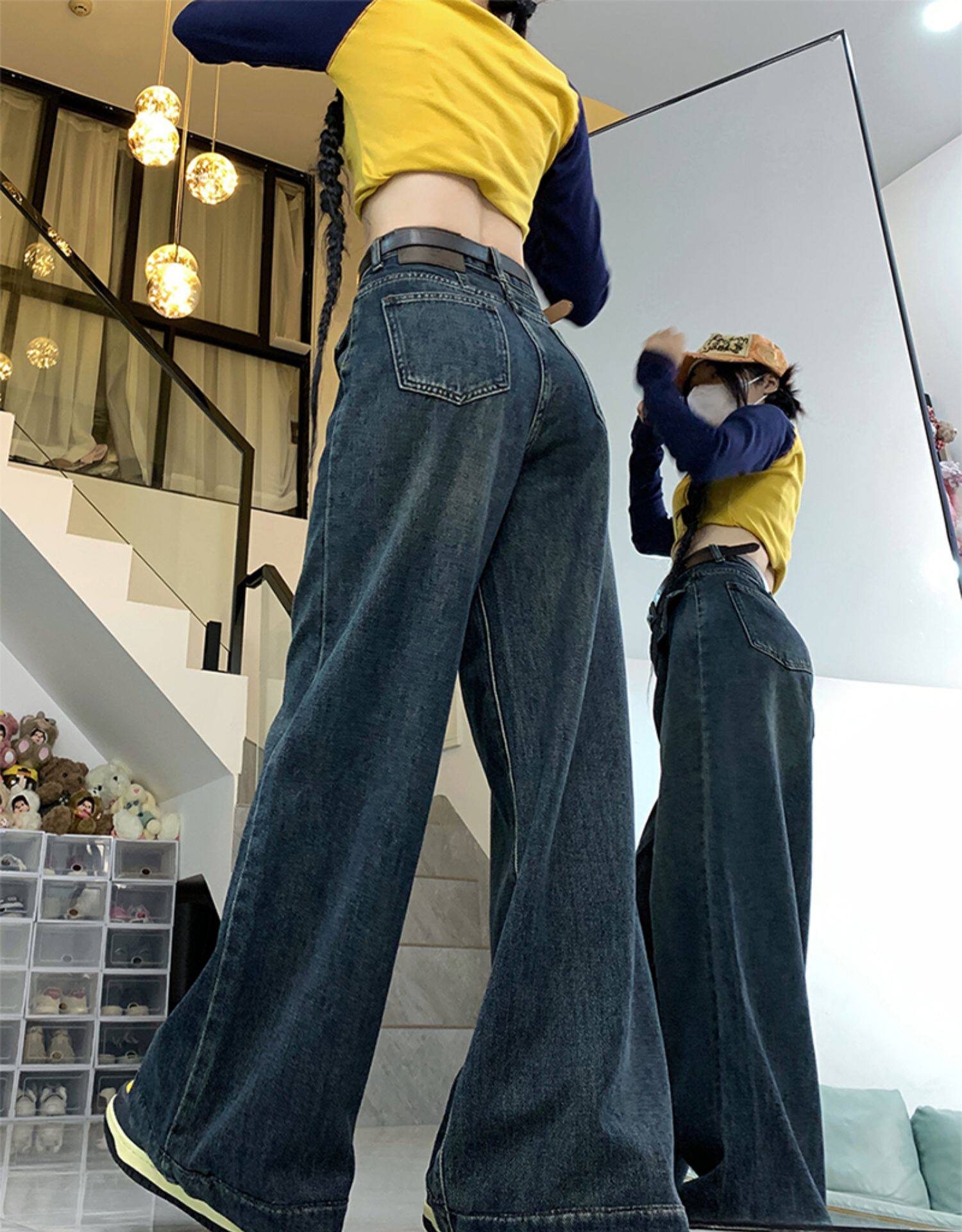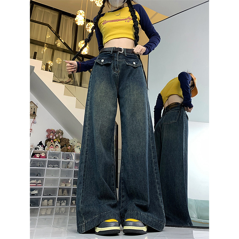 Джинсы, летние штаны, размер, в американском стиле, высокая талия, свободный прямой крой