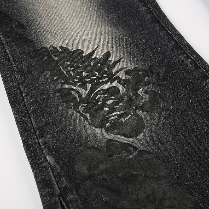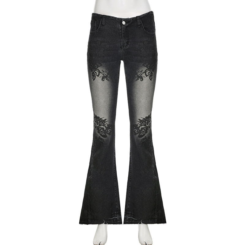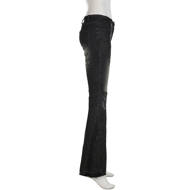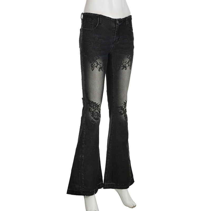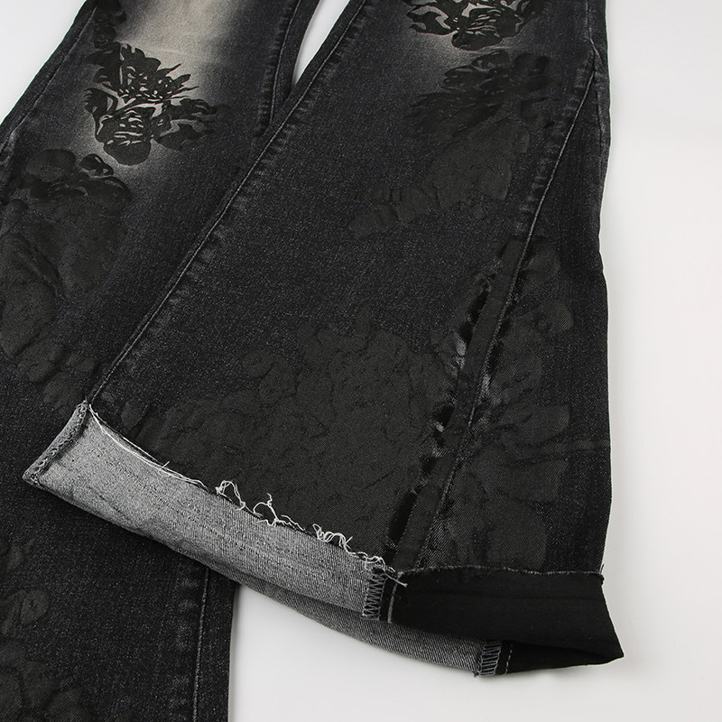 ROCKMORE [Yabi Retrospective] модные узкие расклешенные джинсы с заниженной талией и винтажным растительным принтом