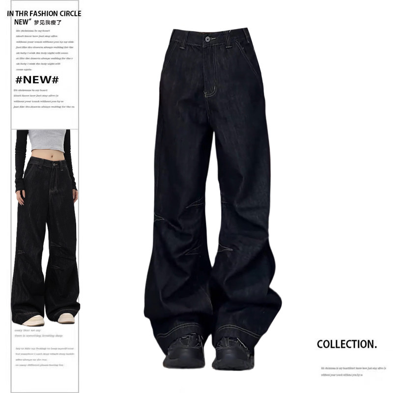 Ретро демисезонные черные джинсы, штаны, большой размер, в американском стиле, свободный прямой крой