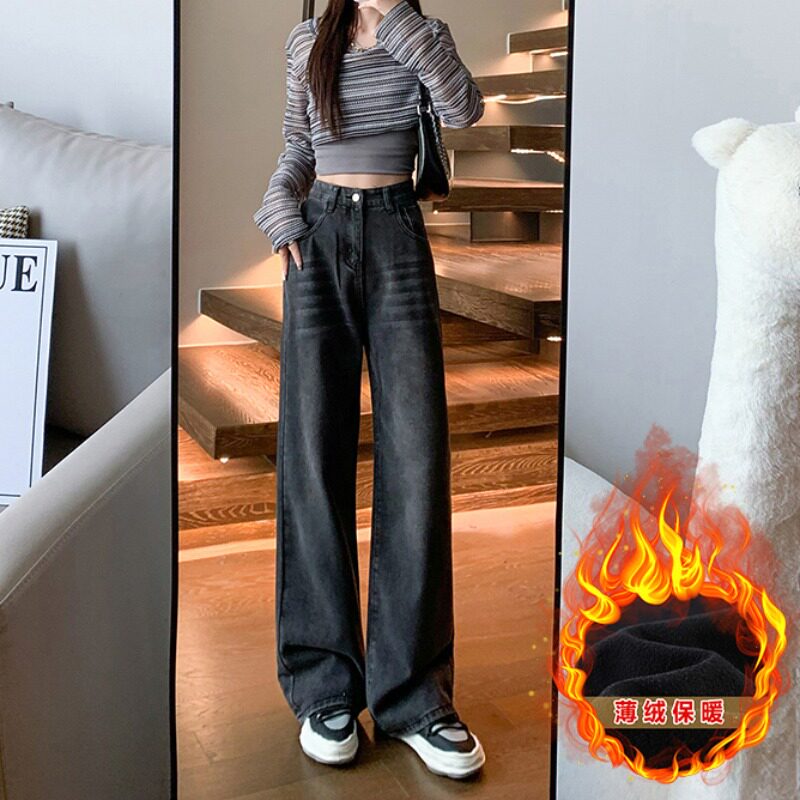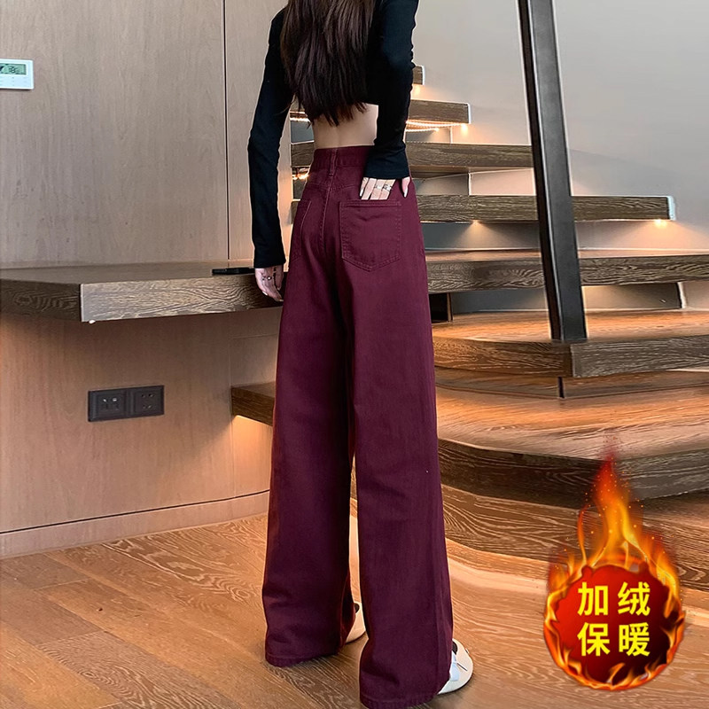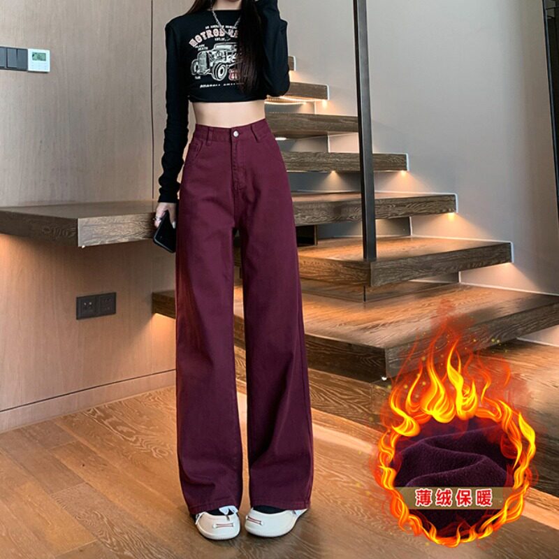 Ретро красные флисовые демисезонные джинсы с начесом, штаны, приталенные леггинсы, для формы тела «груша», свободный прямой крой
