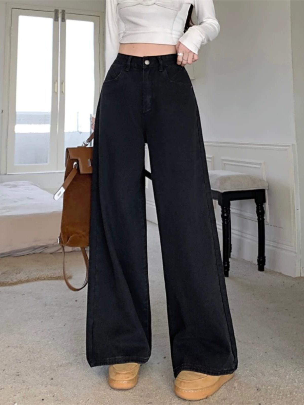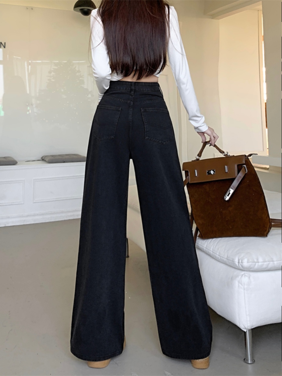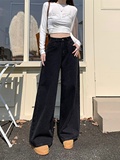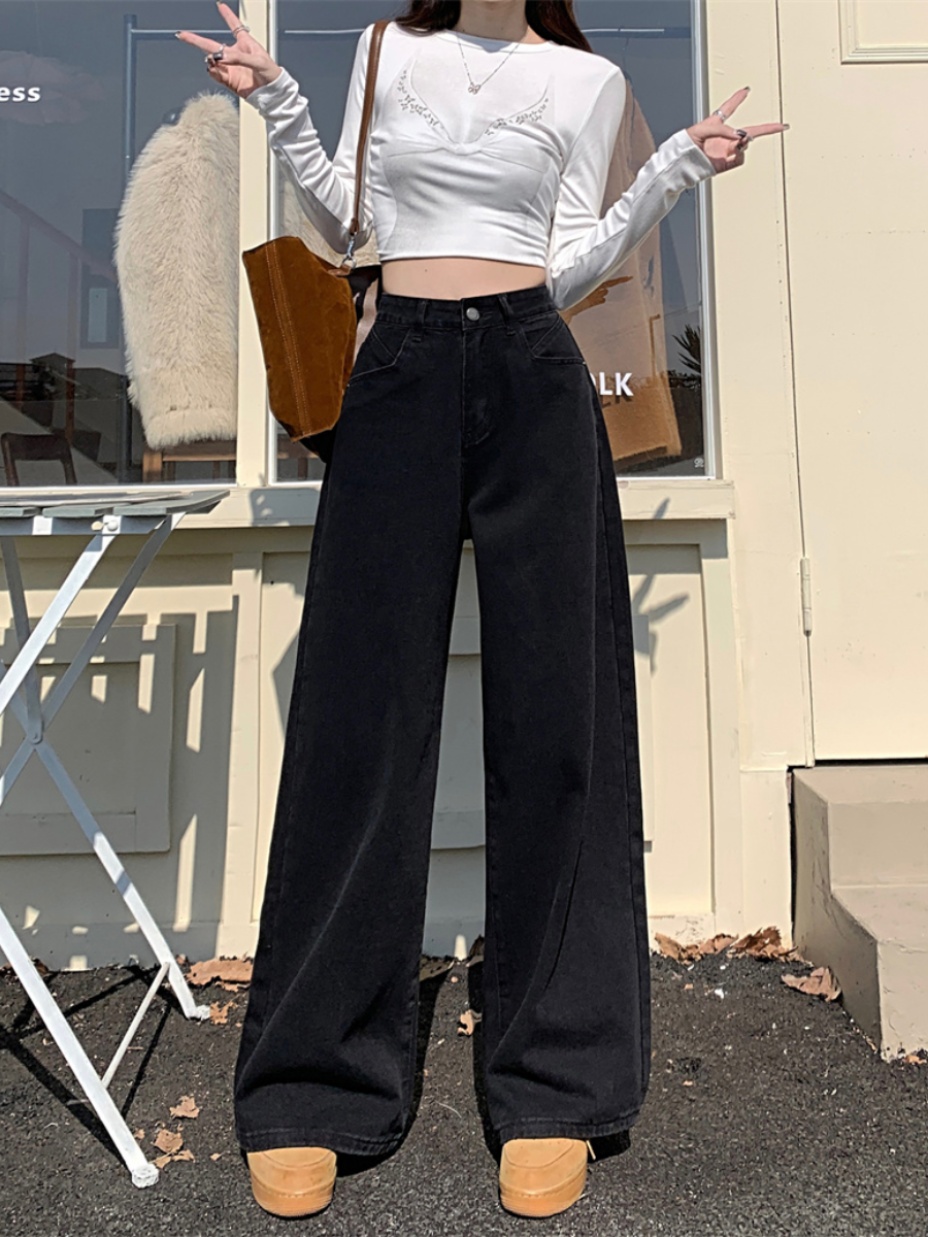 Ретро черные джинсовые весенние приталенные штаны, в американском стиле, высокая талия, свободный прямой крой