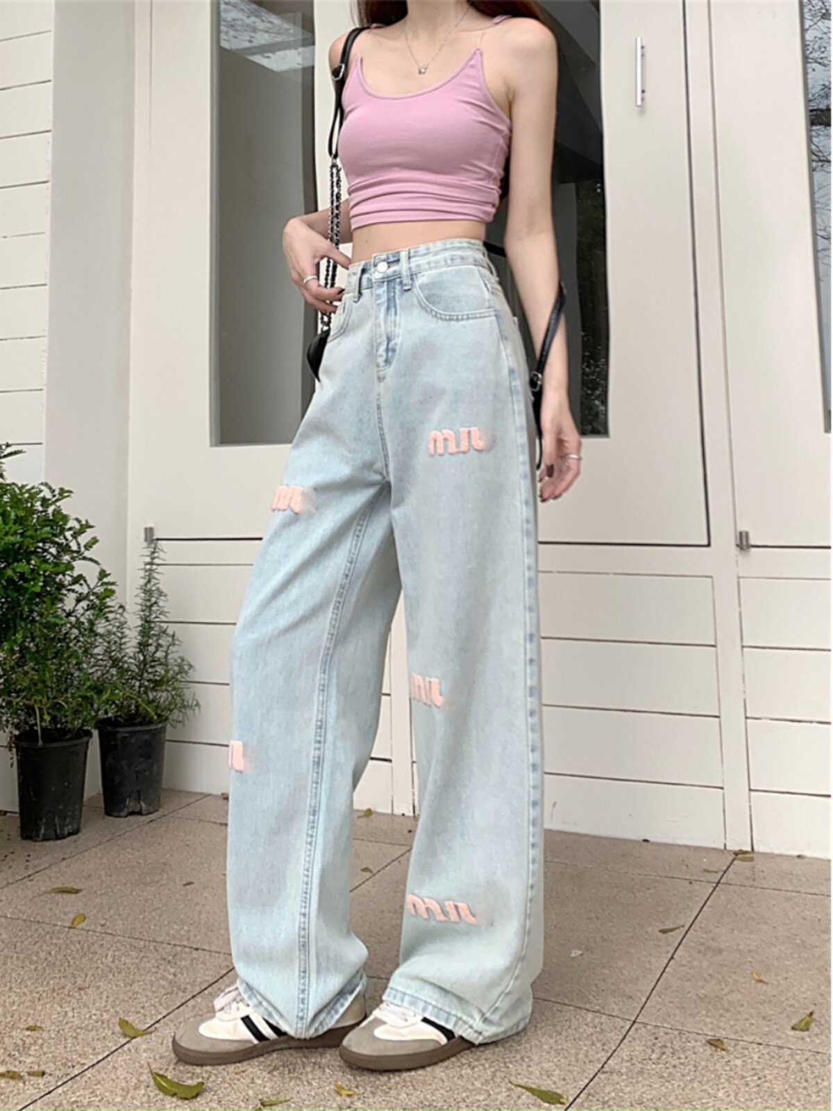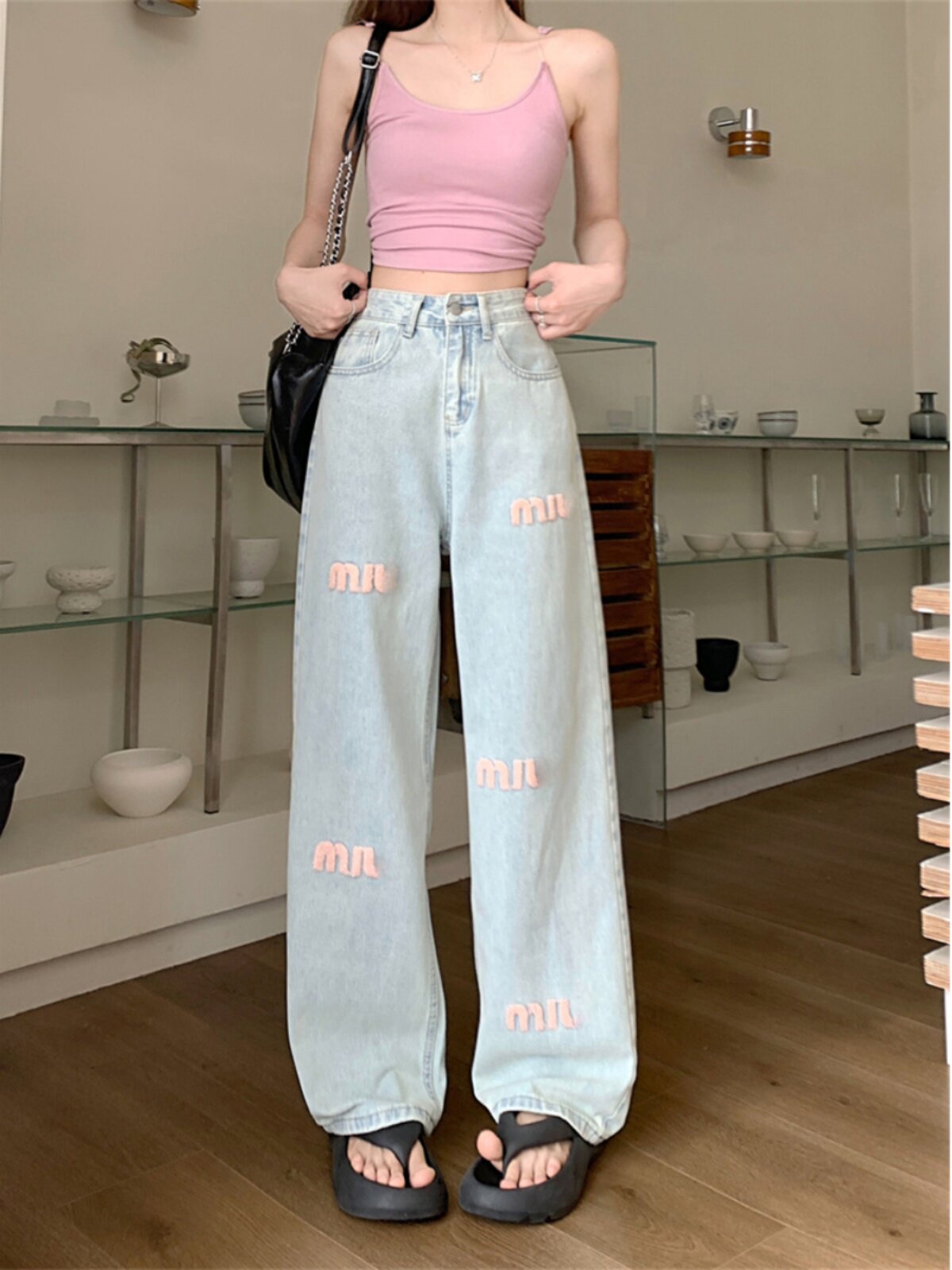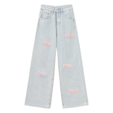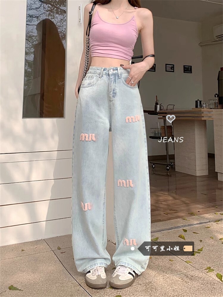 Светлые весенние джинсы, штаны, с вышивкой, свободный прямой крой, высокая талия