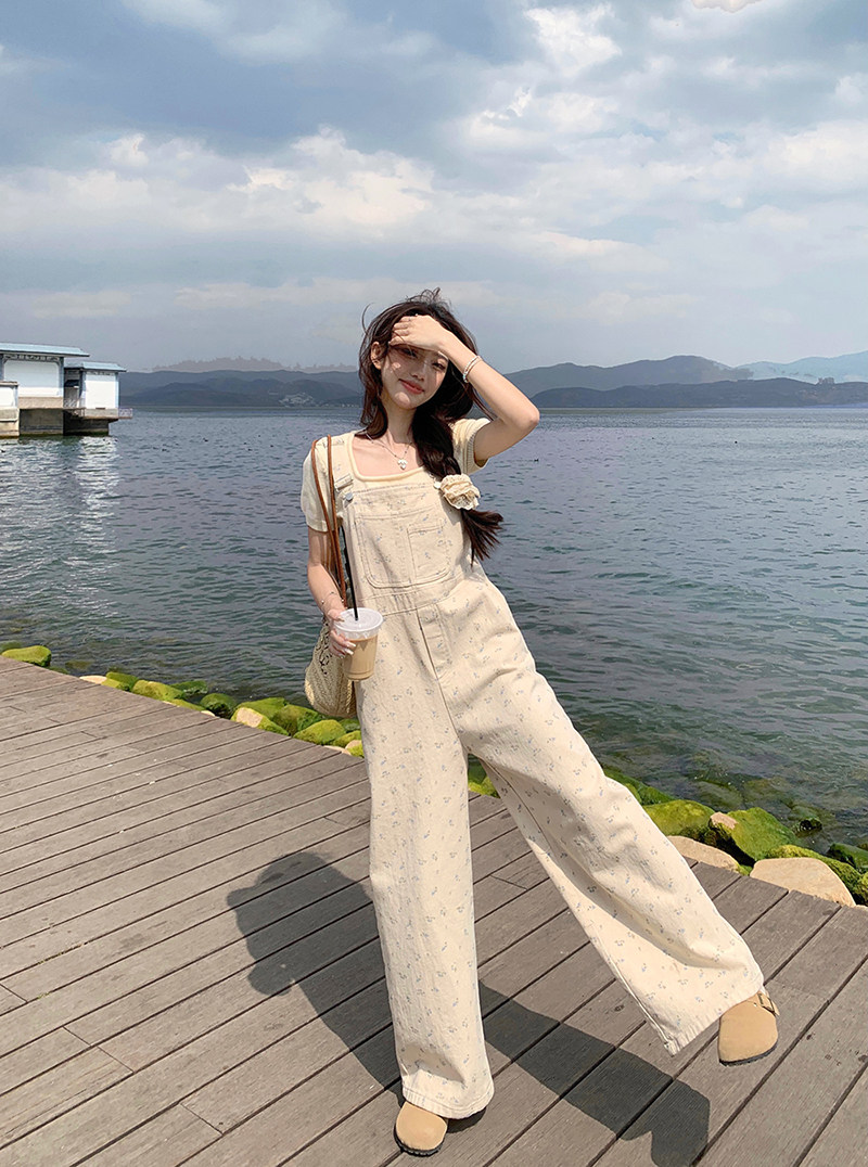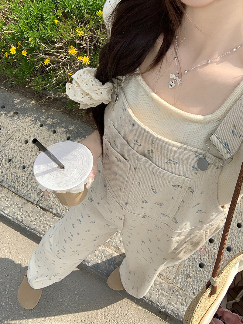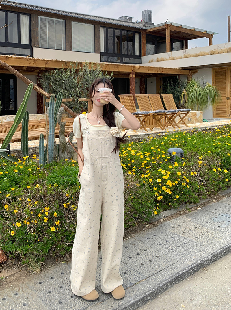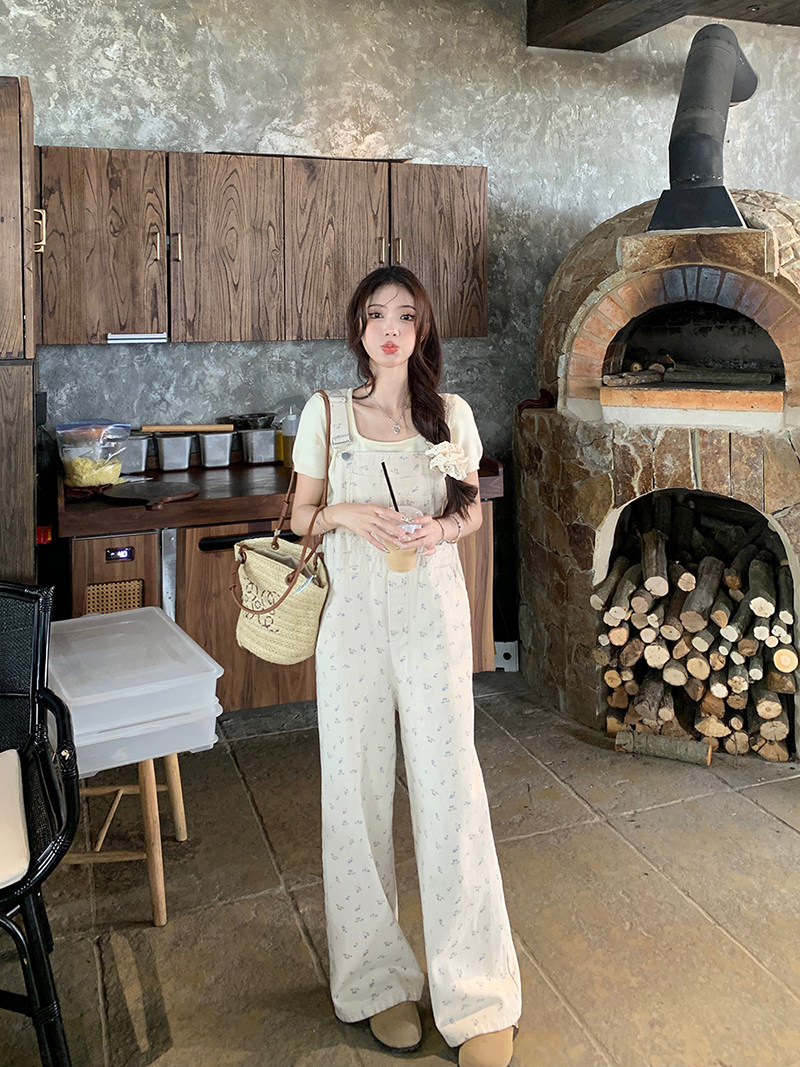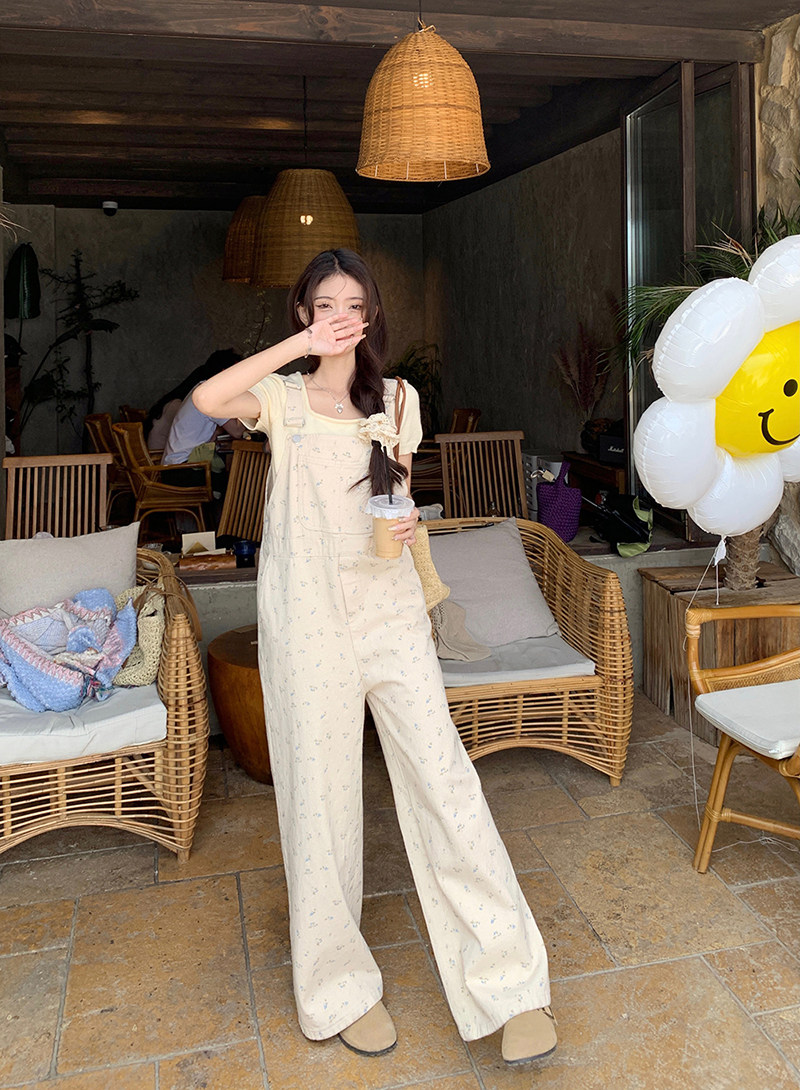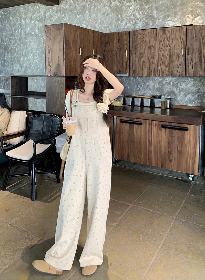 Джинсовый весенний комбинезон, летние дизайнерские штаны для отдыха, цветочный принт, тренд сезона, свободный прямой крой, высокая талия, оверсайз