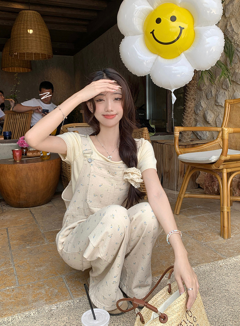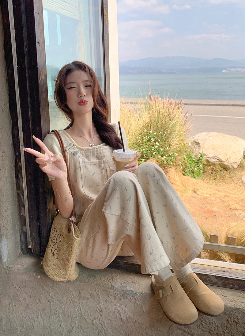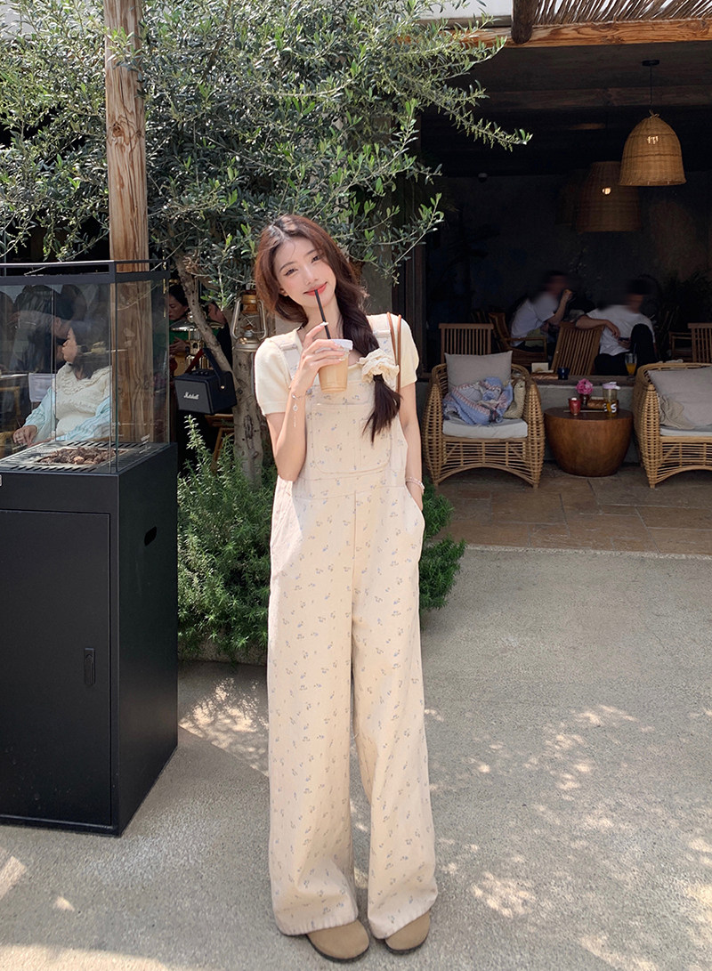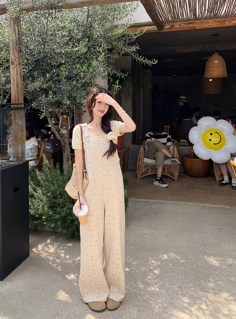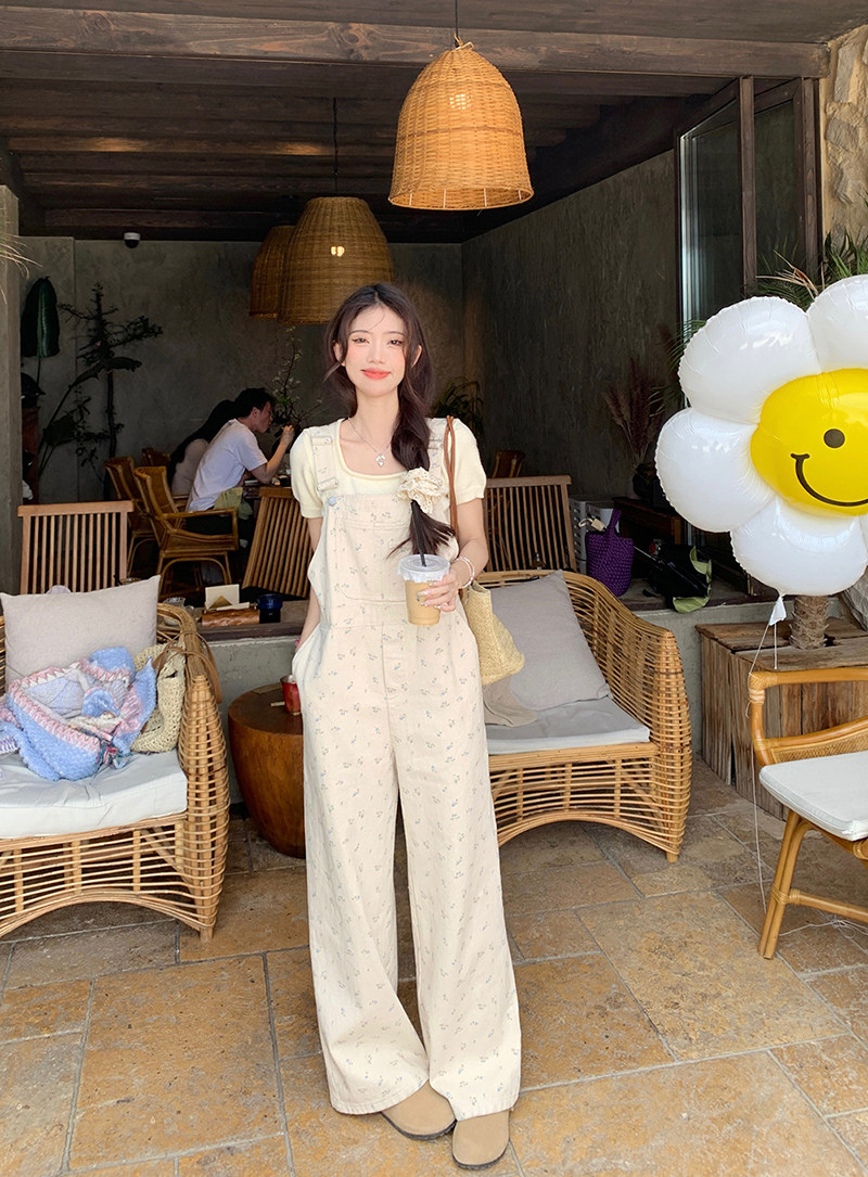Джинсовый весенний комбинезон, летние дизайнерские штаны для отдыха, цветочный принт, тренд сезона, свободный прямой крой, высокая талия, оверсайз