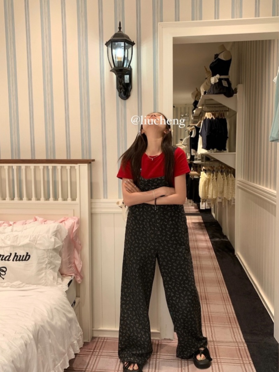 Свежие подтяжки, джинсы, штаны, цветочный принт, свободный прямой крой