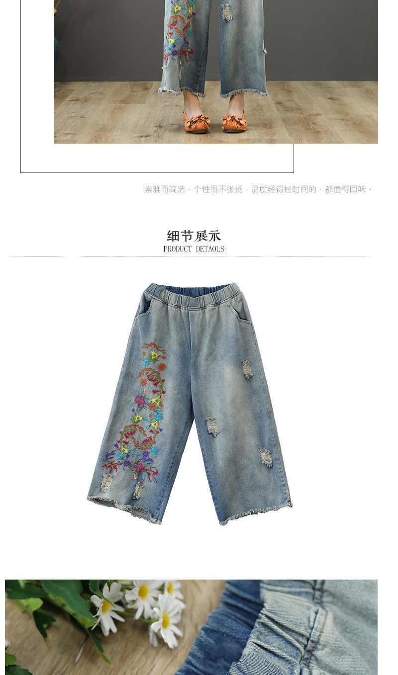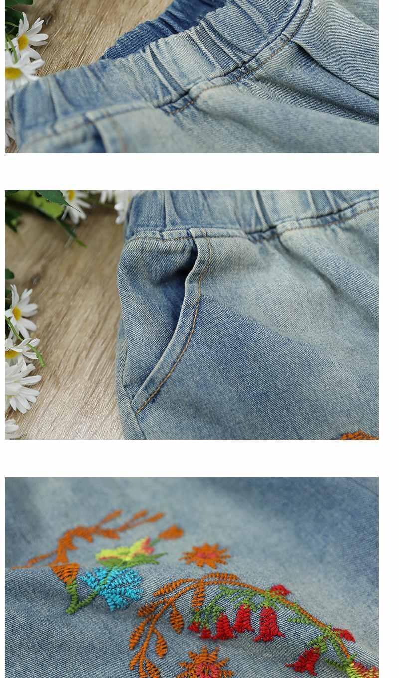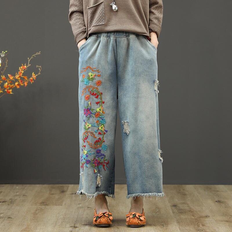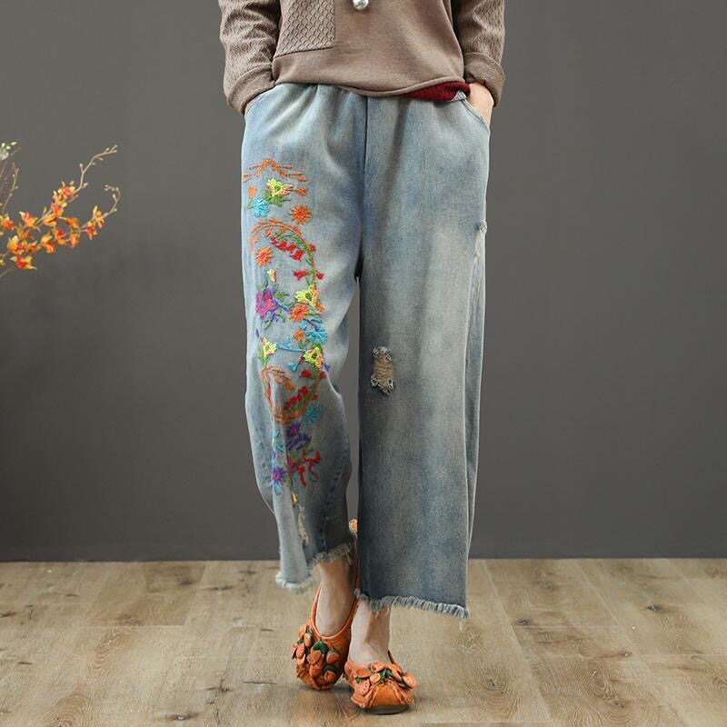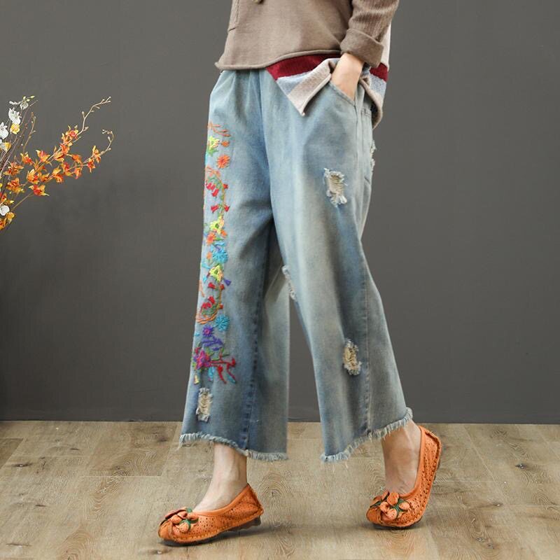 Летние джинсовые ретро штаны, оверсайз, эластичная талия, с вышивкой