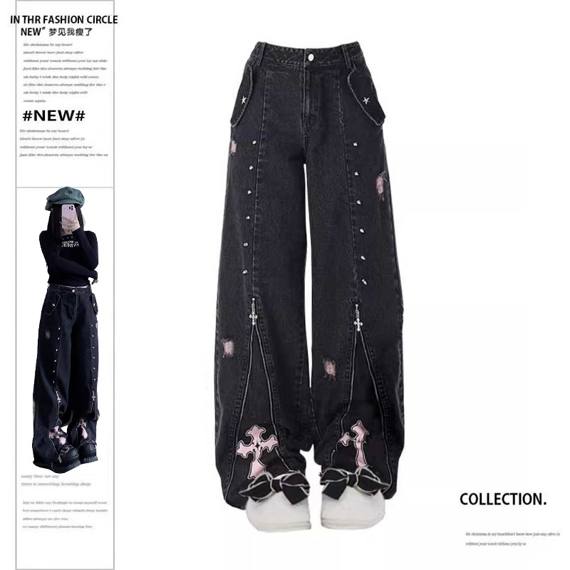 Штаны, прямые свободные джинсы с молнией, большой размер, в стиле панк, в американском стиле, высокая талия