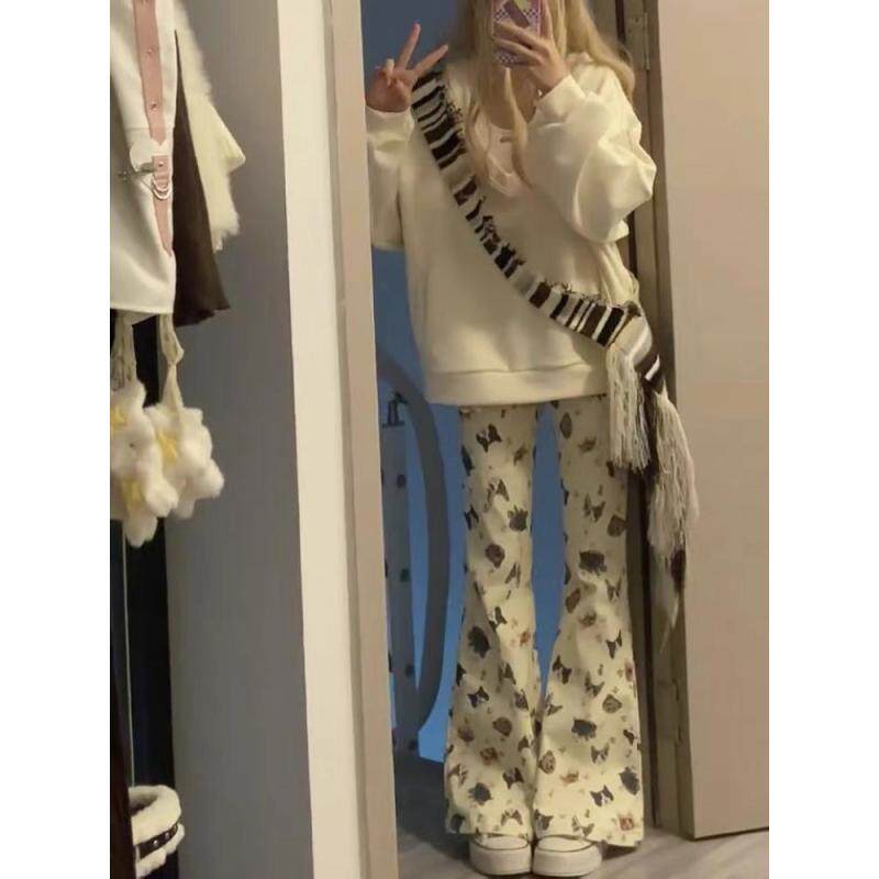Демисезонные штаны, штаны-клёш, в американском стиле, ручная роспись, граффити, по фигуре, свободный прямой крой, высокая талия