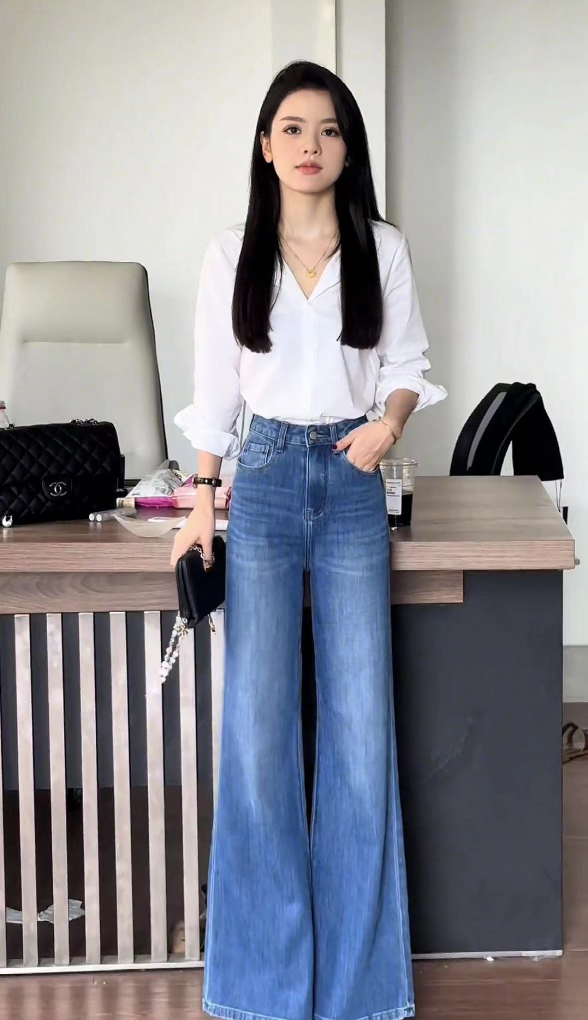 Синий мегафон, модные джинсы, штаны, в корейском стиле, высокая талия
