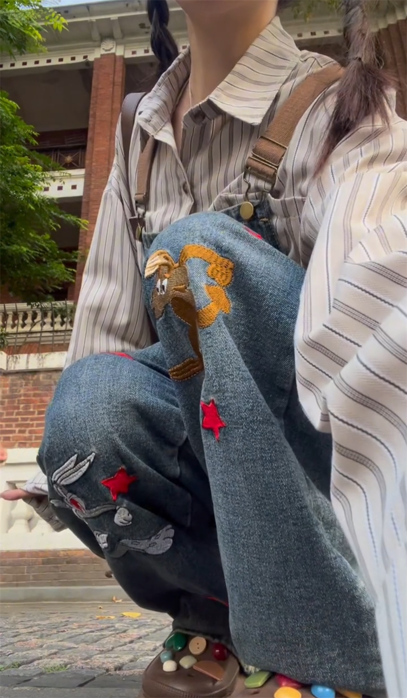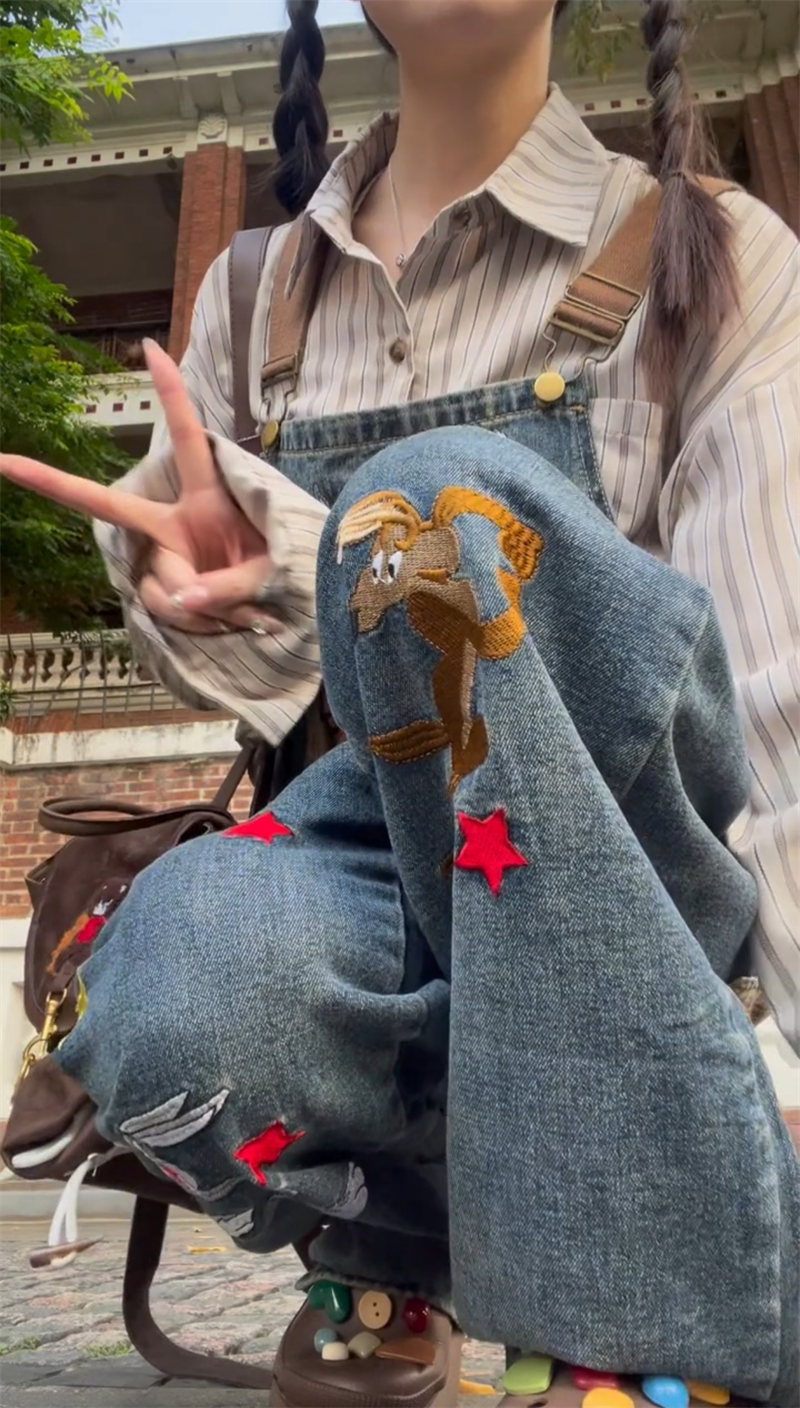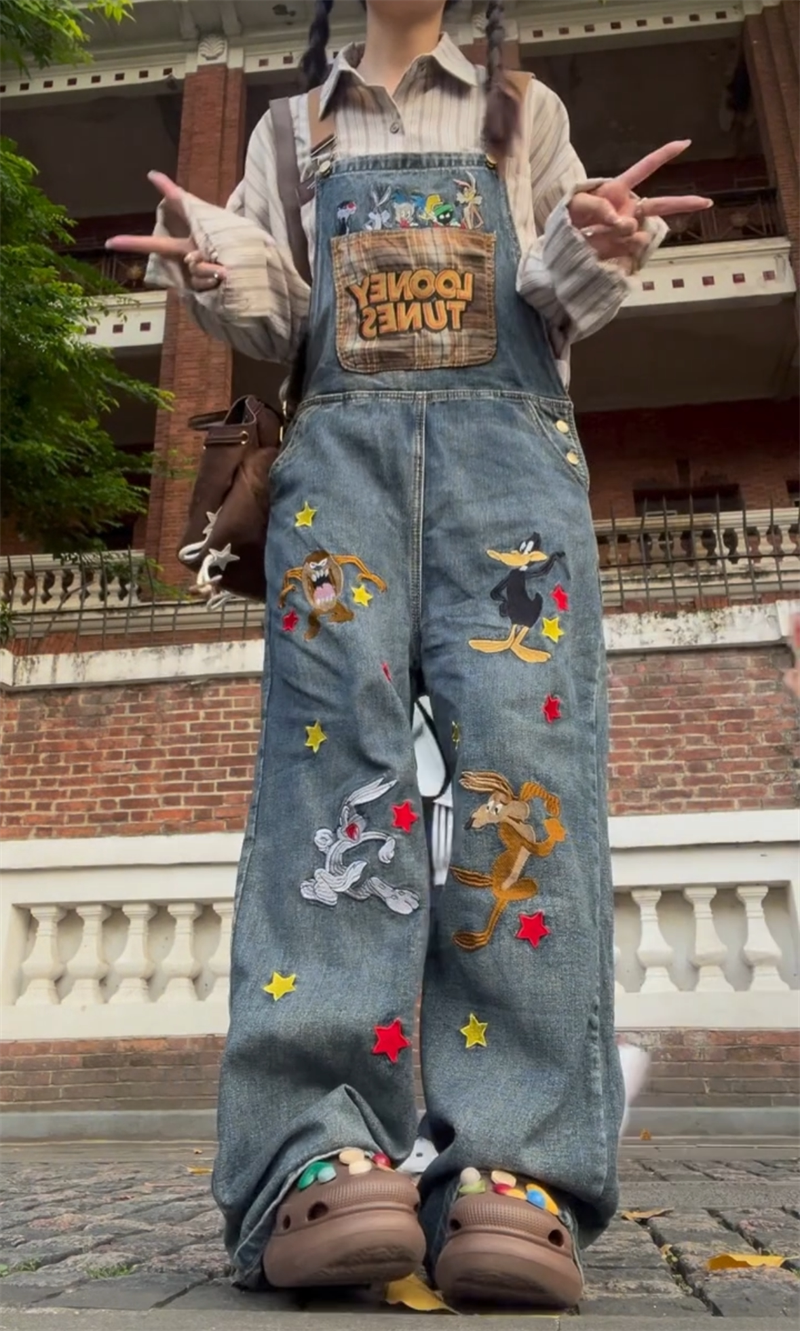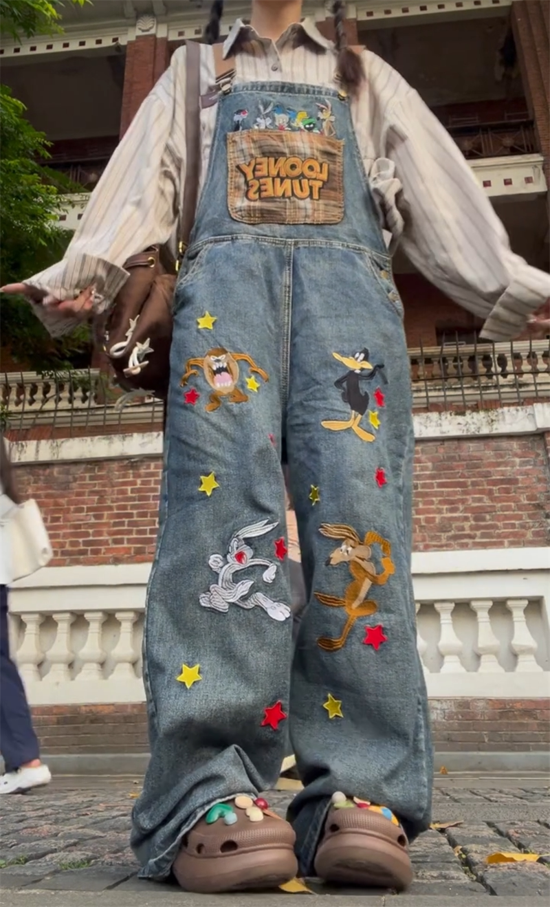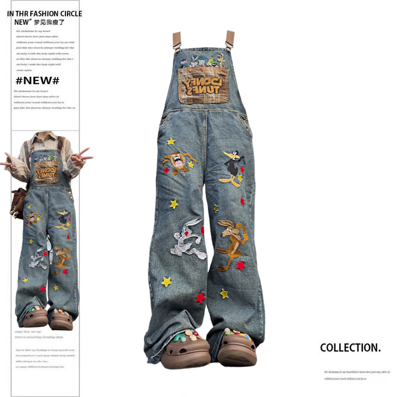 Ретро мультяшный джинсовый демисезонный комбинезон, демисезонные леггинсы, большой размер, в американском стиле, с вышивкой, свободный крой