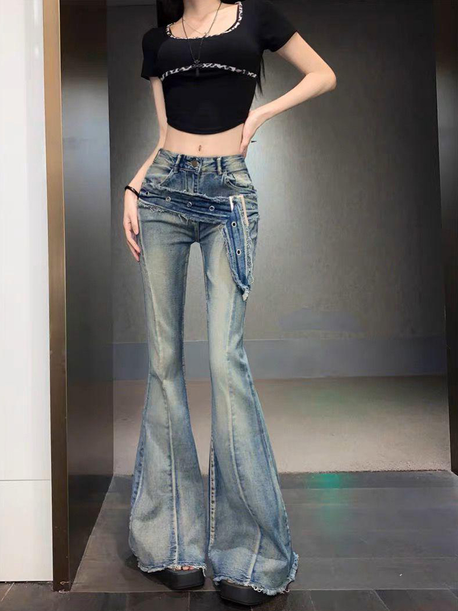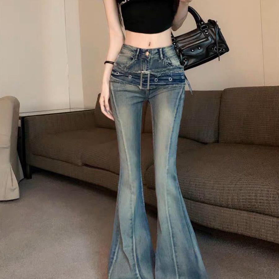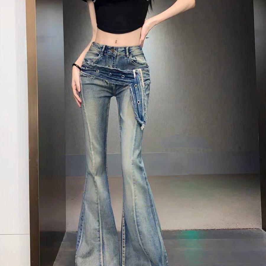 Джинсы, ремень, дизайнерский мегафон, демисезонные штаны, приталенные леггинсы, в американском стиле, высокая талия