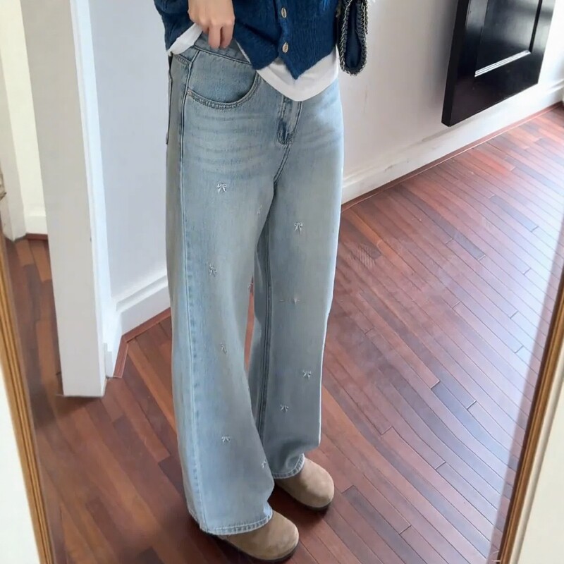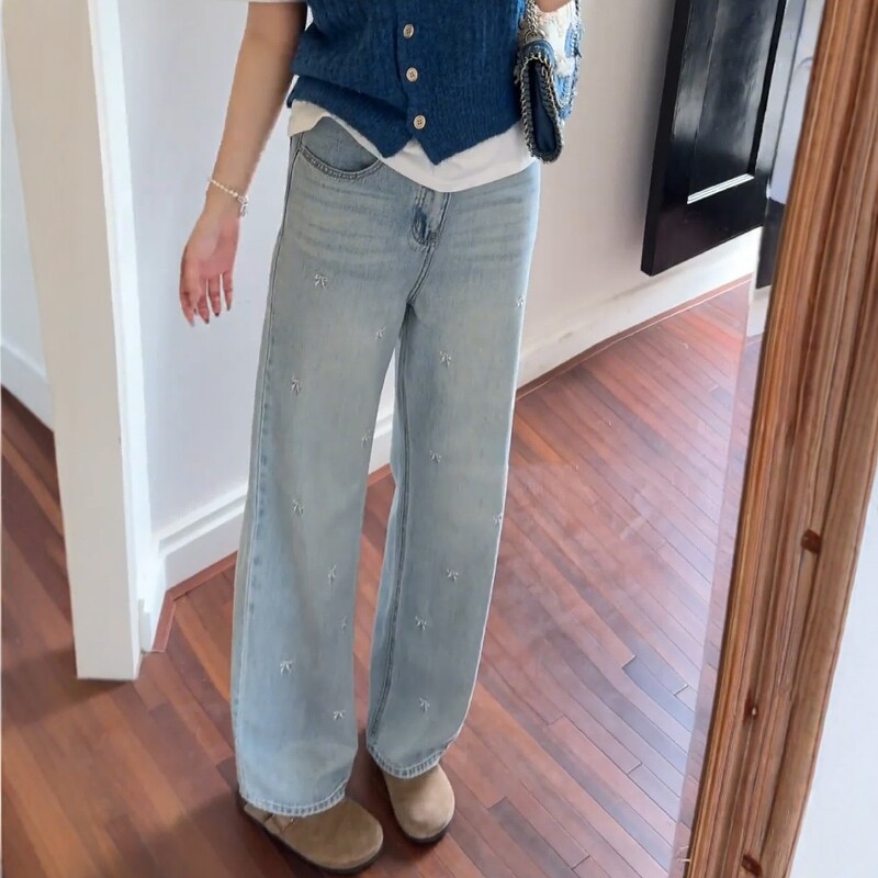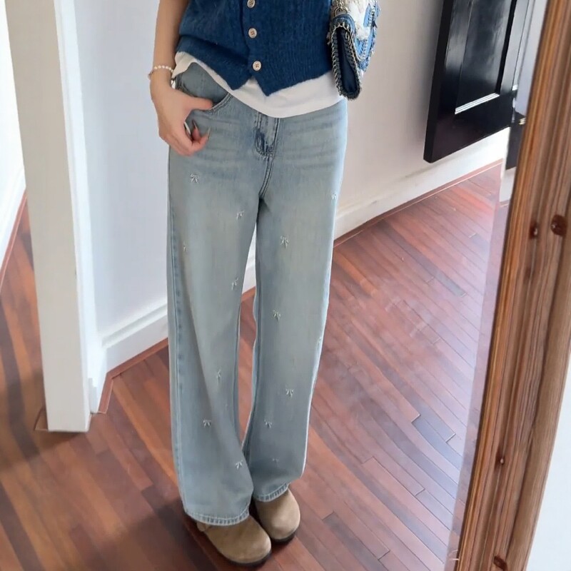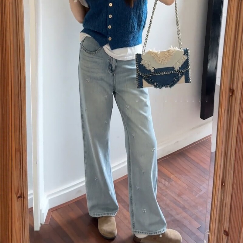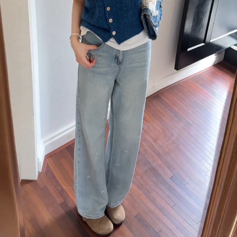 Летние дизайнерские джинсы, штаны, большой размер, высокая талия, с вышивкой, тренд сезона, свободный прямой крой