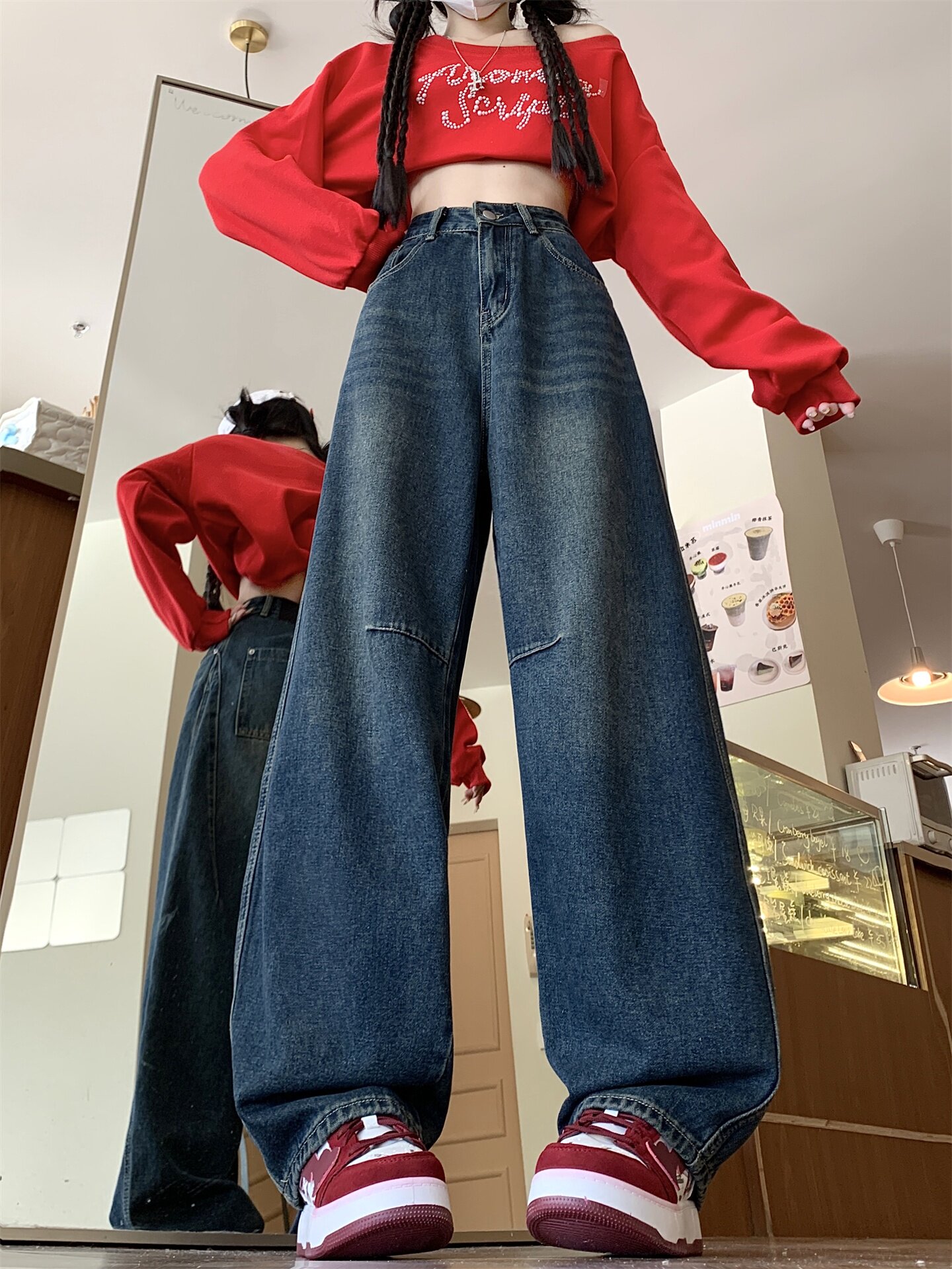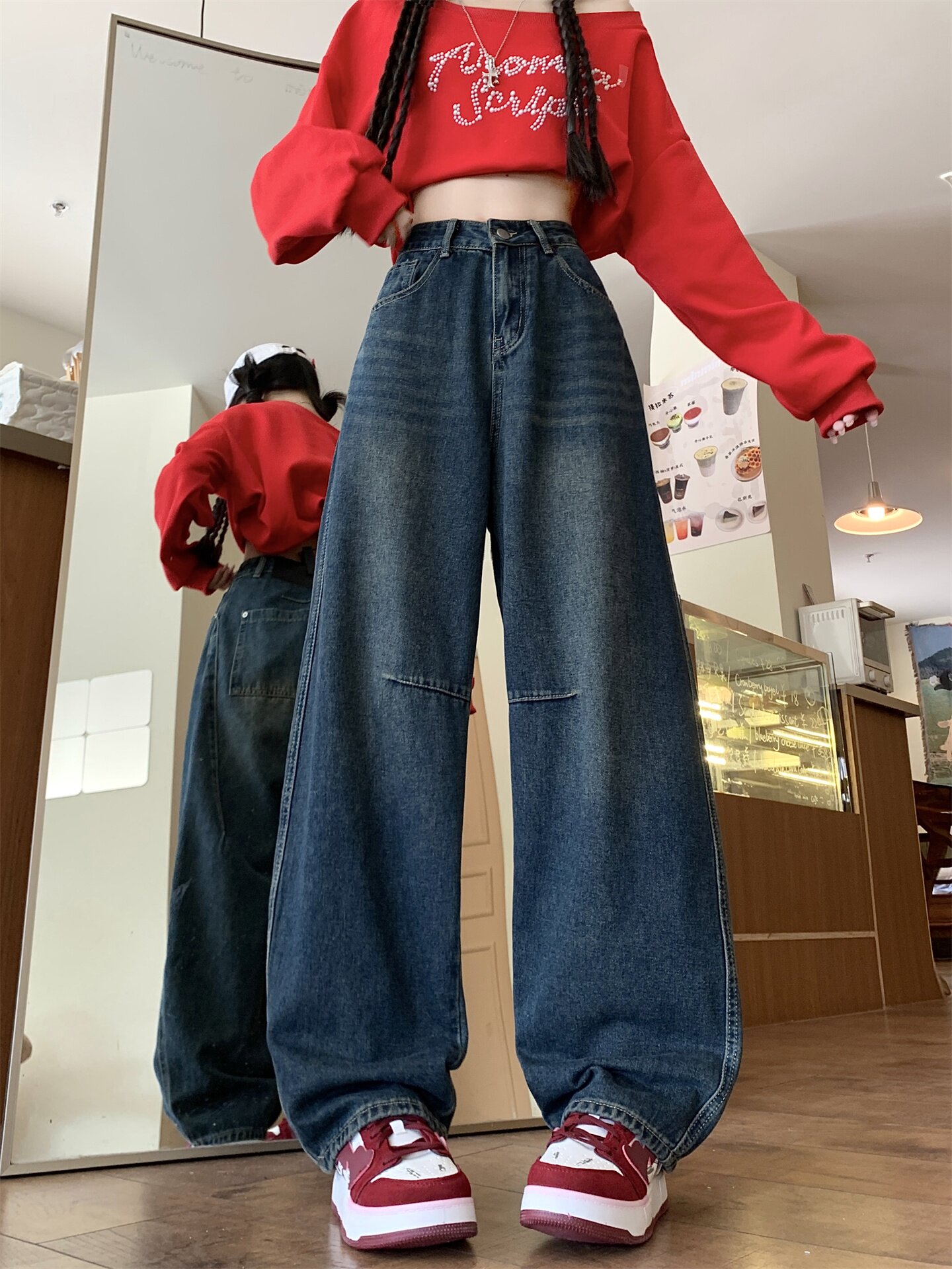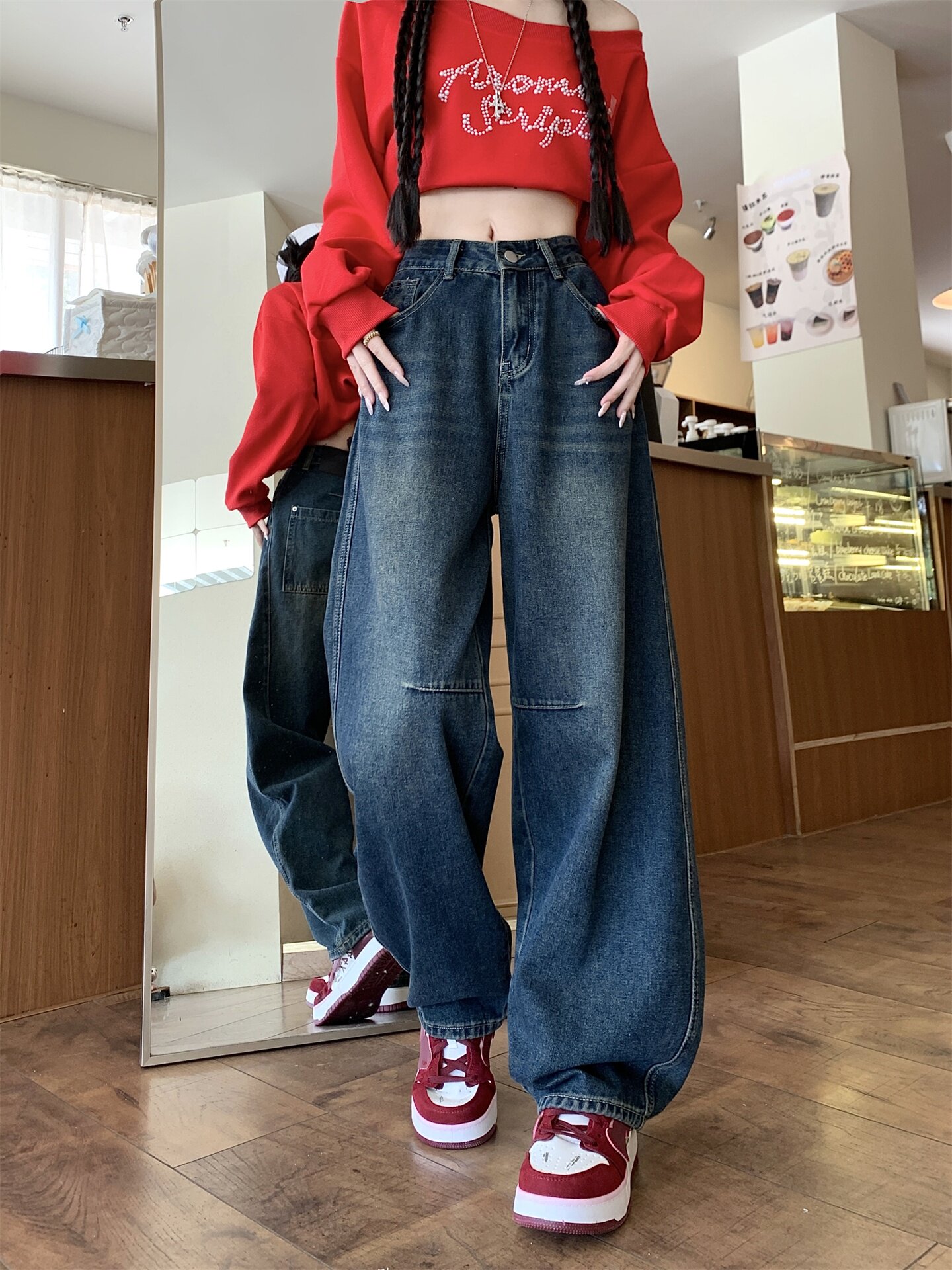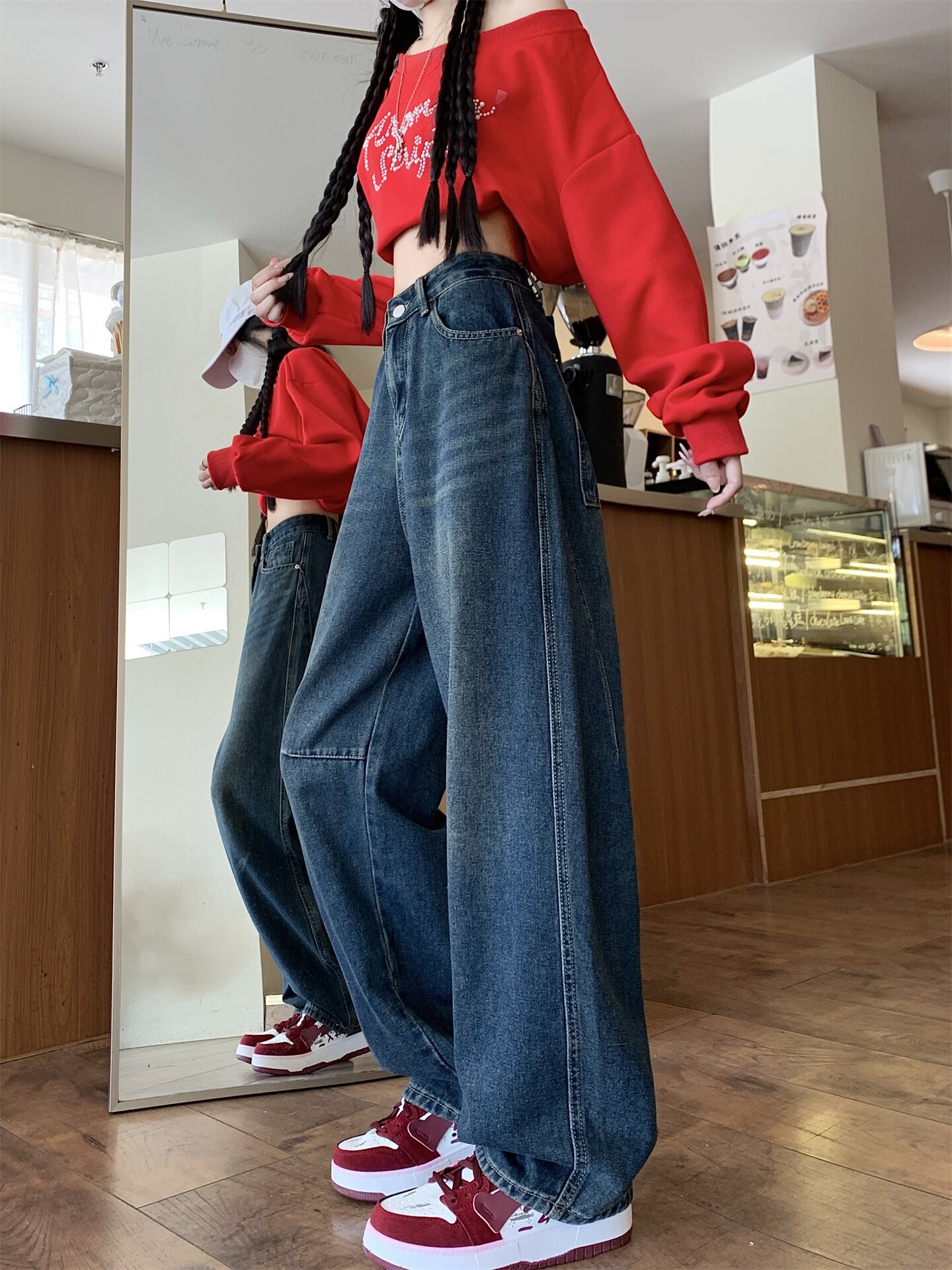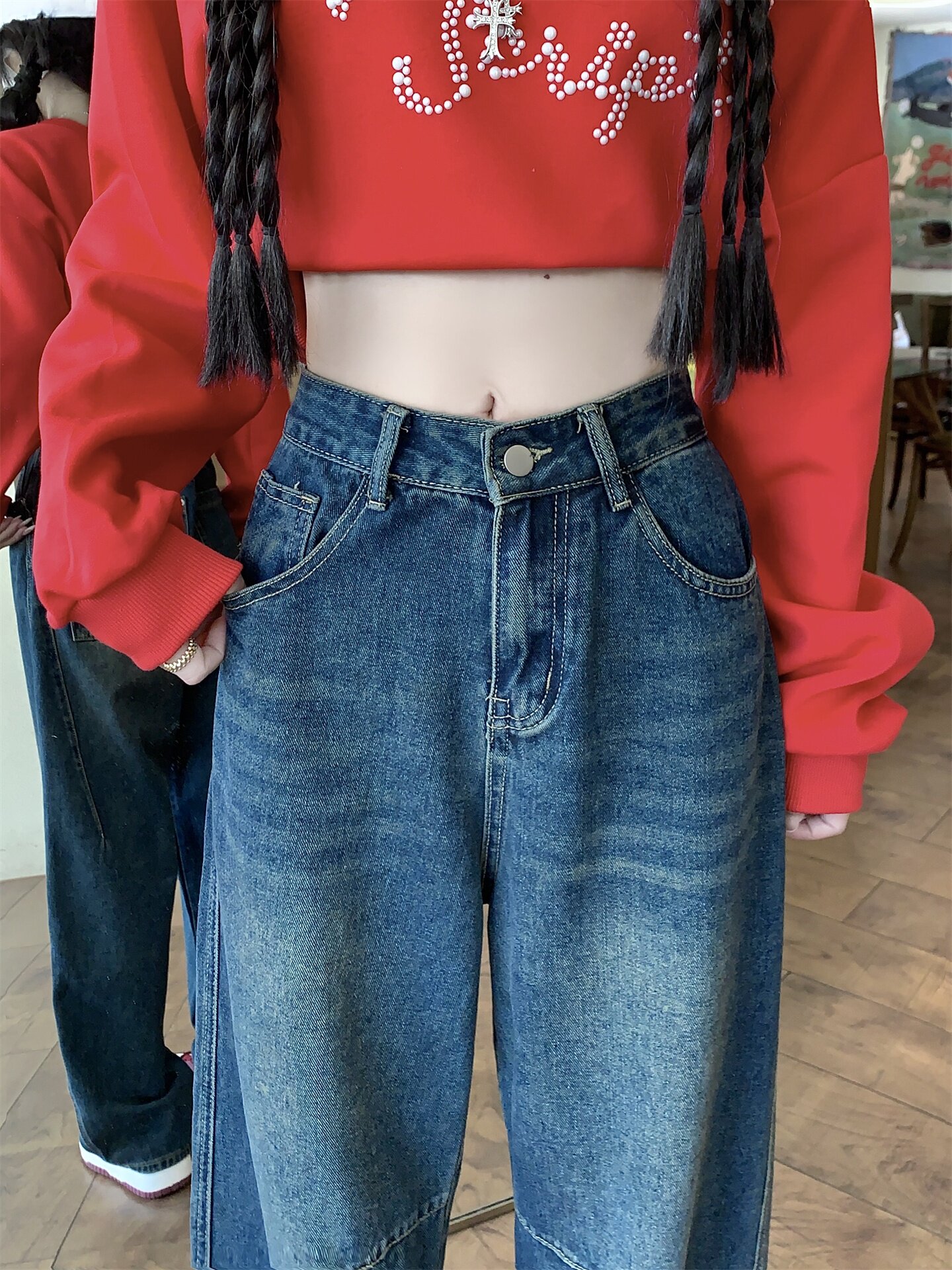 Ретро осенние джинсы, штаны, леггинсы, большой размер, в американском стиле, для формы тела «груша», свободный прямой крой