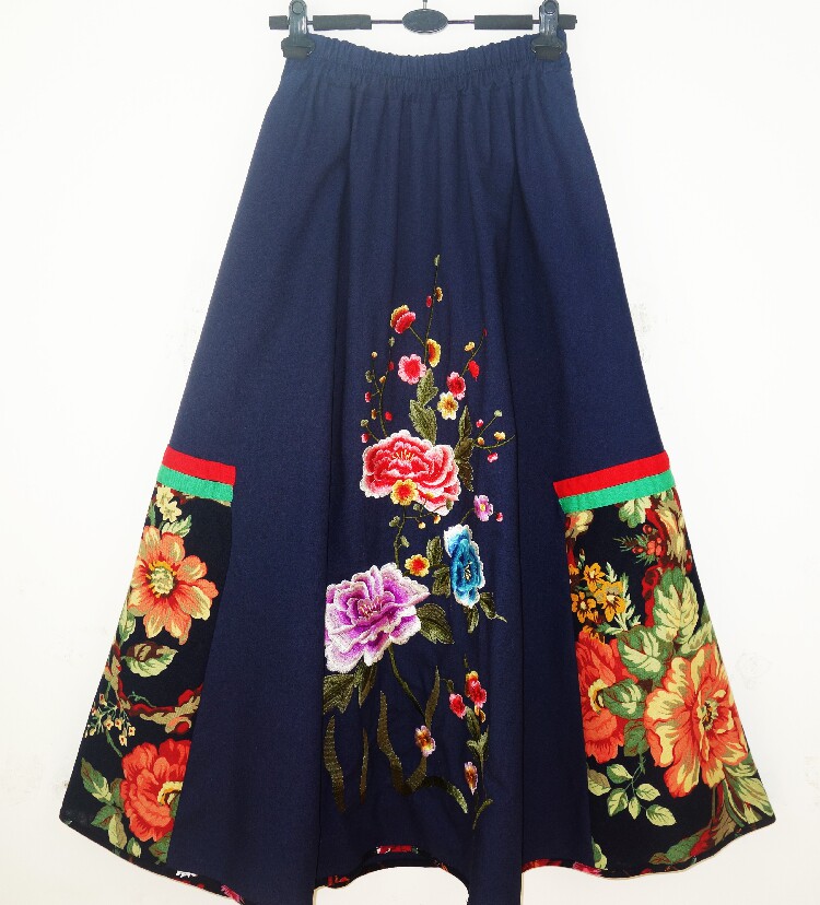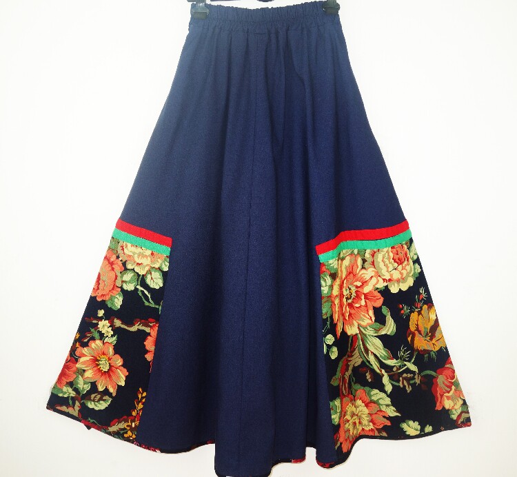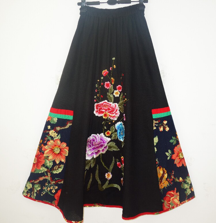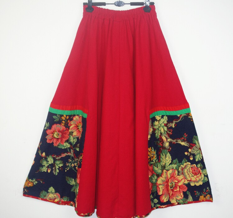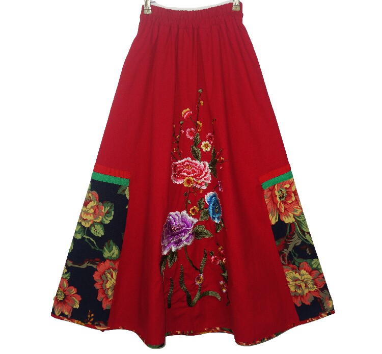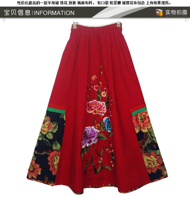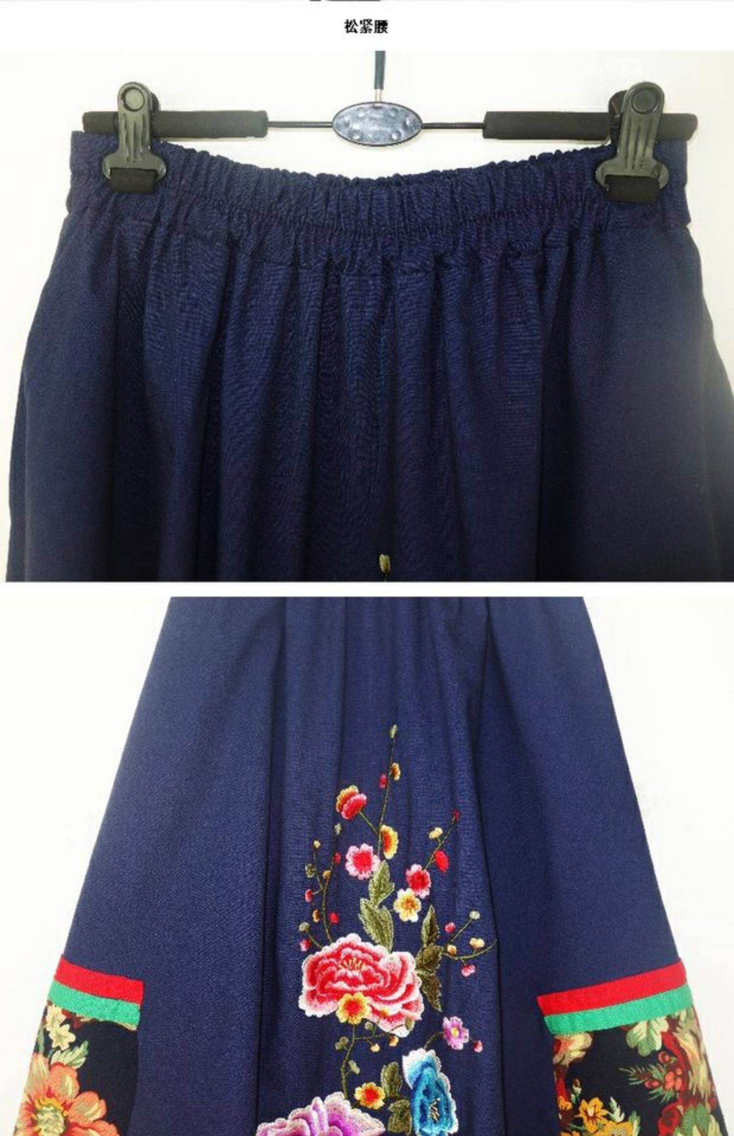 Этническая юбка в складку, приталенная длинная юбка, этнический стиль, с вышивкой, эластичная талия, из хлопка и льна