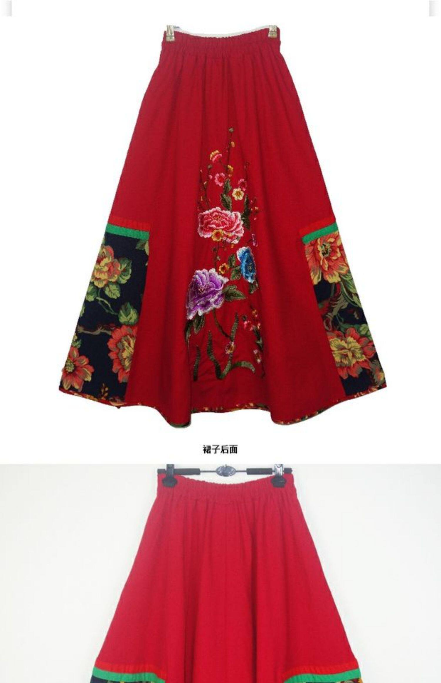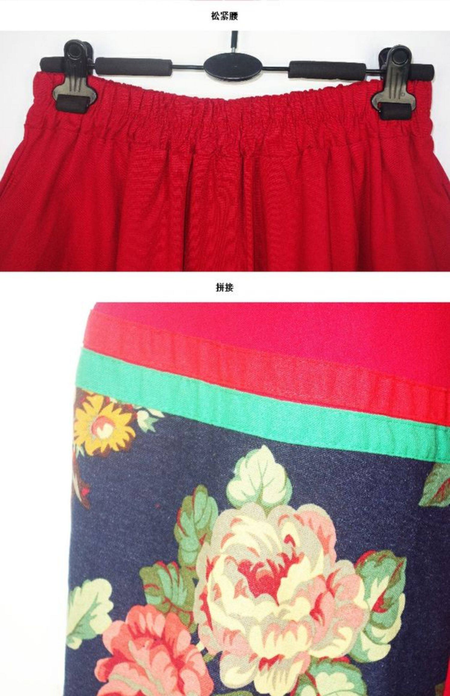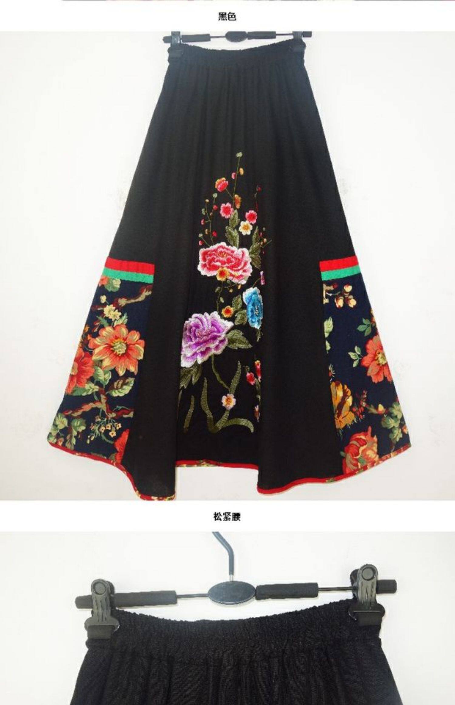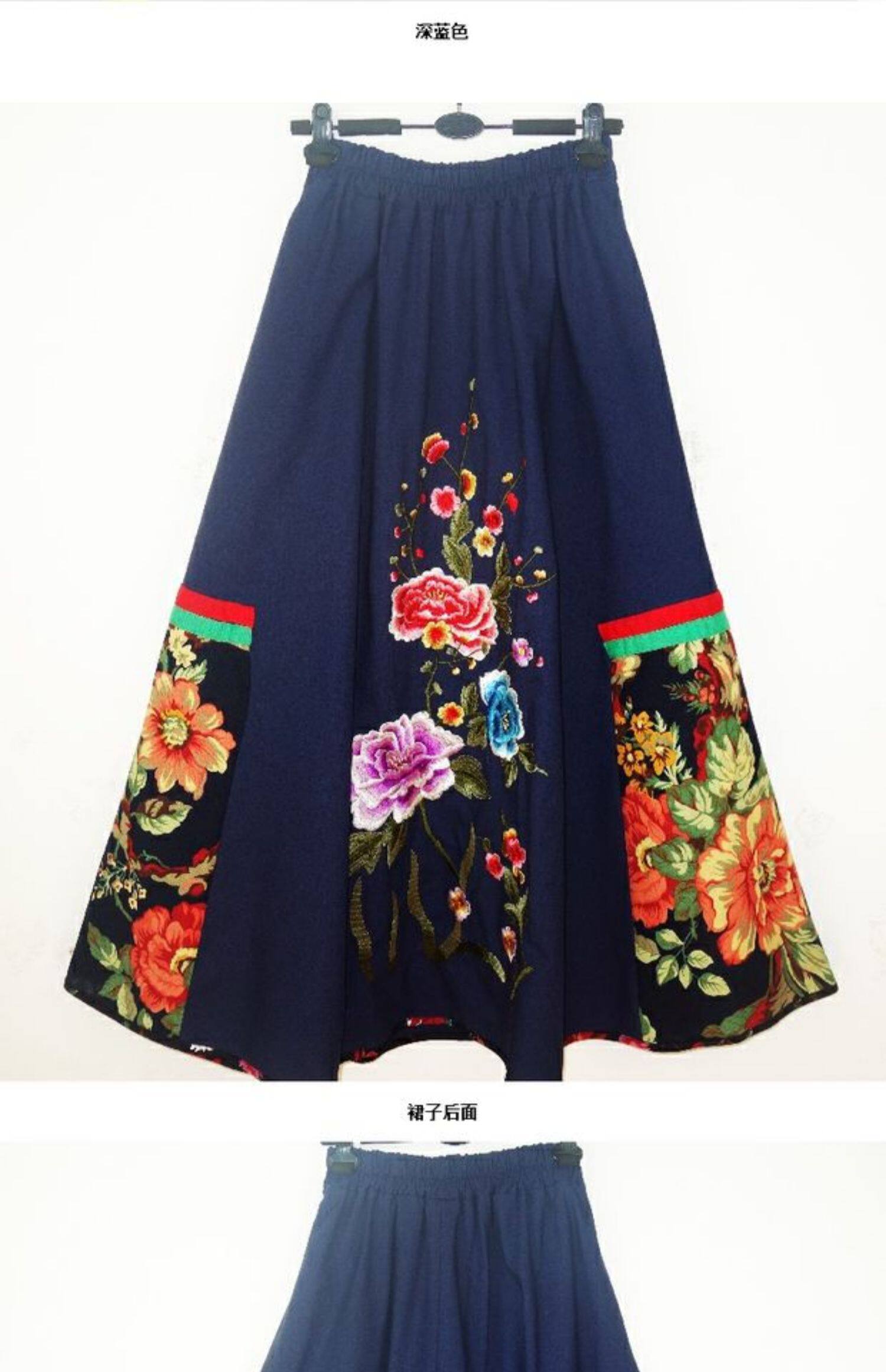Этническая юбка в складку, приталенная длинная юбка, этнический стиль, с вышивкой, эластичная талия, из хлопка и льна