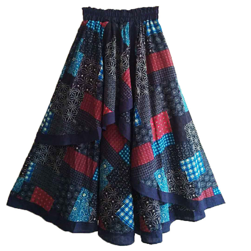 Ретро этническая юбка в складку, весенняя летняя длинная юбка, из хлопка и льна, китайский стиль, этнический стиль, длина макси, эластичная талия