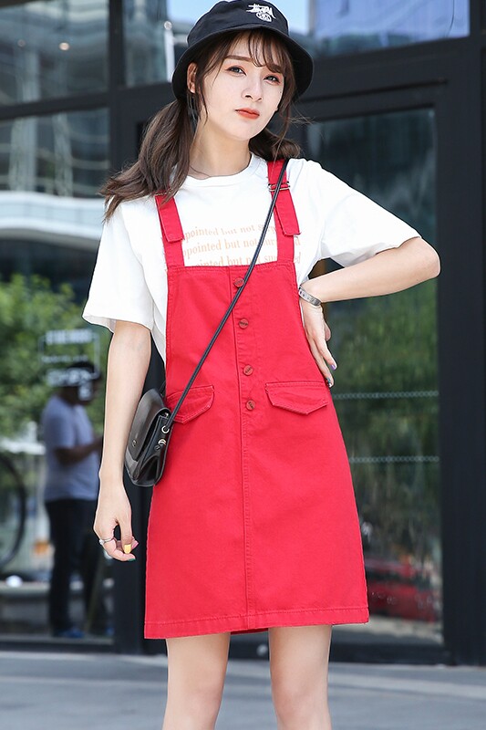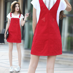 Красное летнее платье, юбка, хлопковый универсальный джинсовый сарафан для школьников, в корейском стиле