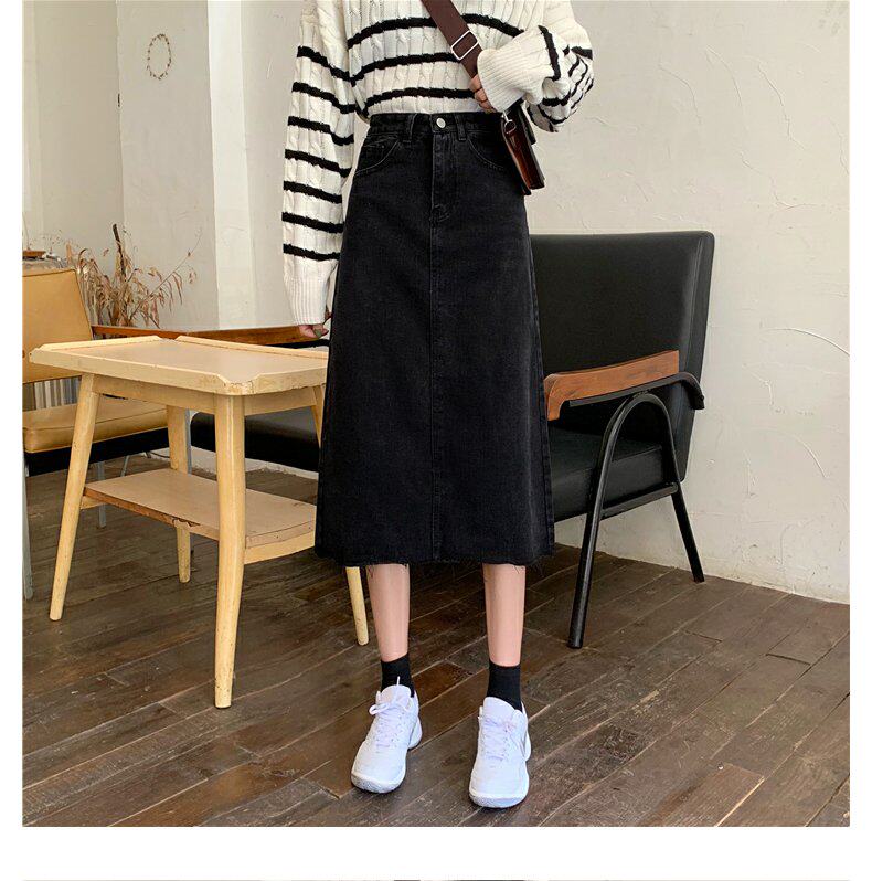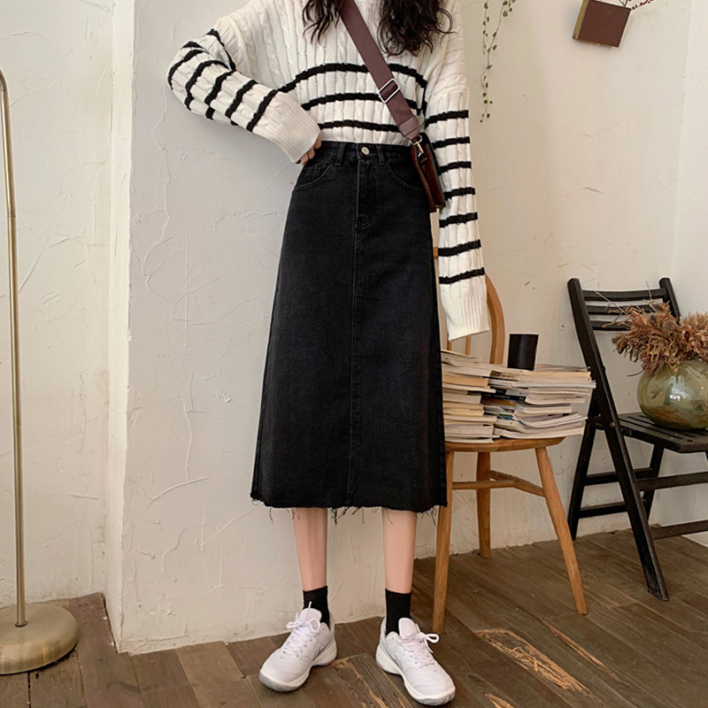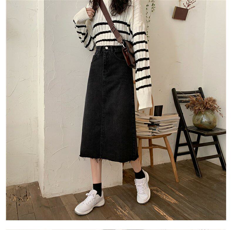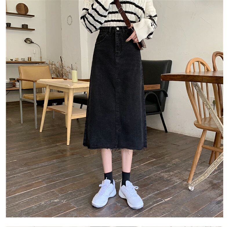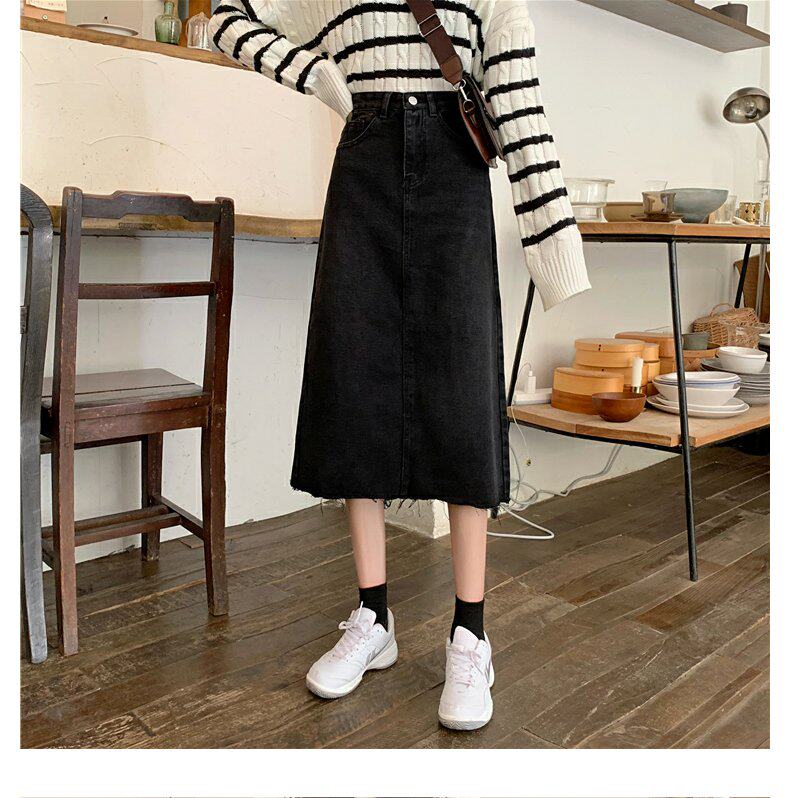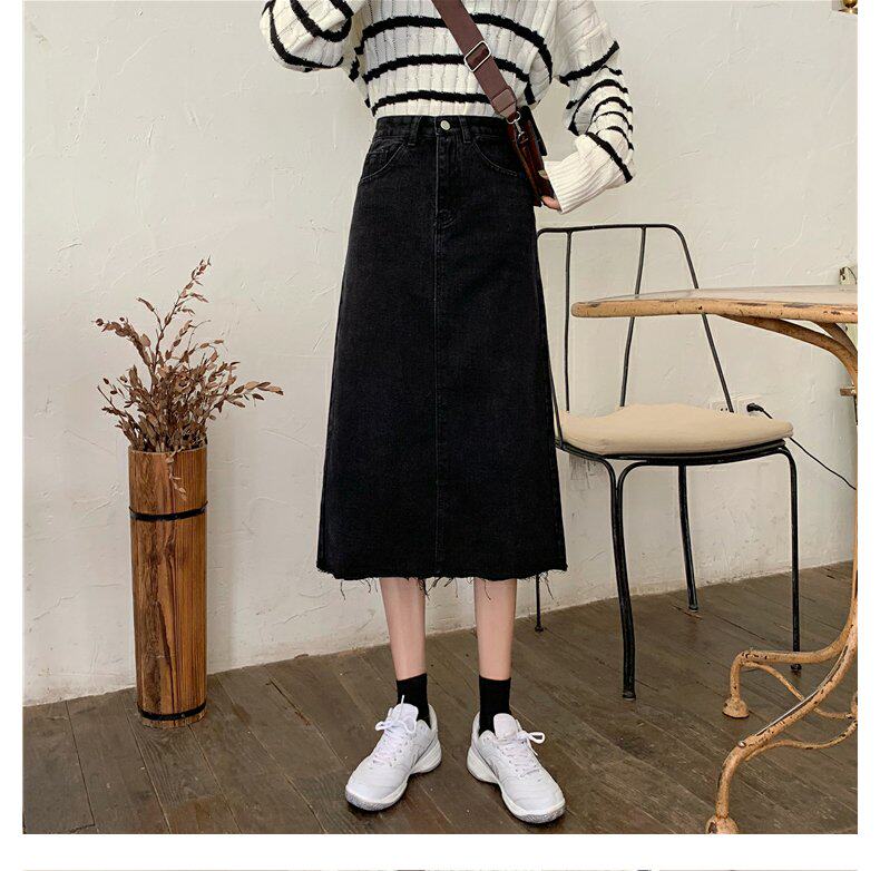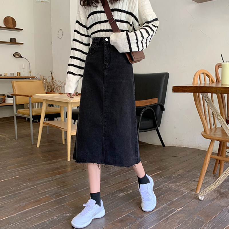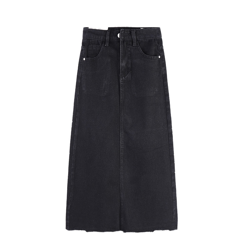Черная осенняя длинная джинсовая юбка, большой размер, высокая талия, А-силуэт, длина макси, с акцентом на бедрах