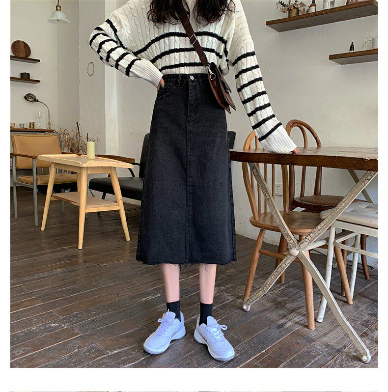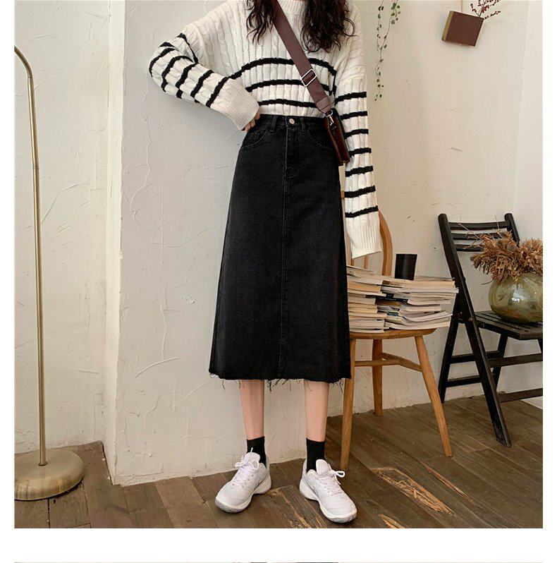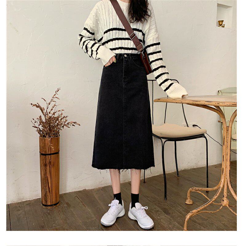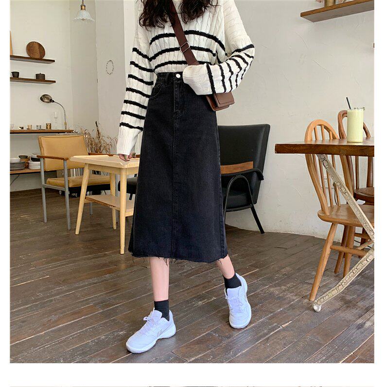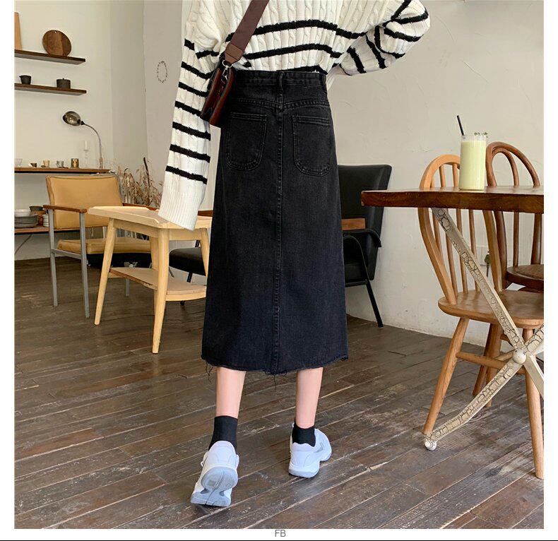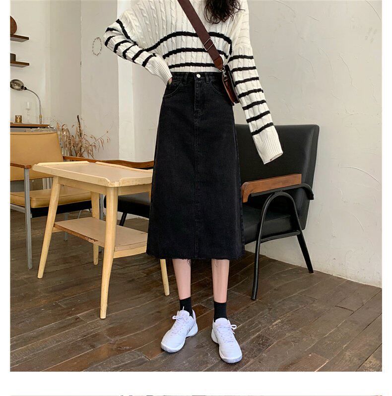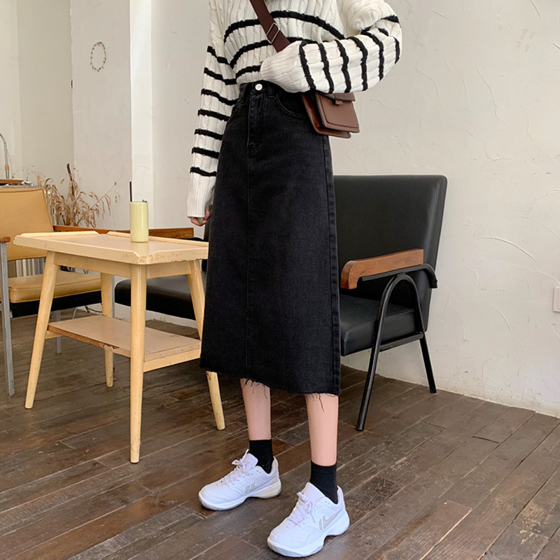 Черная осенняя длинная джинсовая юбка, большой размер, высокая талия, А-силуэт, длина макси, с акцентом на бедрах