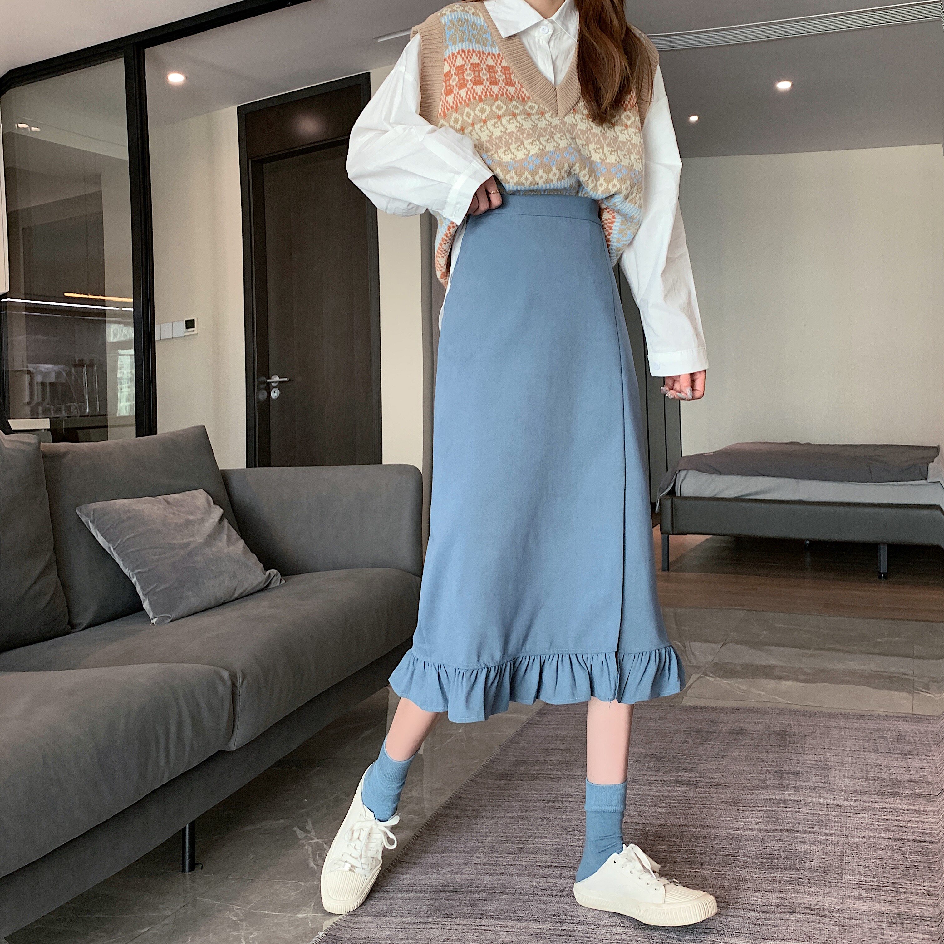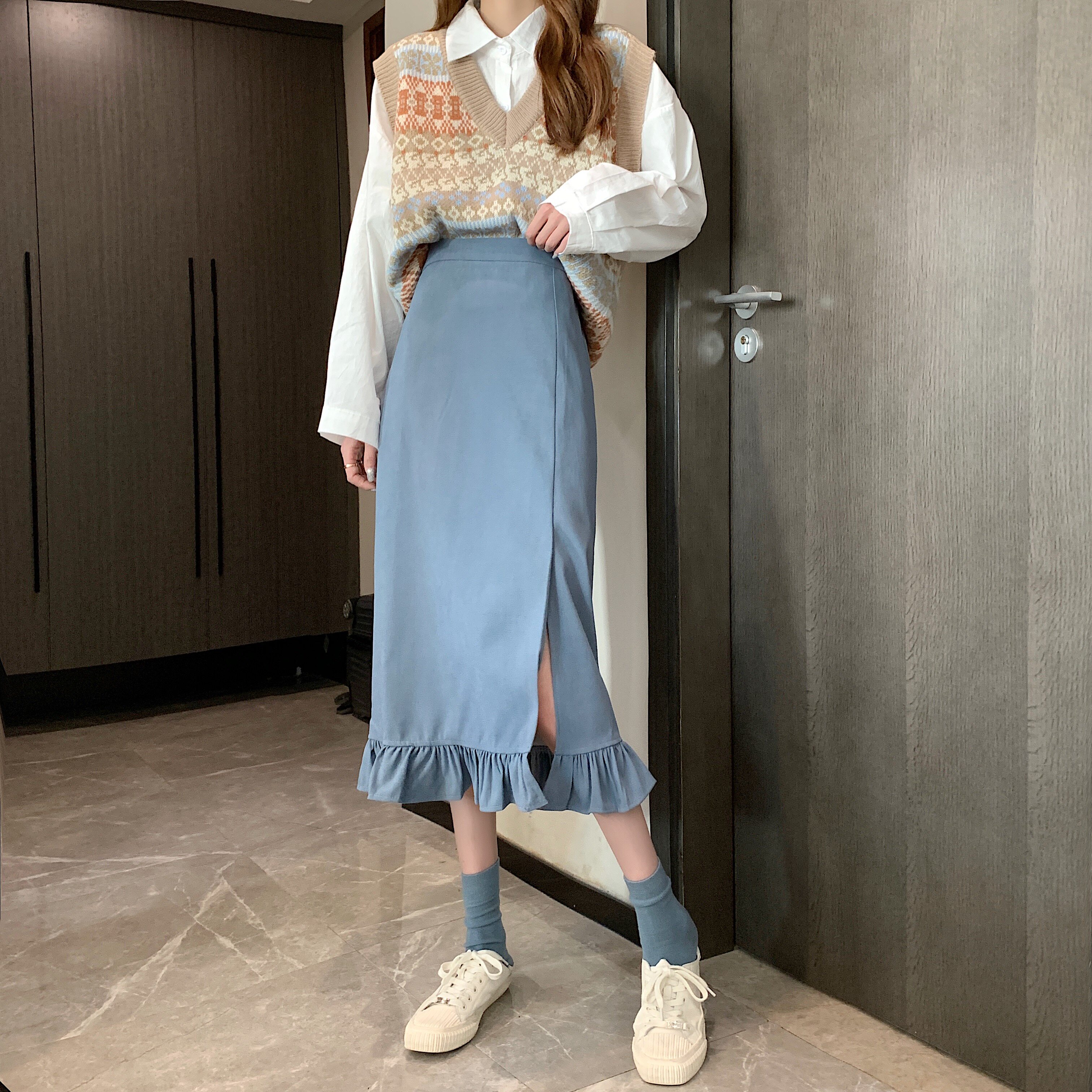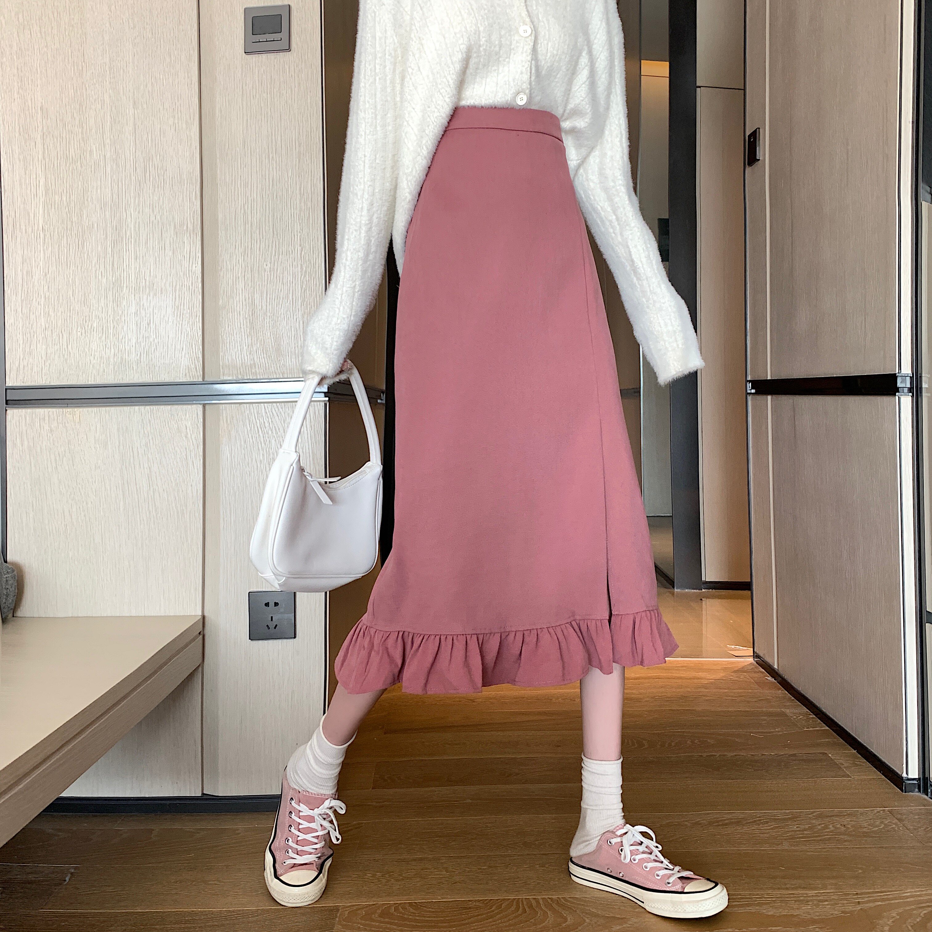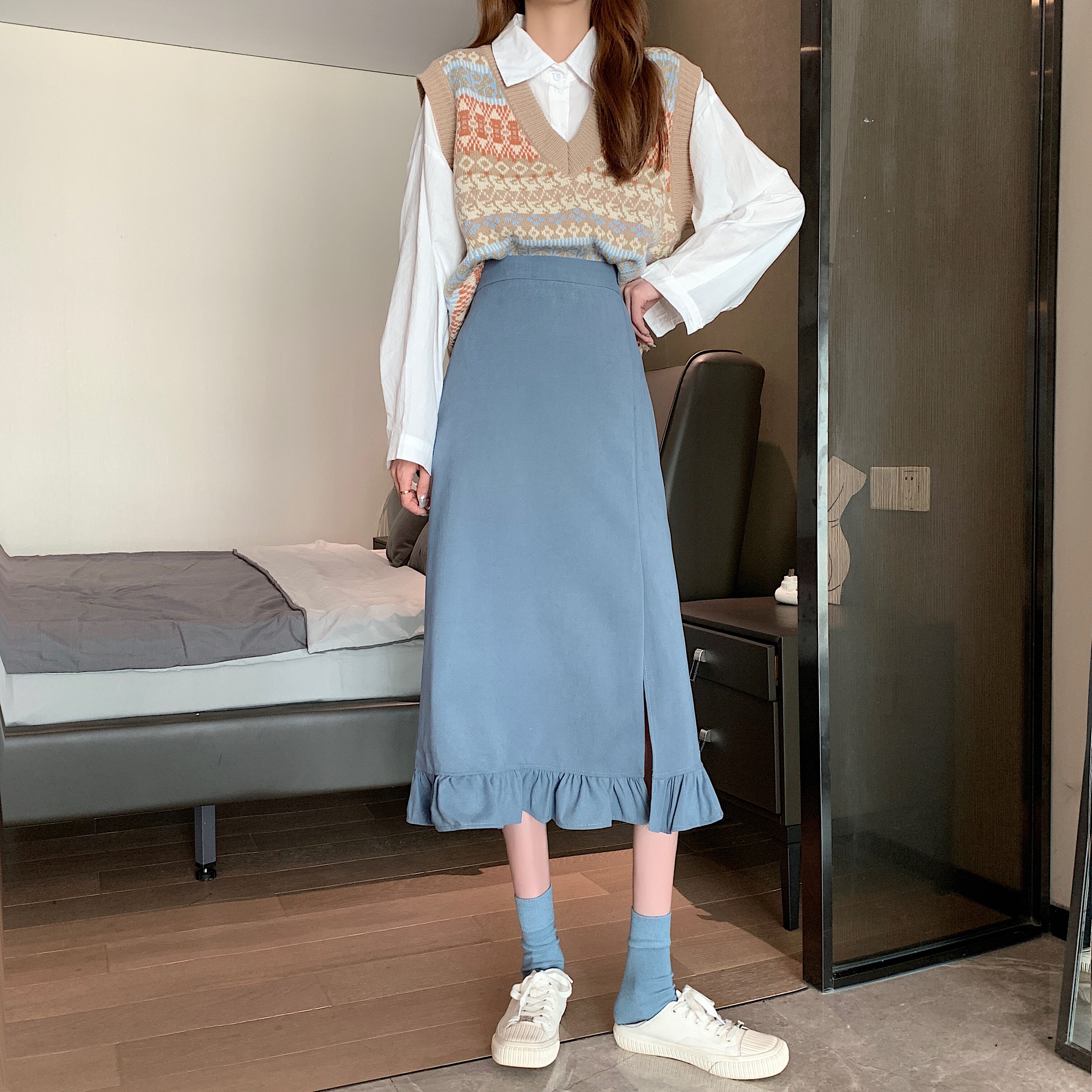Черная весенняя зимняя длинная юбка, цветная юбка, высокая талия, средней длины, городской стиль