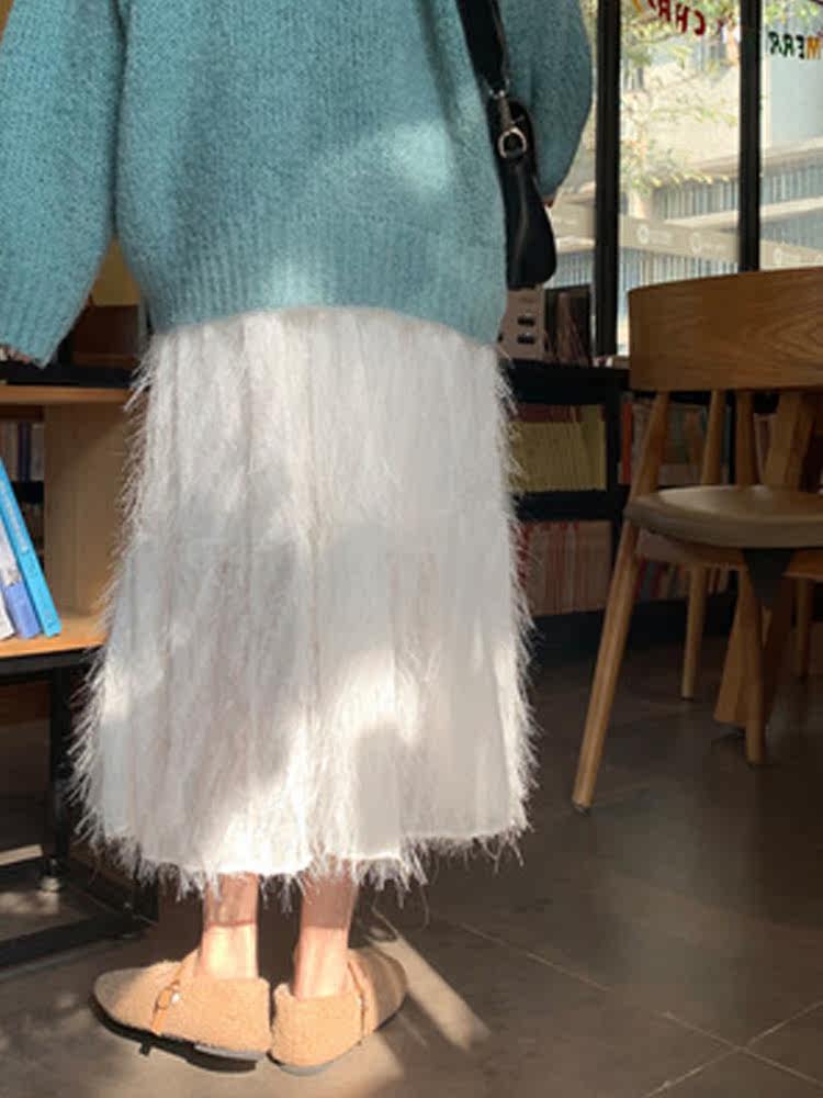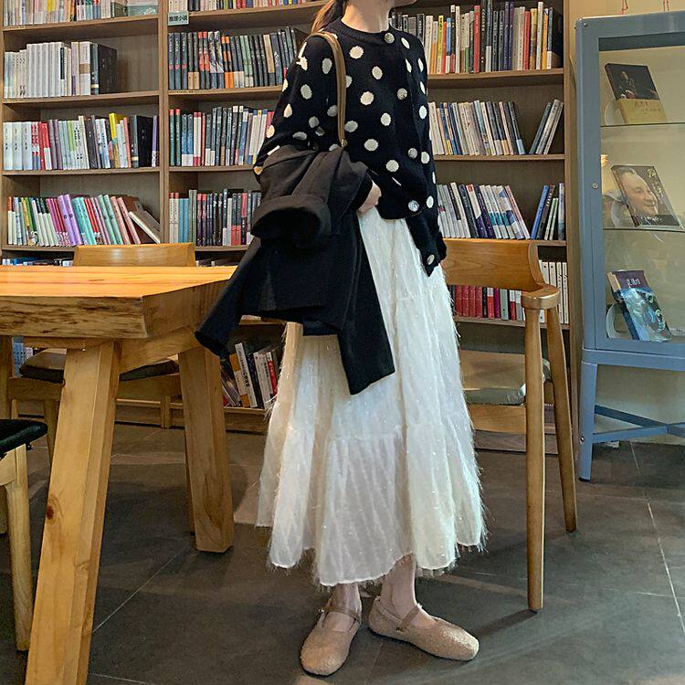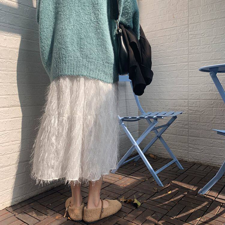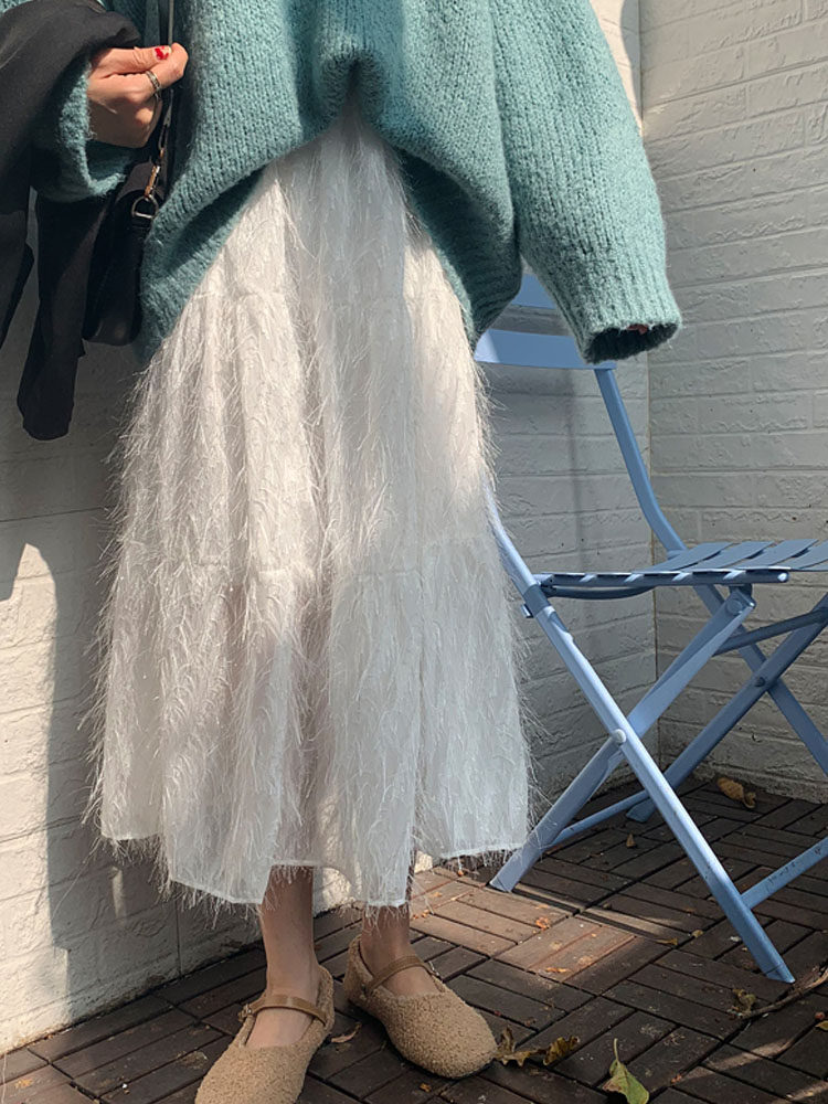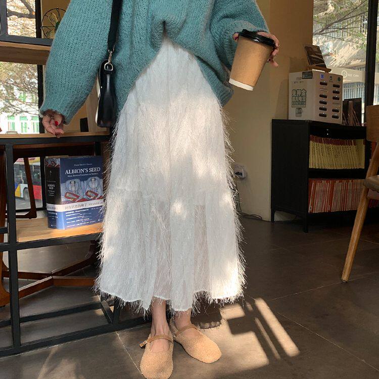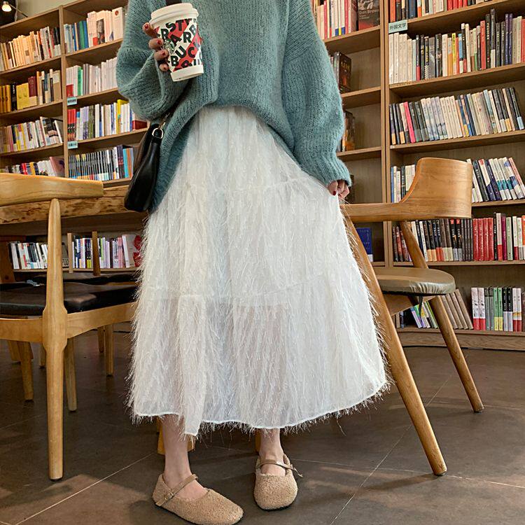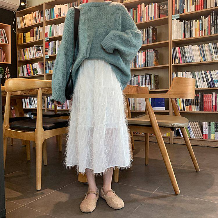 Белый длинный осенний свитер, длинная юбка, А-силуэт, длина макси
