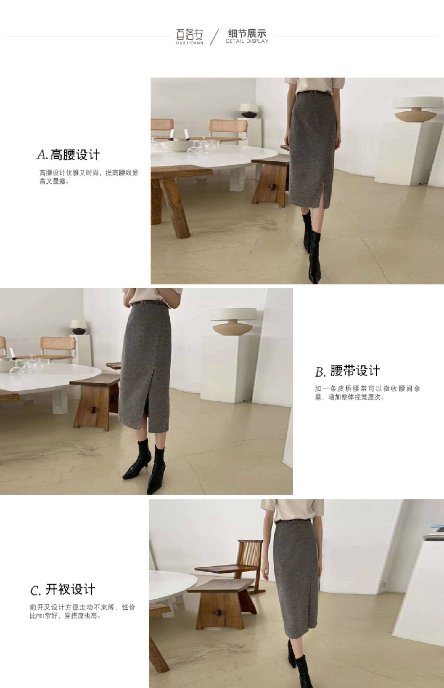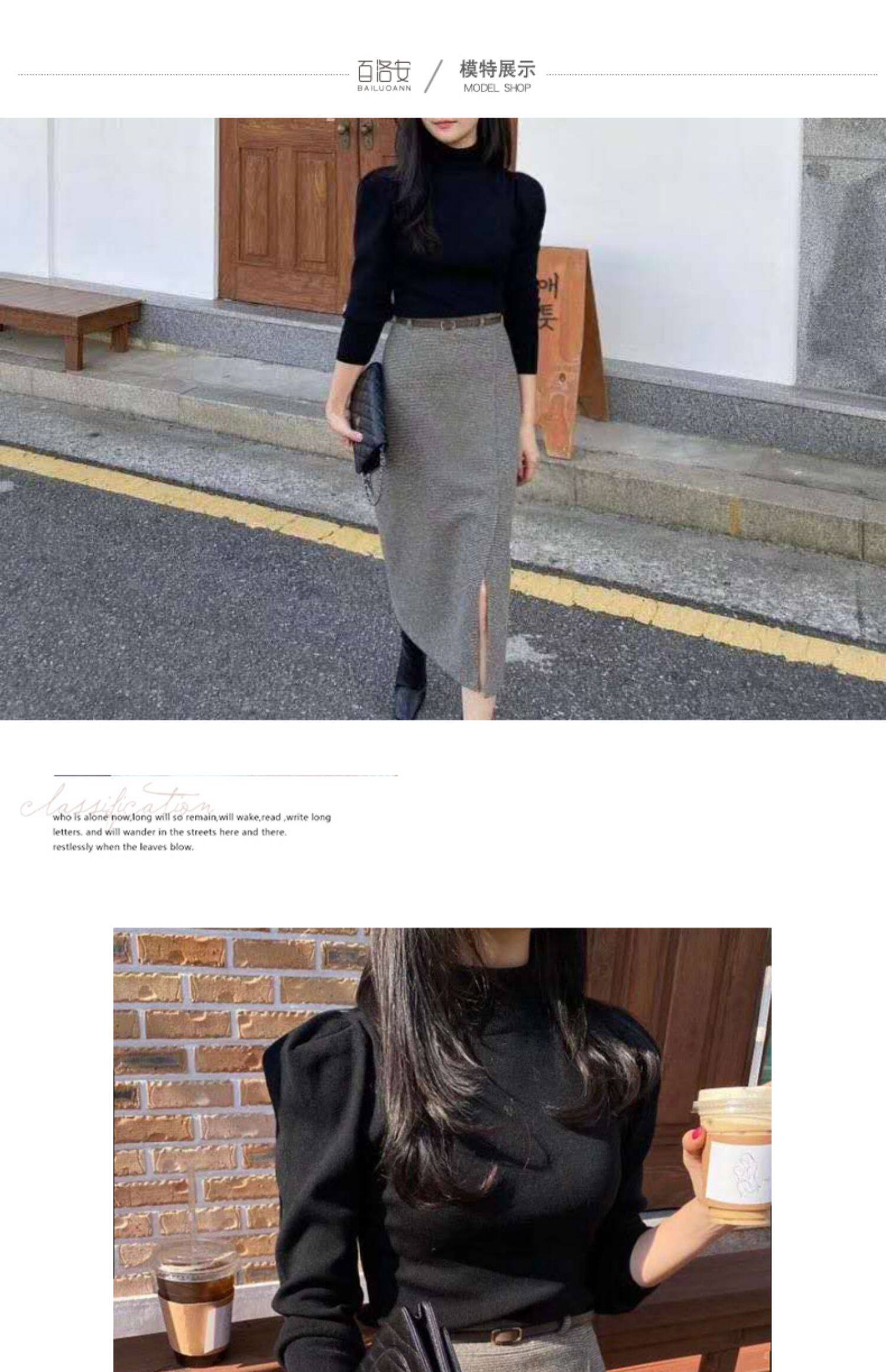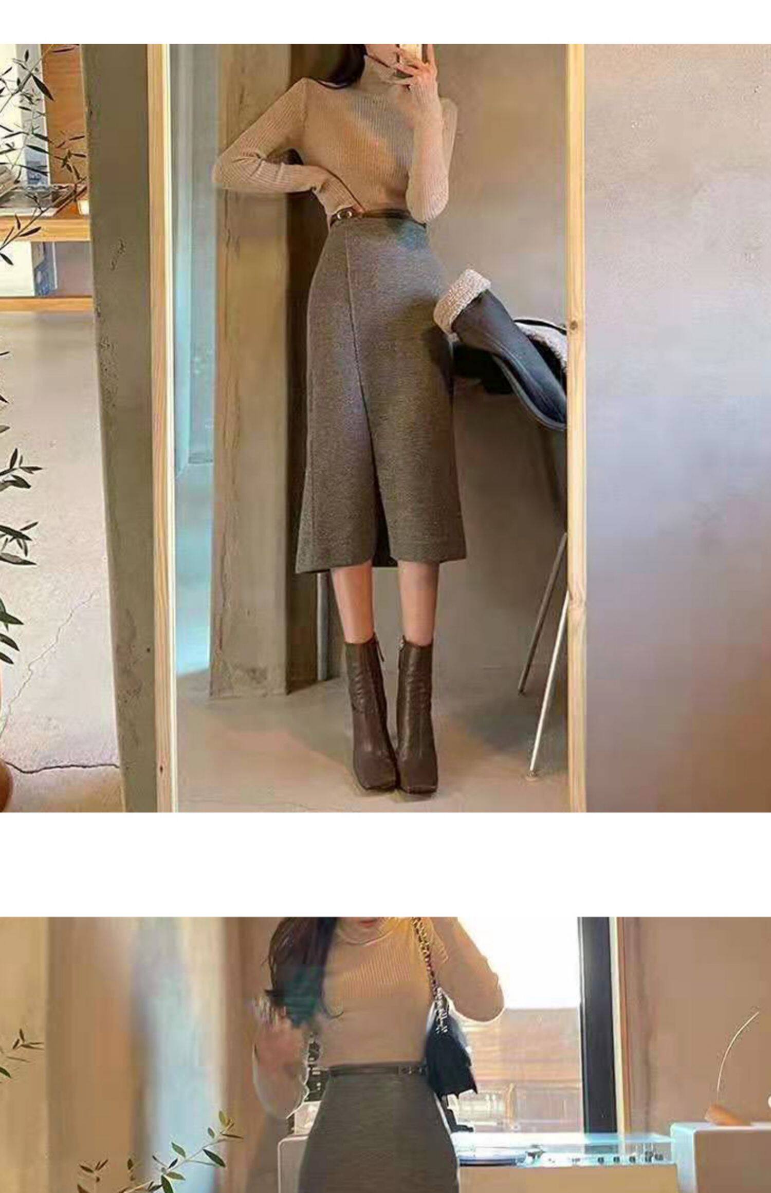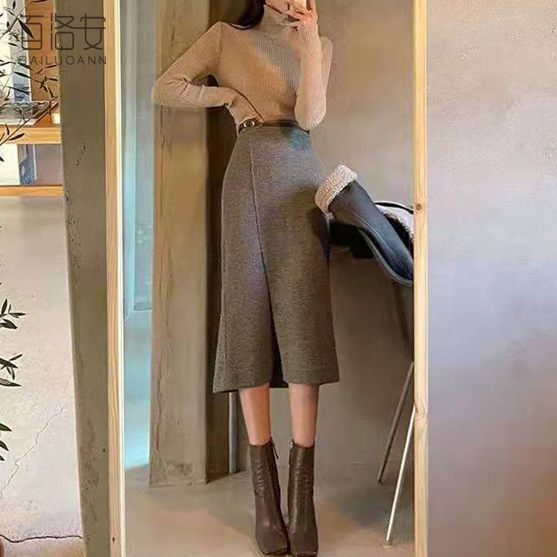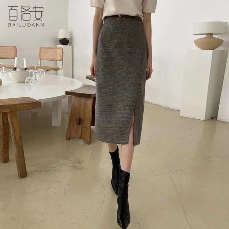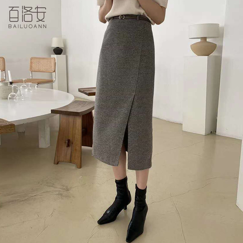 百洛安 Клетчатая поясная сумка, шерстяная длинная юбка, высокая талия, городской стиль, средней длины