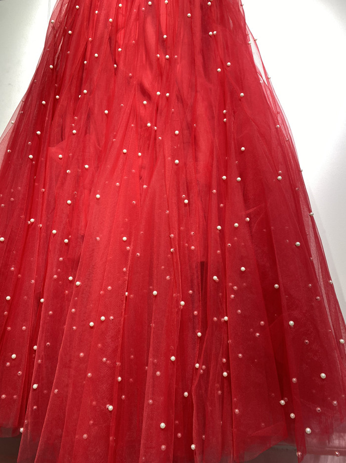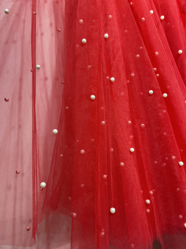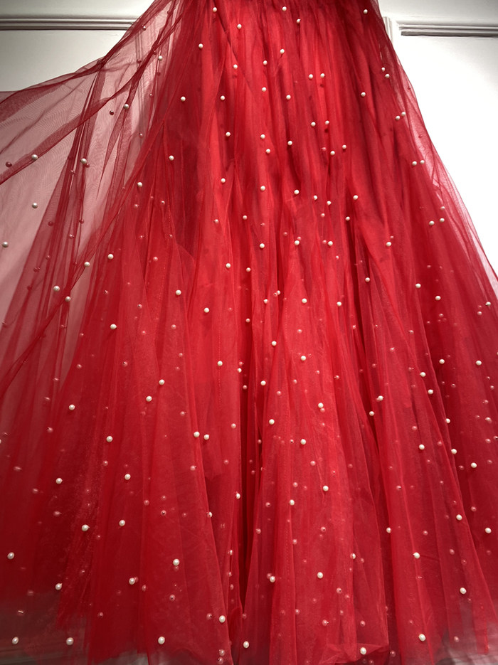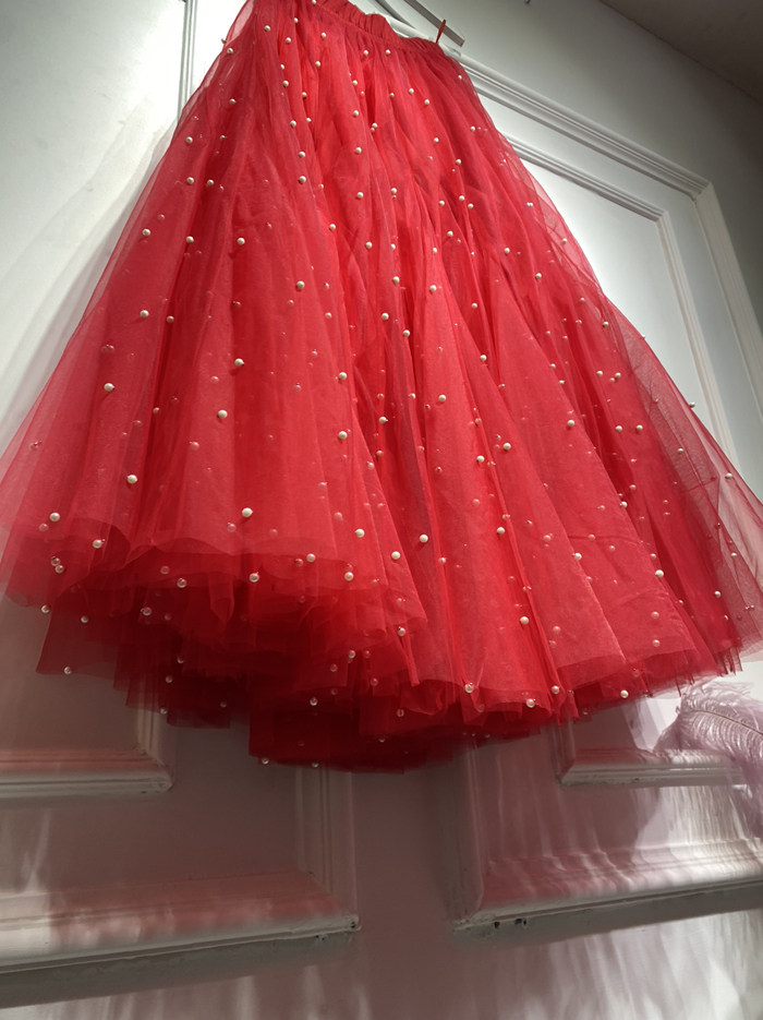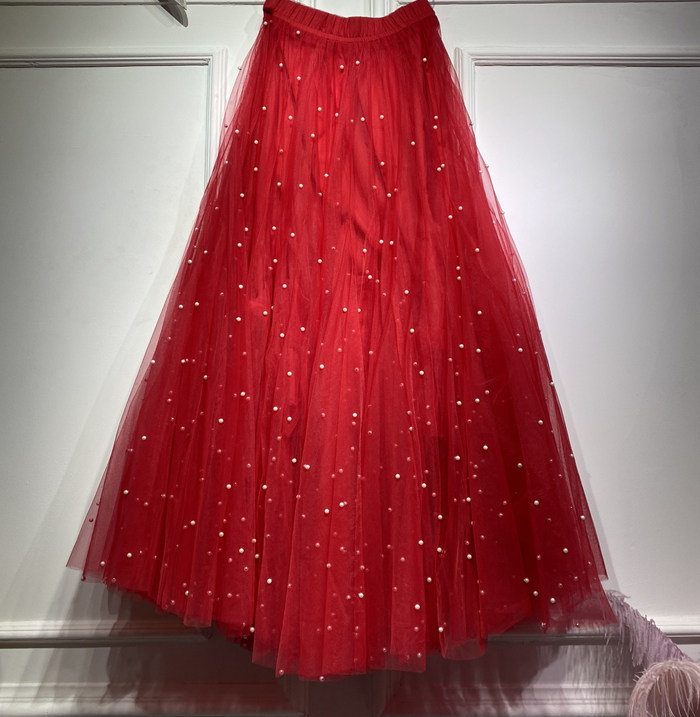 Ярко-красная модная большая юбка королевы в стиле ретро с очень пышной и облегающей газовой юбкой с жемчужным декором, юбкой-пачкой средней длины