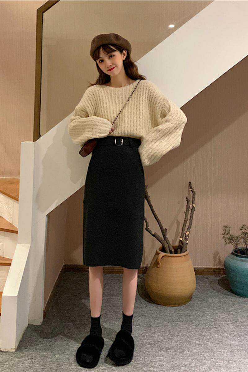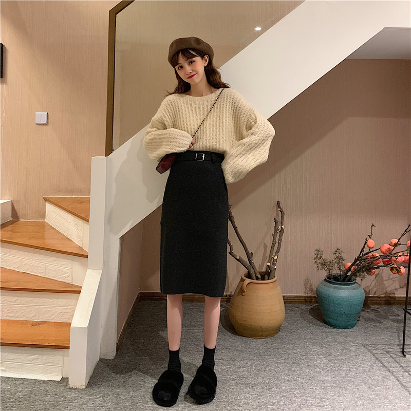 Шерстяная длинная юбка, ремень, большой размер, подходит для полных девушек, с акцентом на бедрах