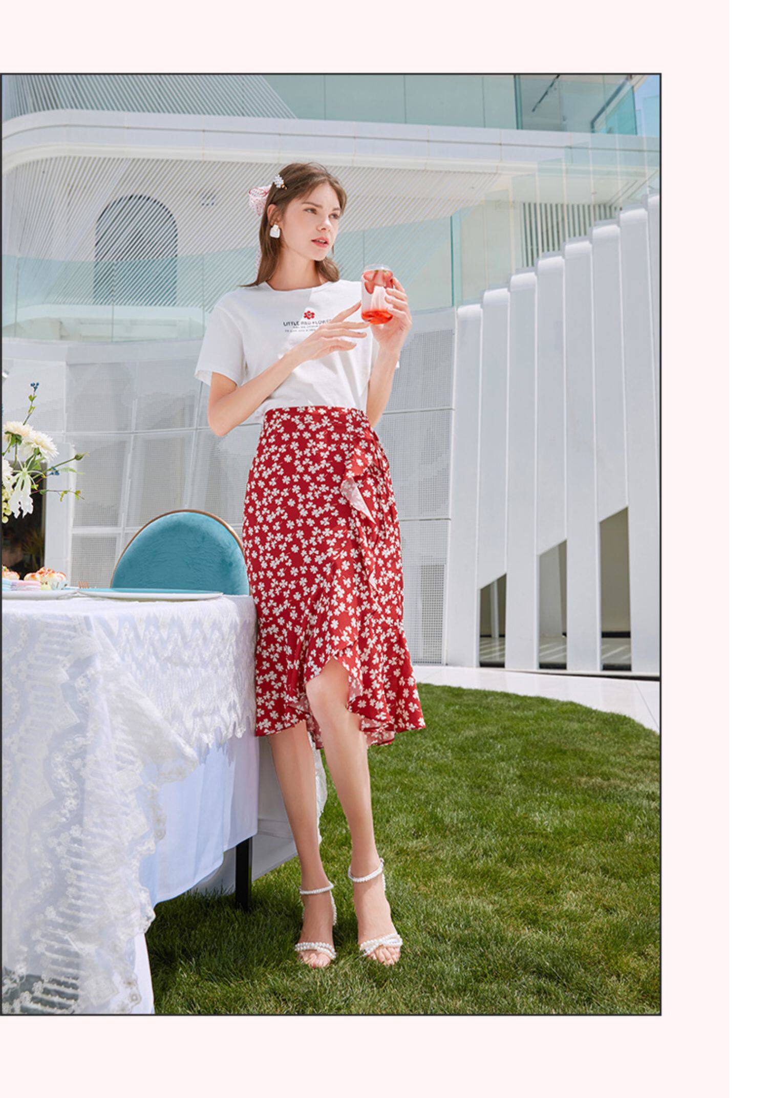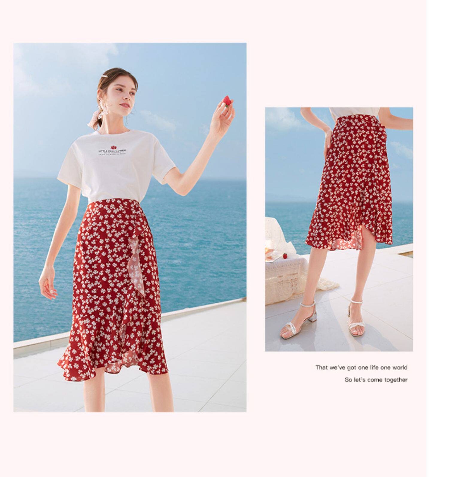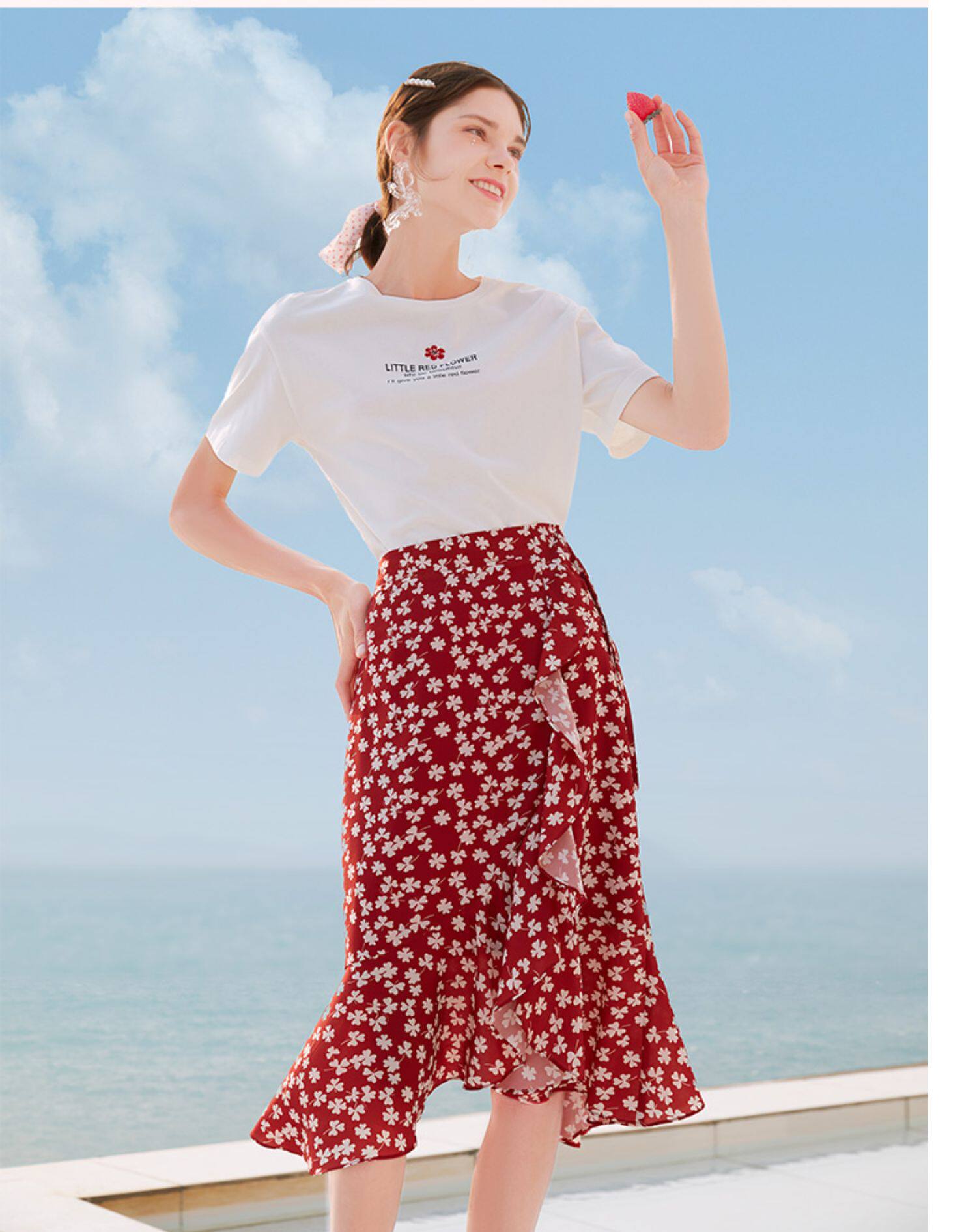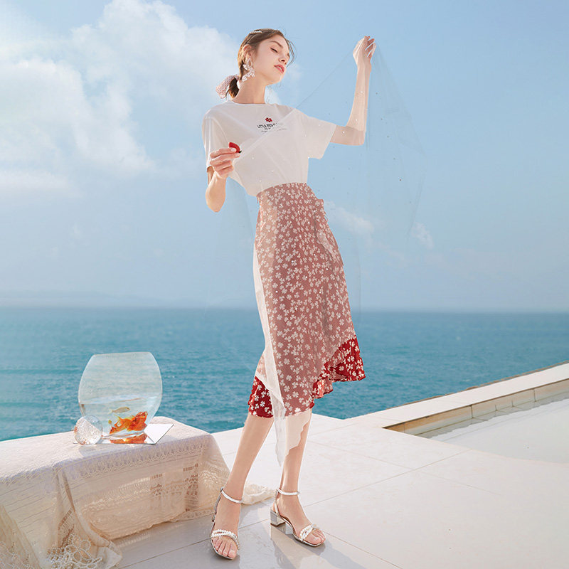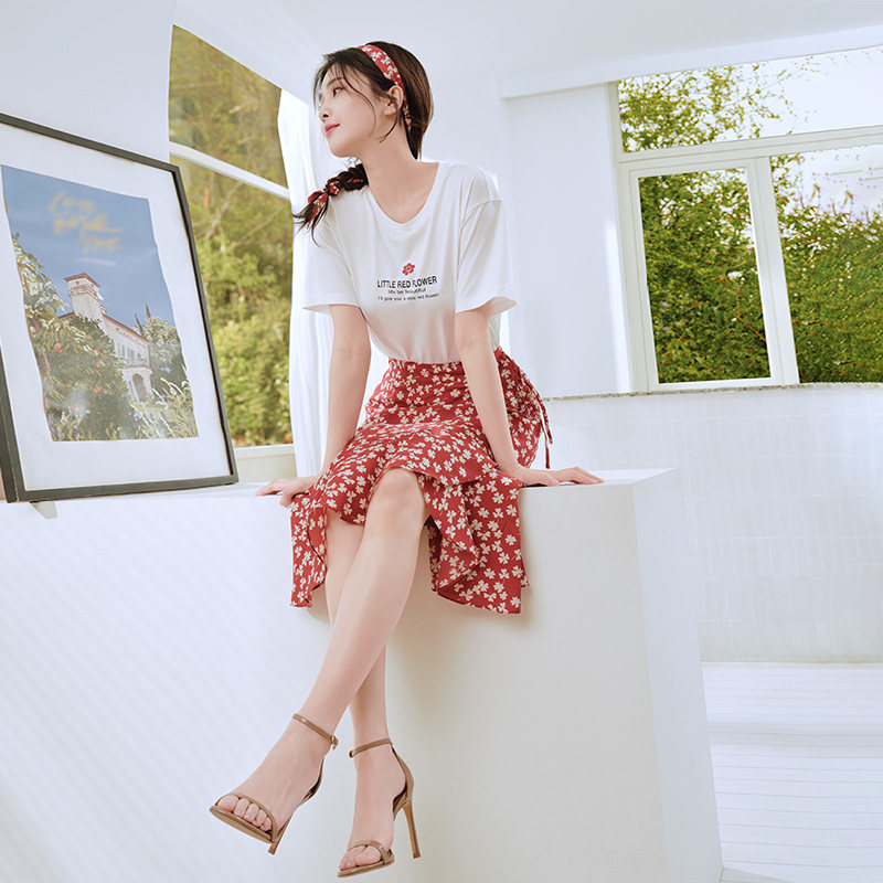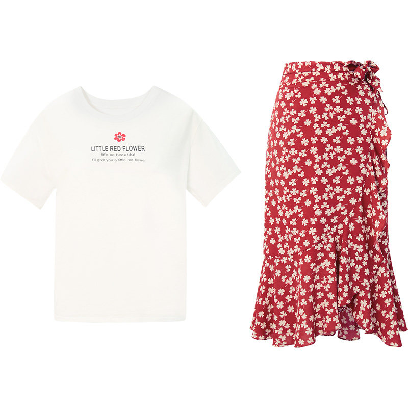 Белая футболка, красная шифоновая летняя юбка, коллекция 2022, цветочный принт