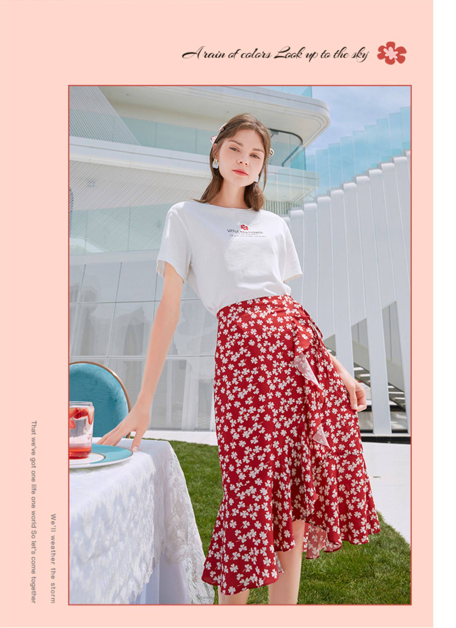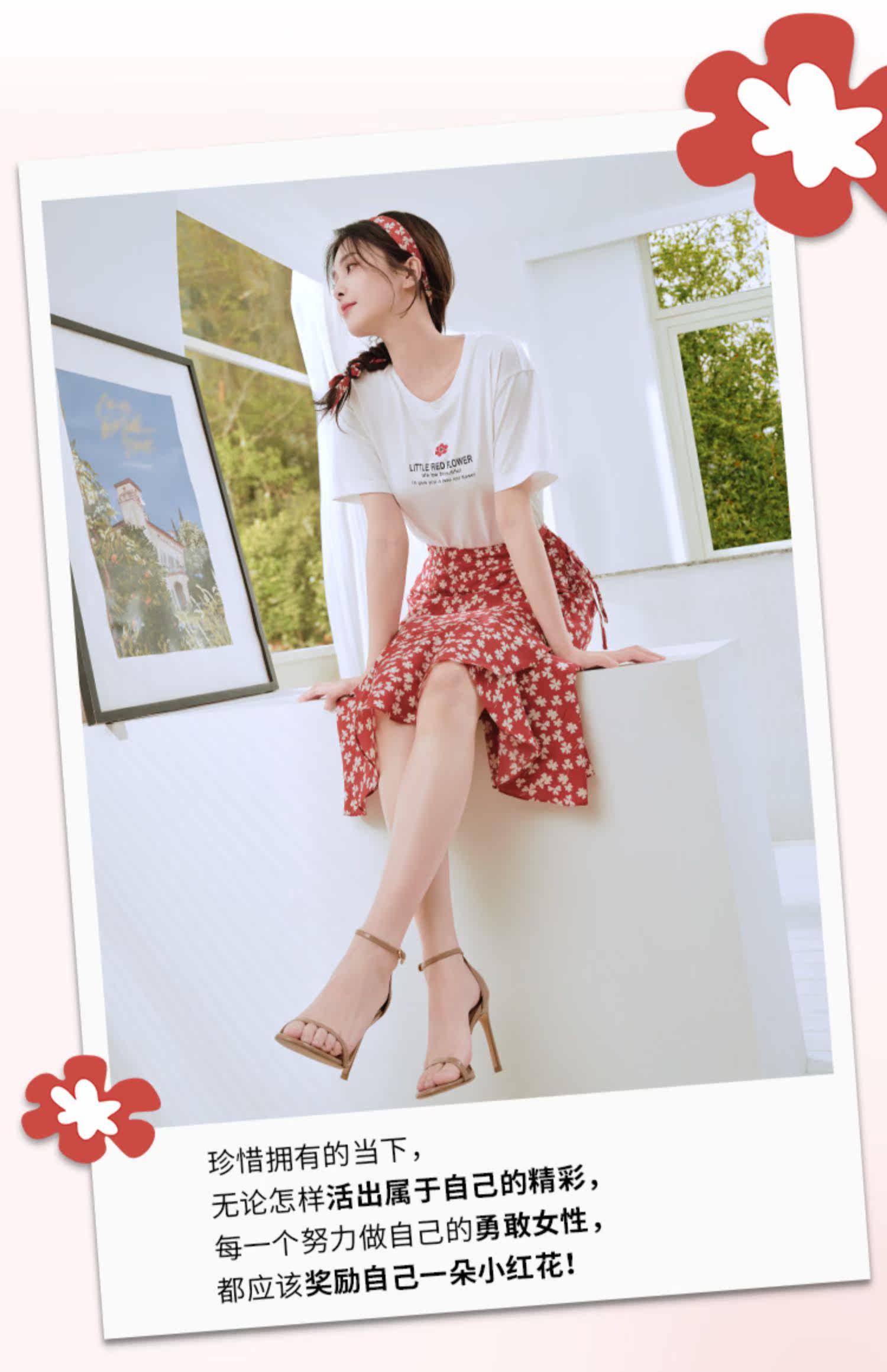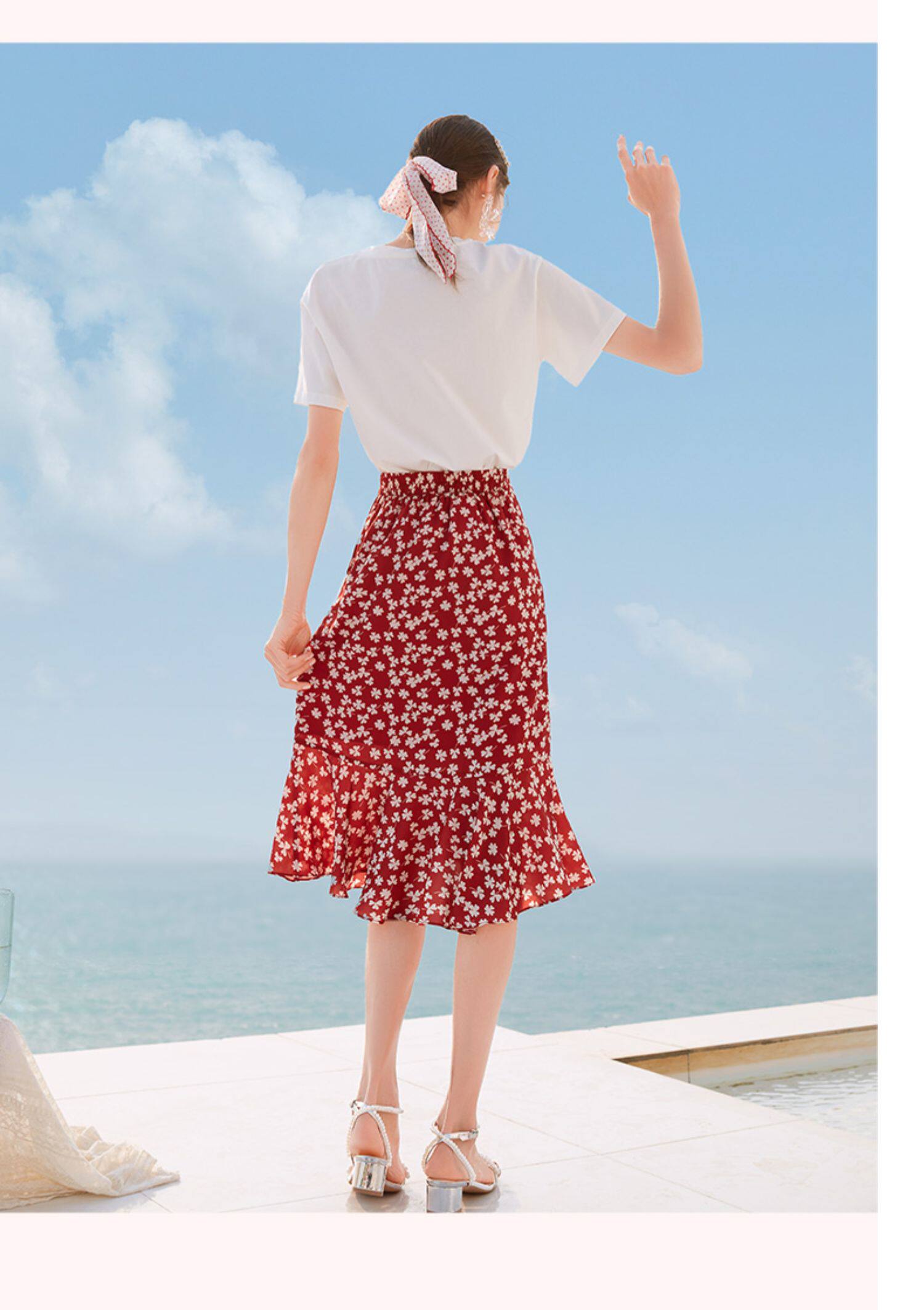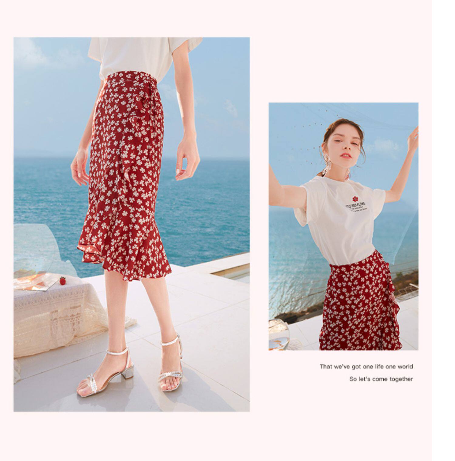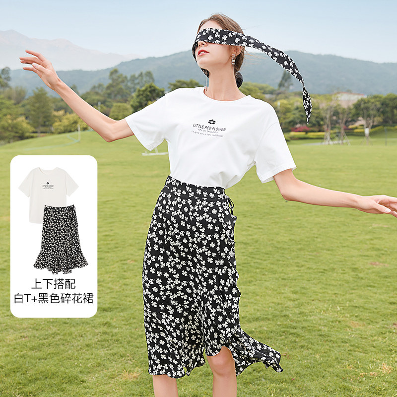 Белая футболка, красная шифоновая летняя юбка, коллекция 2022, цветочный принт