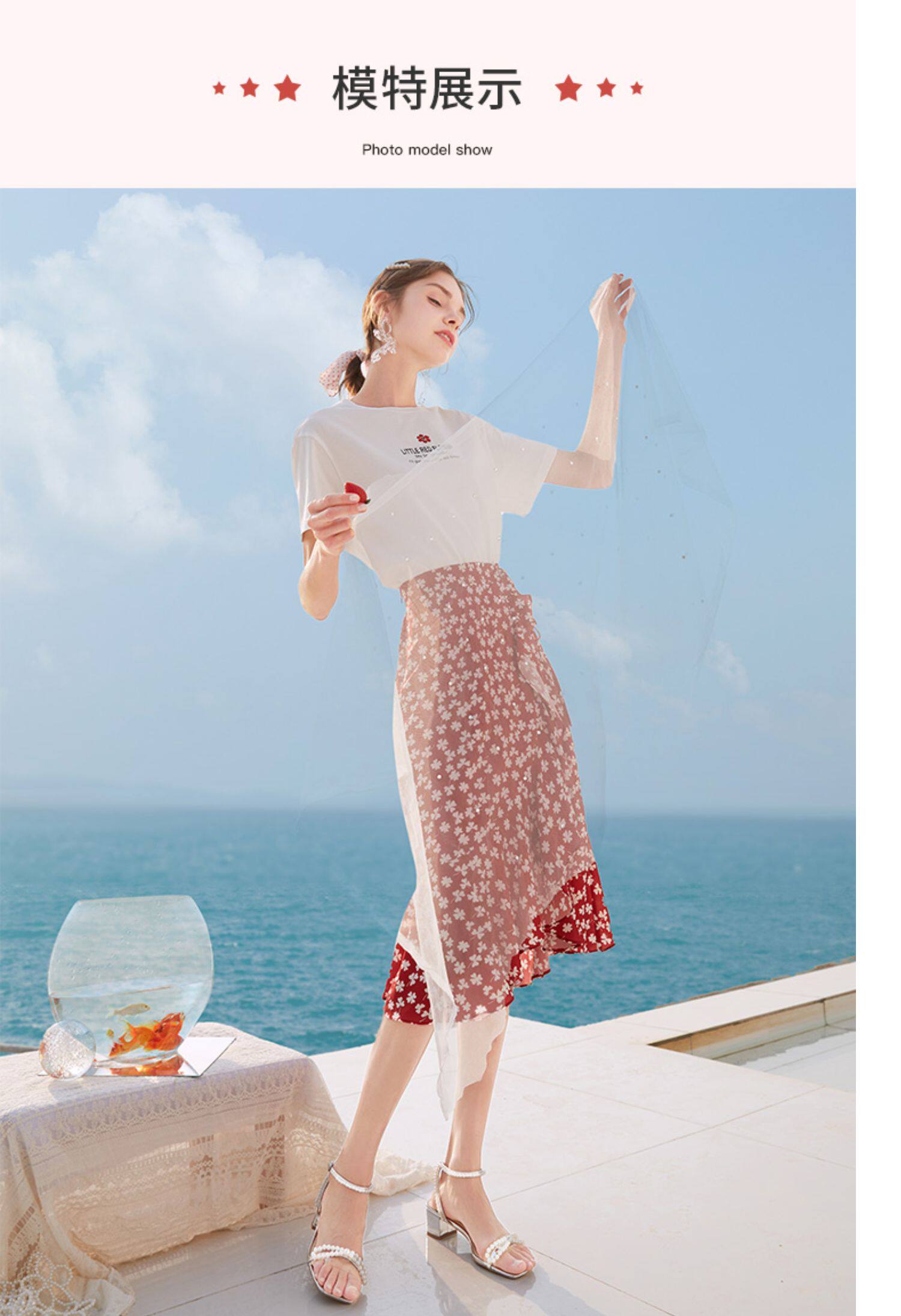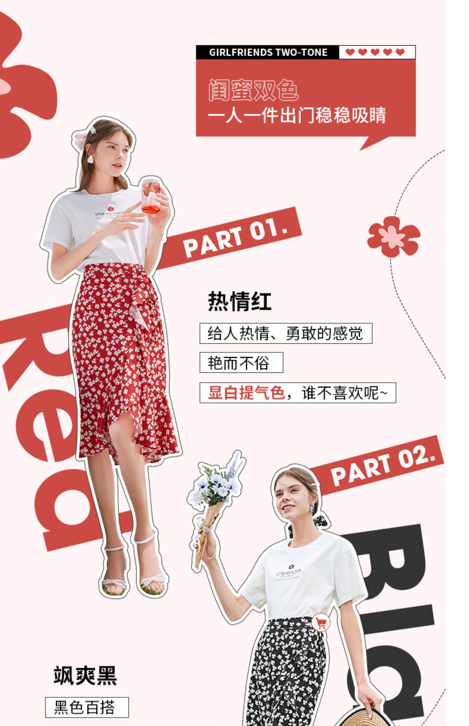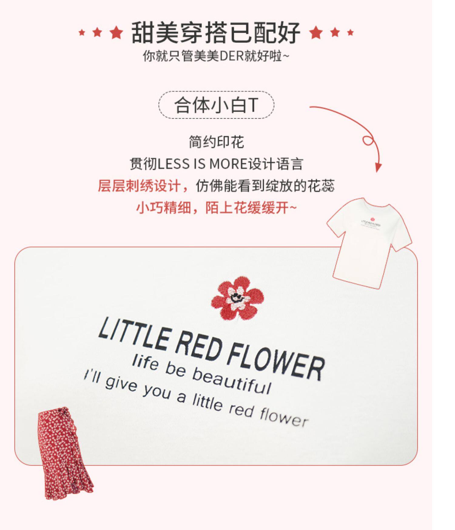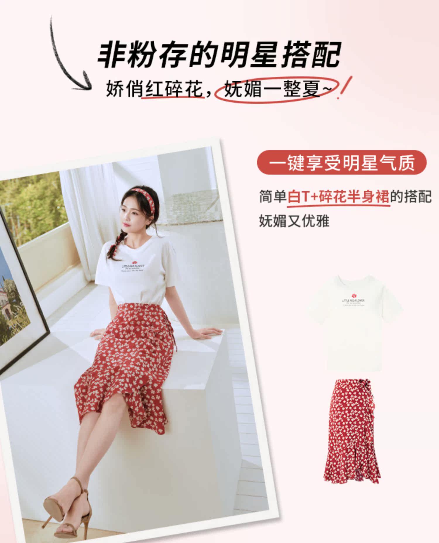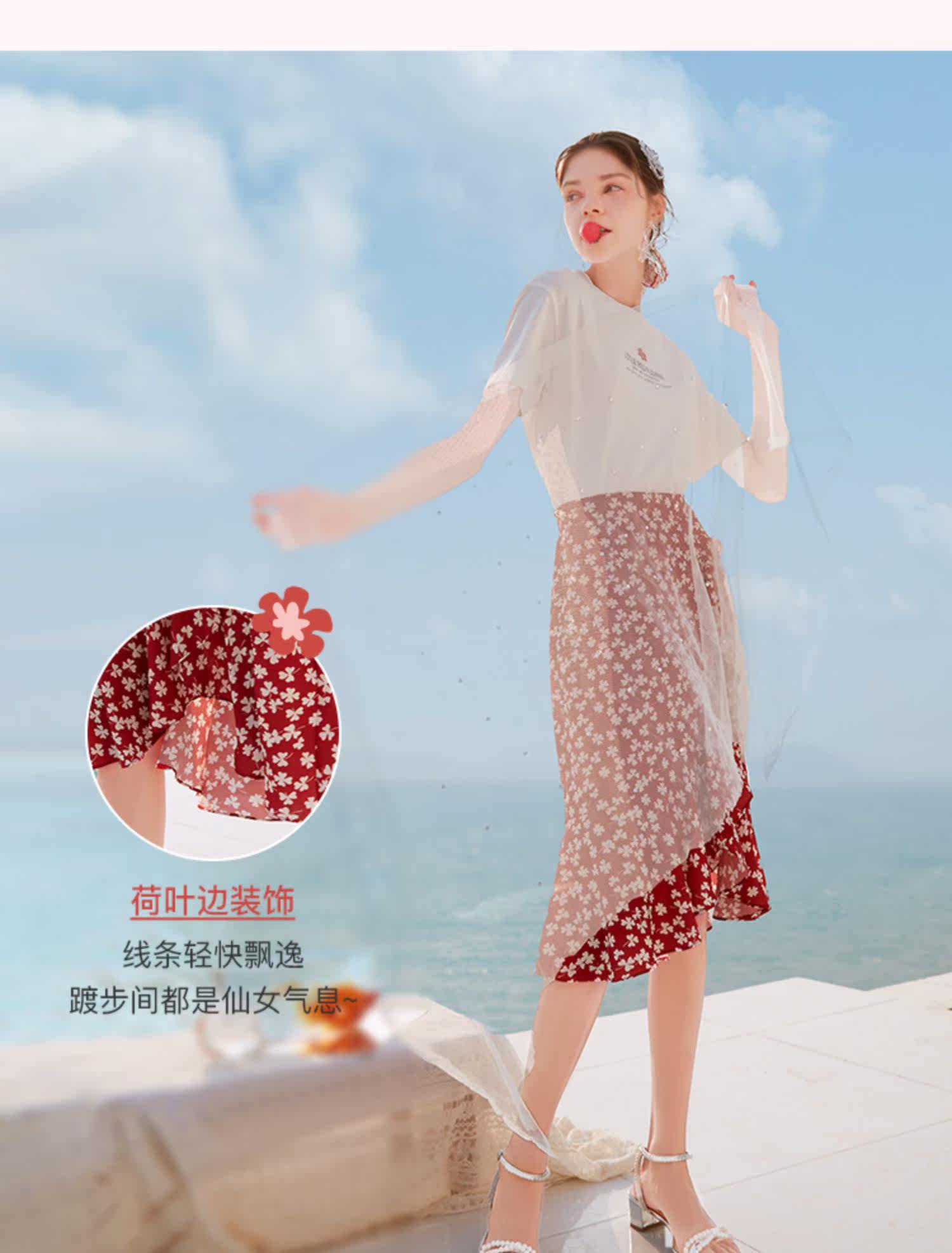 Белая футболка, красная шифоновая летняя юбка, коллекция 2022, цветочный принт
