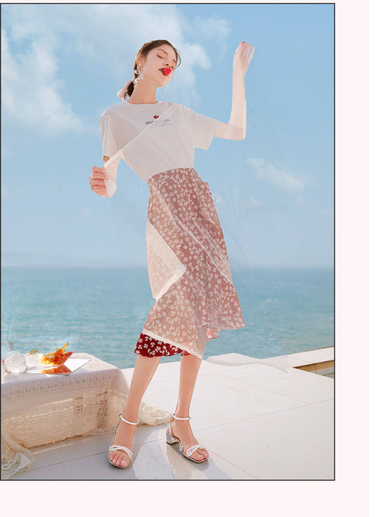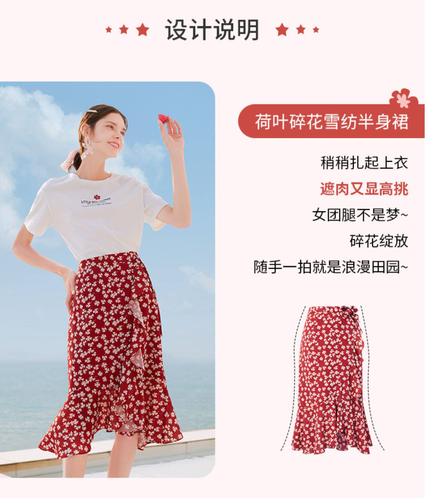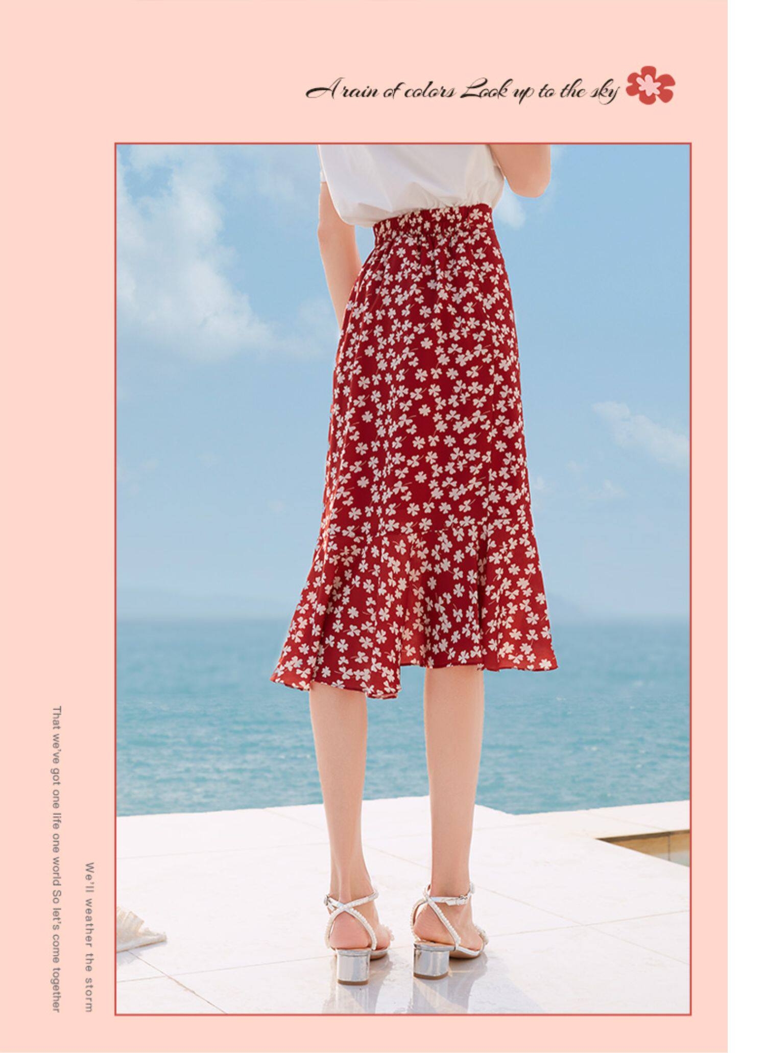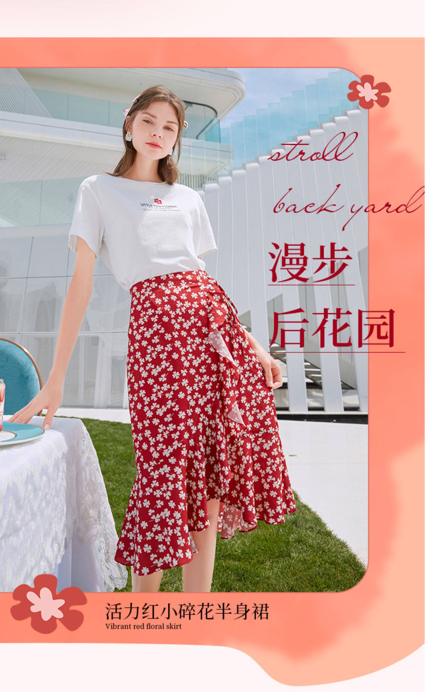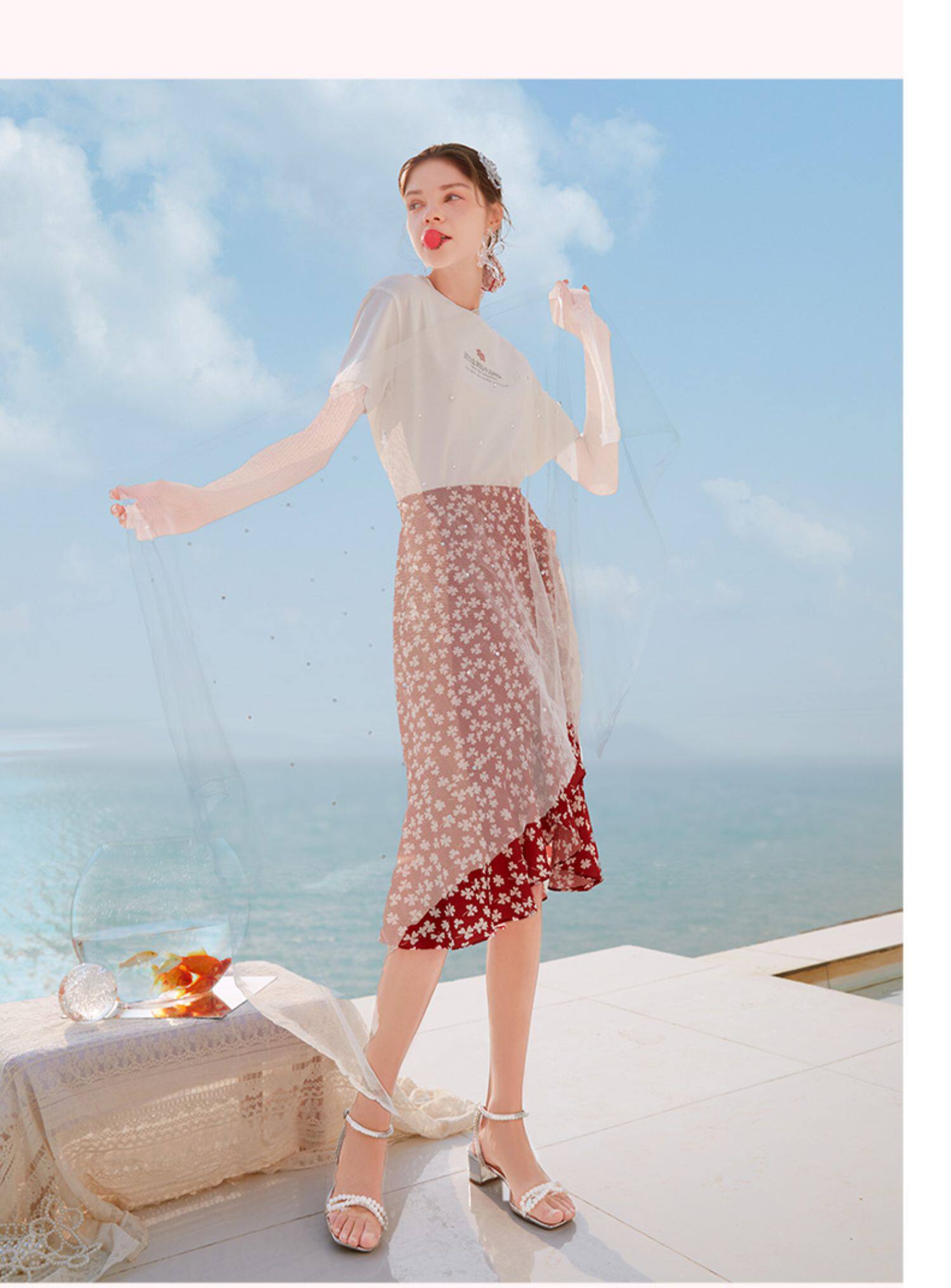 Белая футболка, красная шифоновая летняя юбка, коллекция 2022, цветочный принт