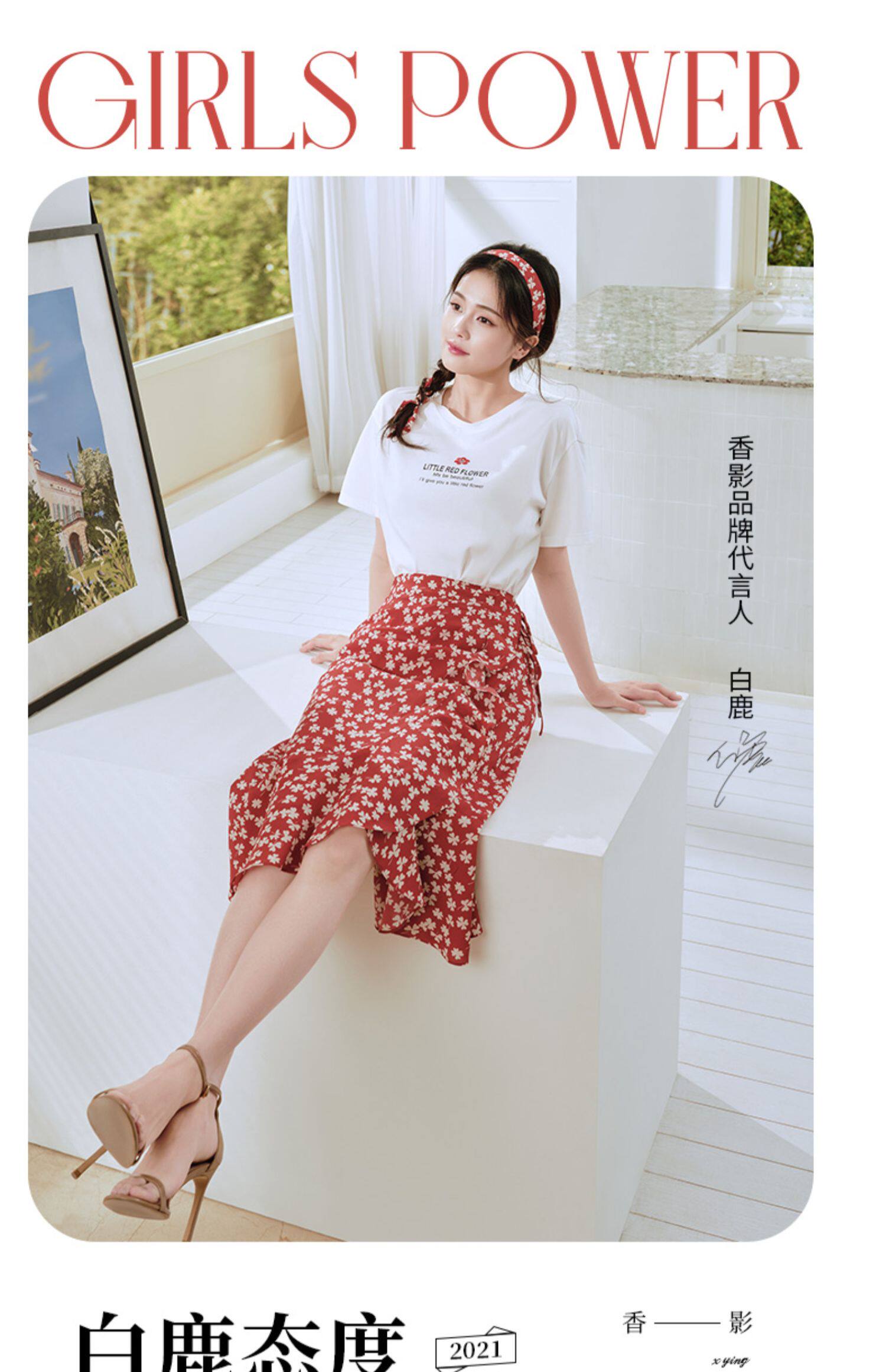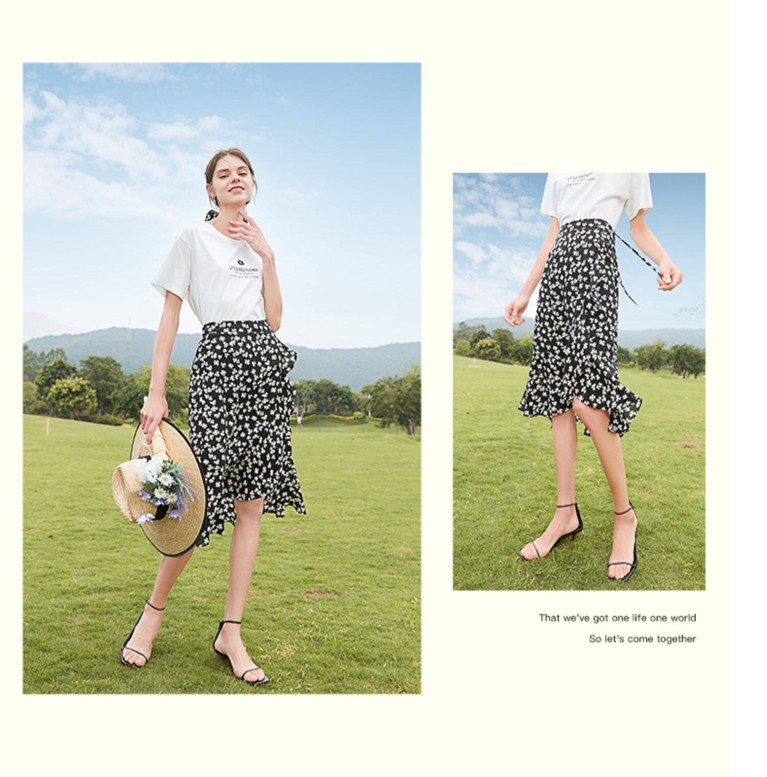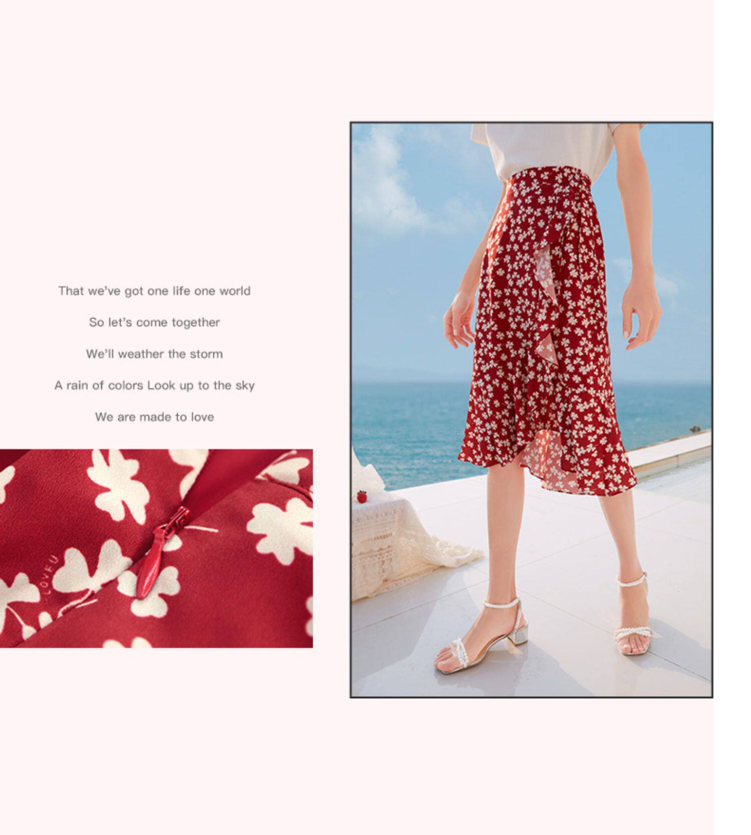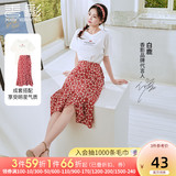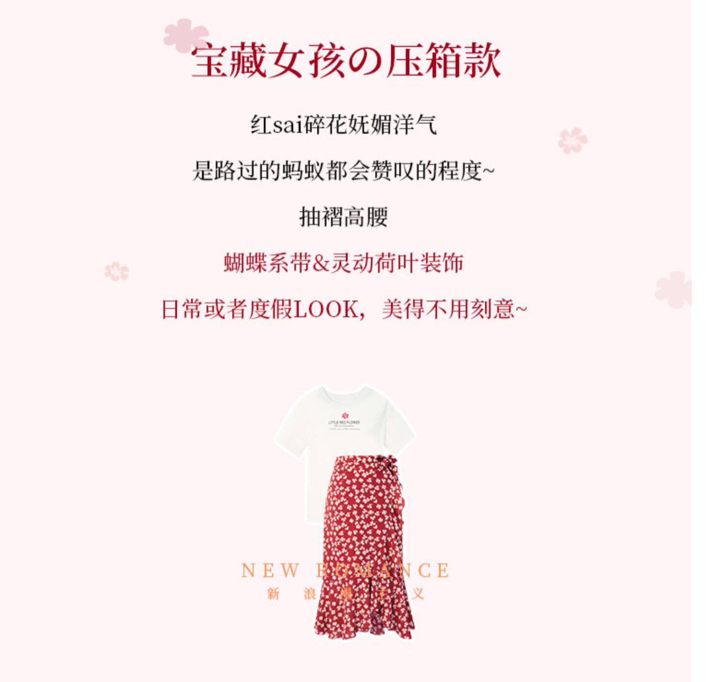 Белая футболка, красная шифоновая летняя юбка, коллекция 2022, цветочный принт