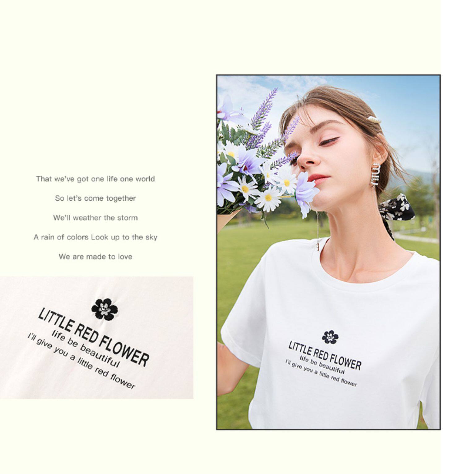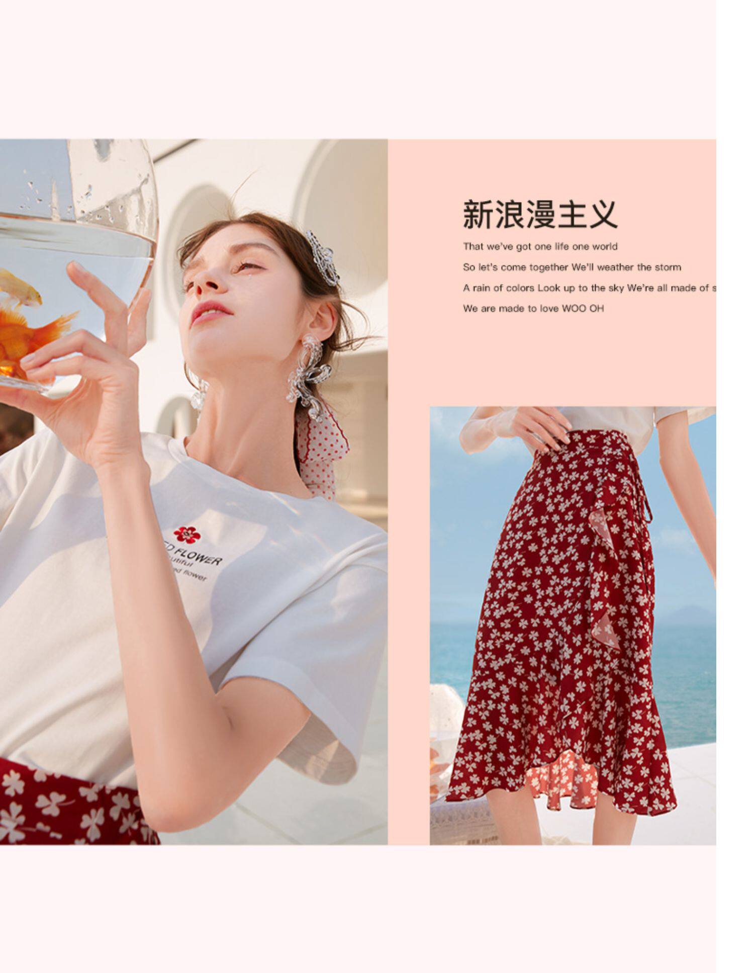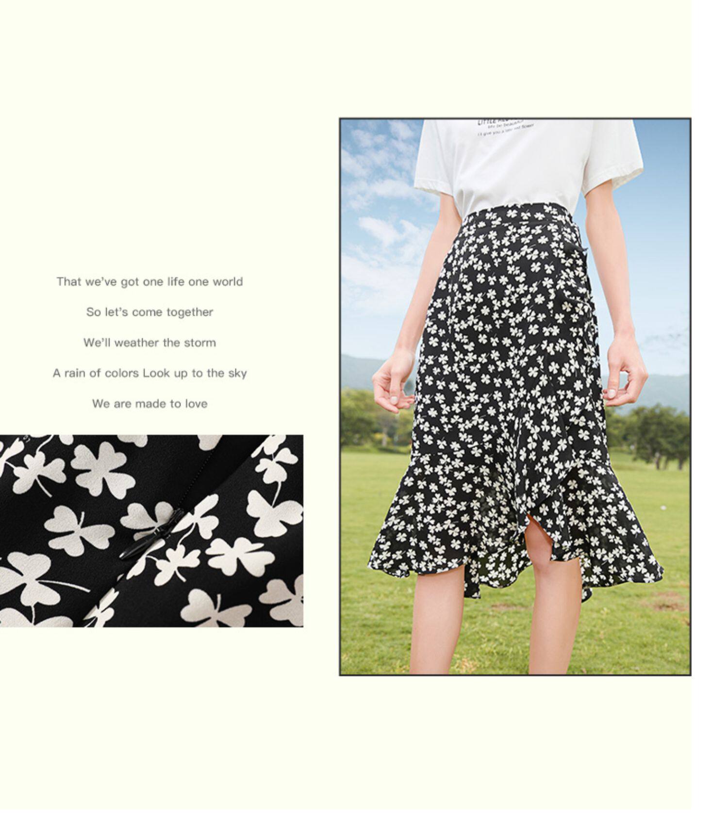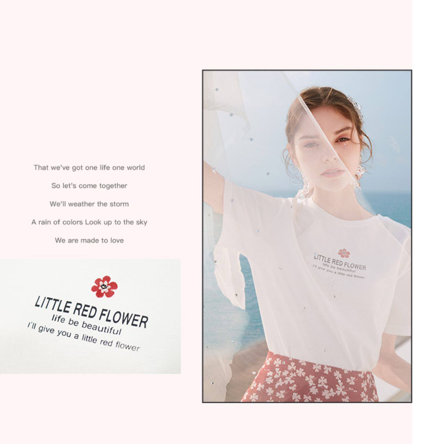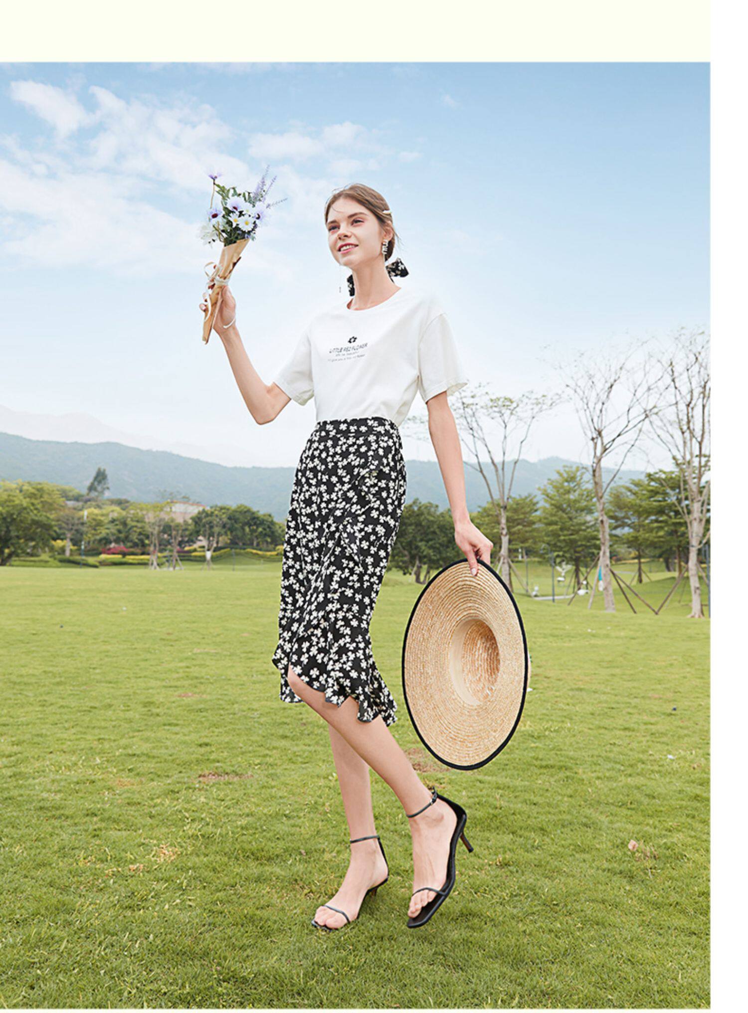 Белая футболка, красная шифоновая летняя юбка, коллекция 2022, цветочный принт