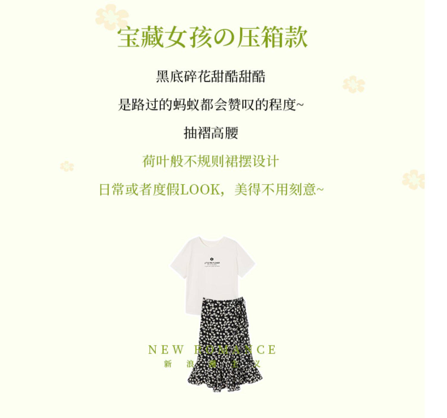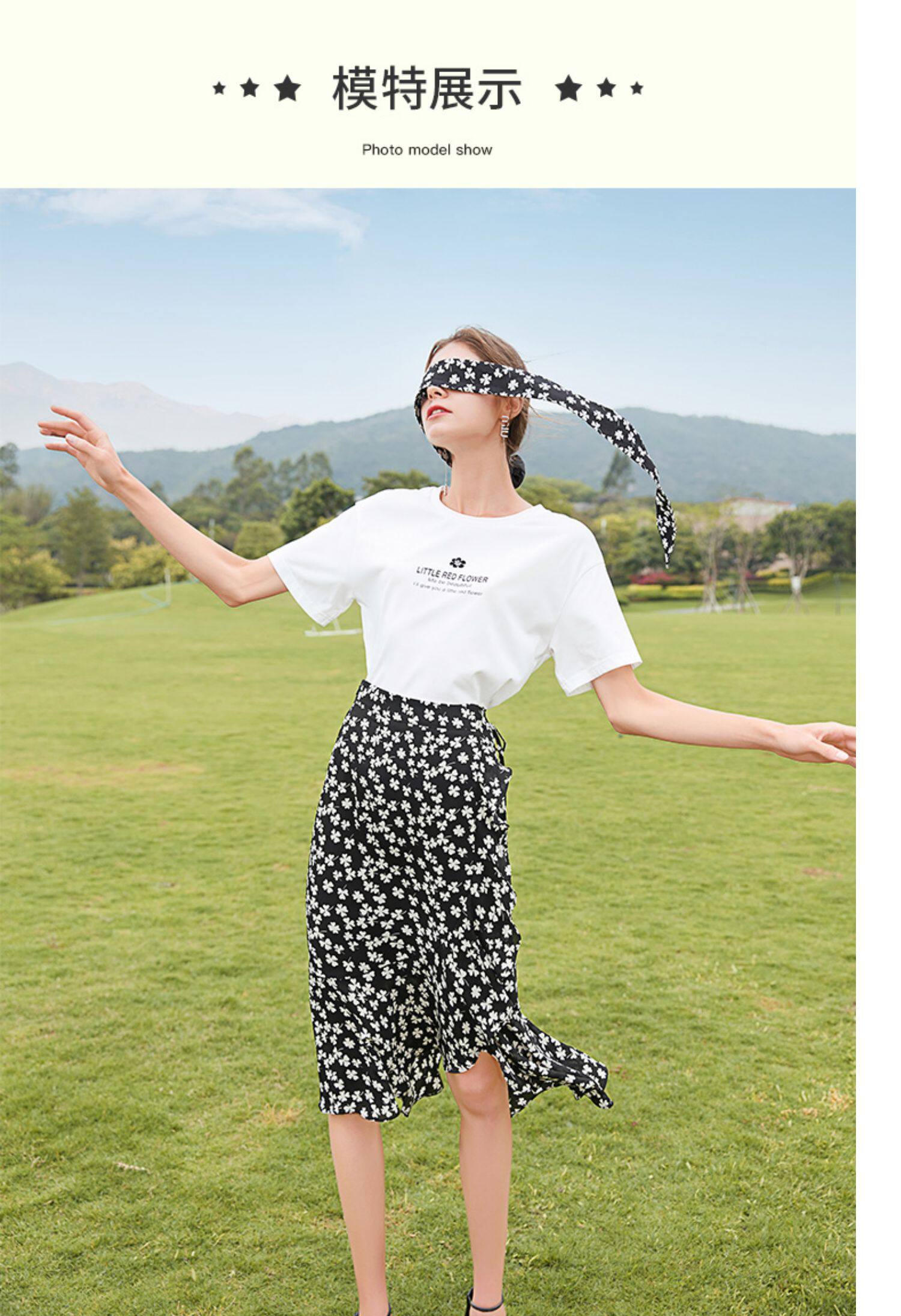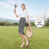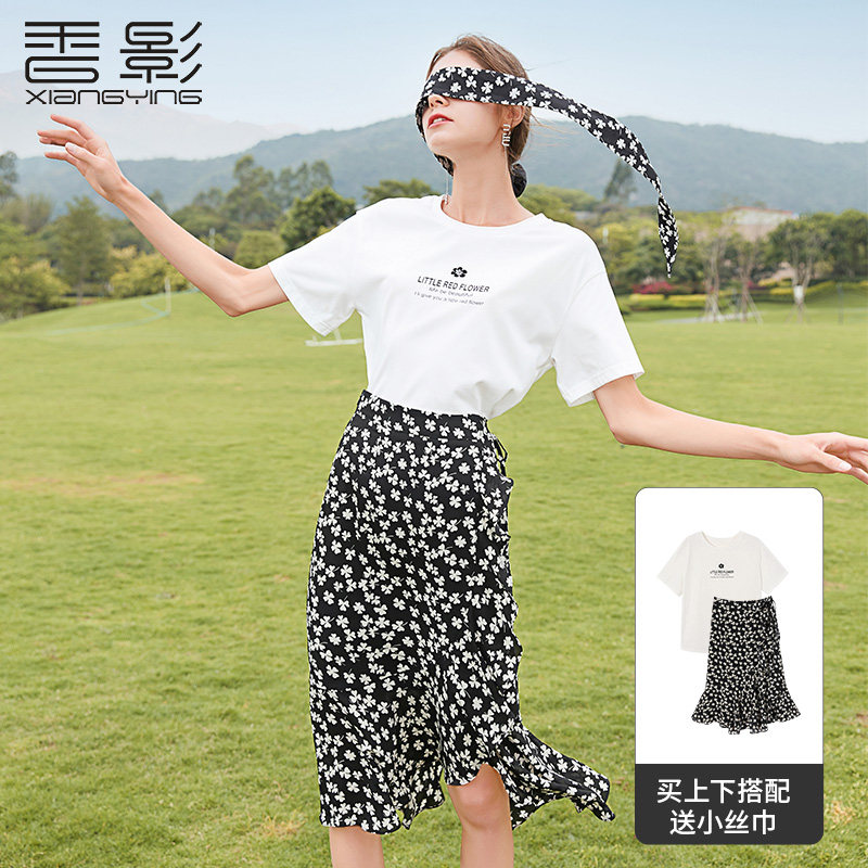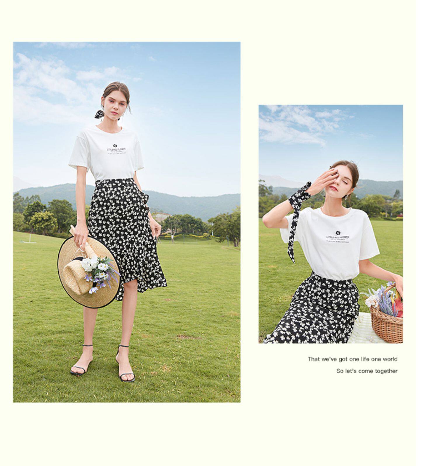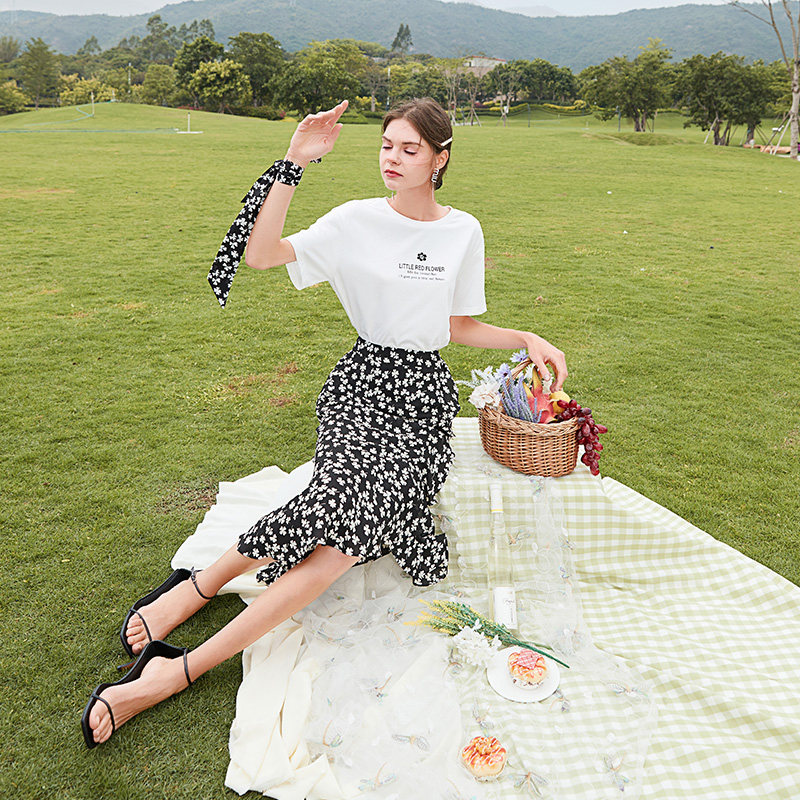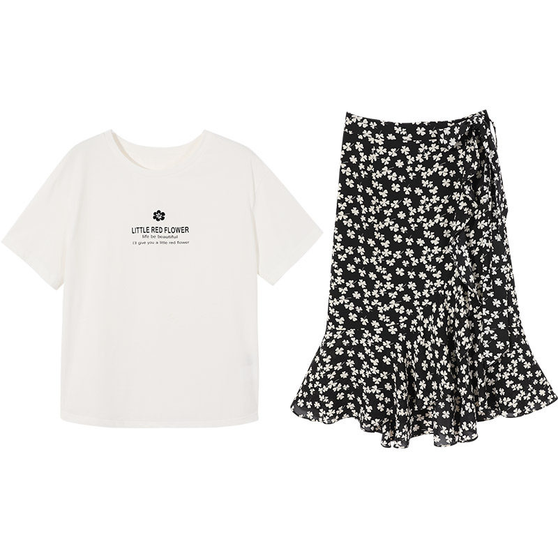 Белая хлопковая футболка с коротким рукавом, черная шифоновая летняя юбка, коллекция 2021, короткий рукав, высокая талия, цветочный принт