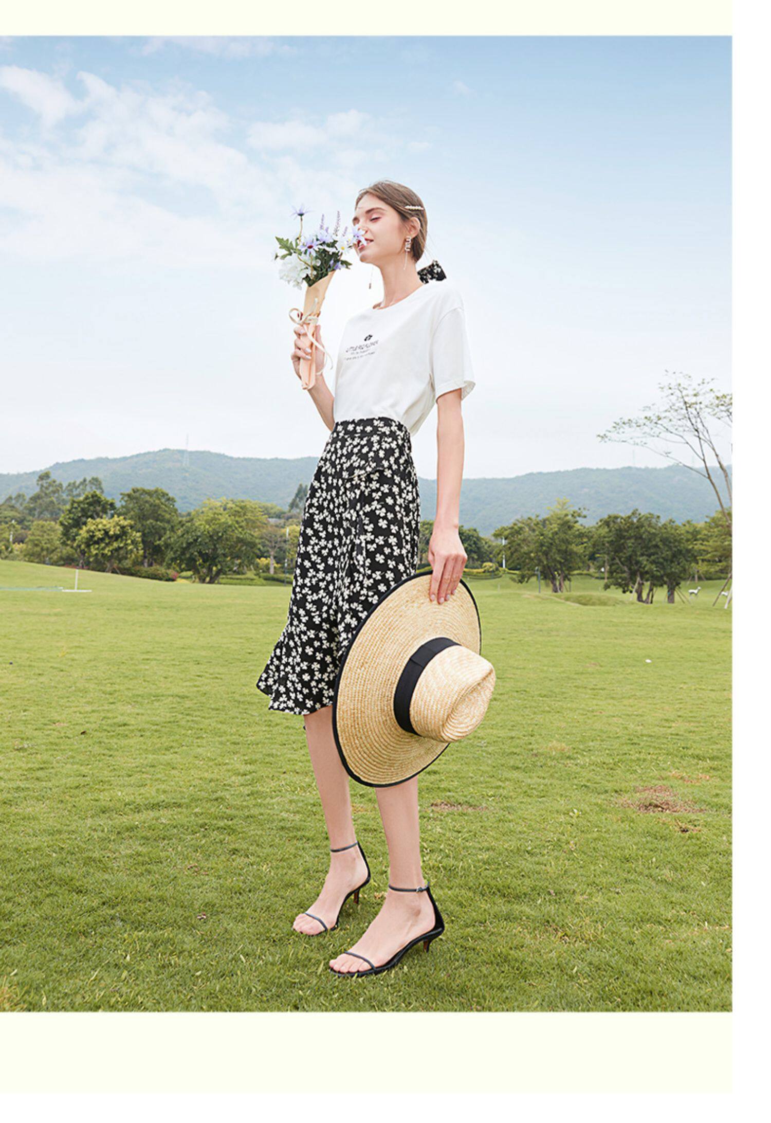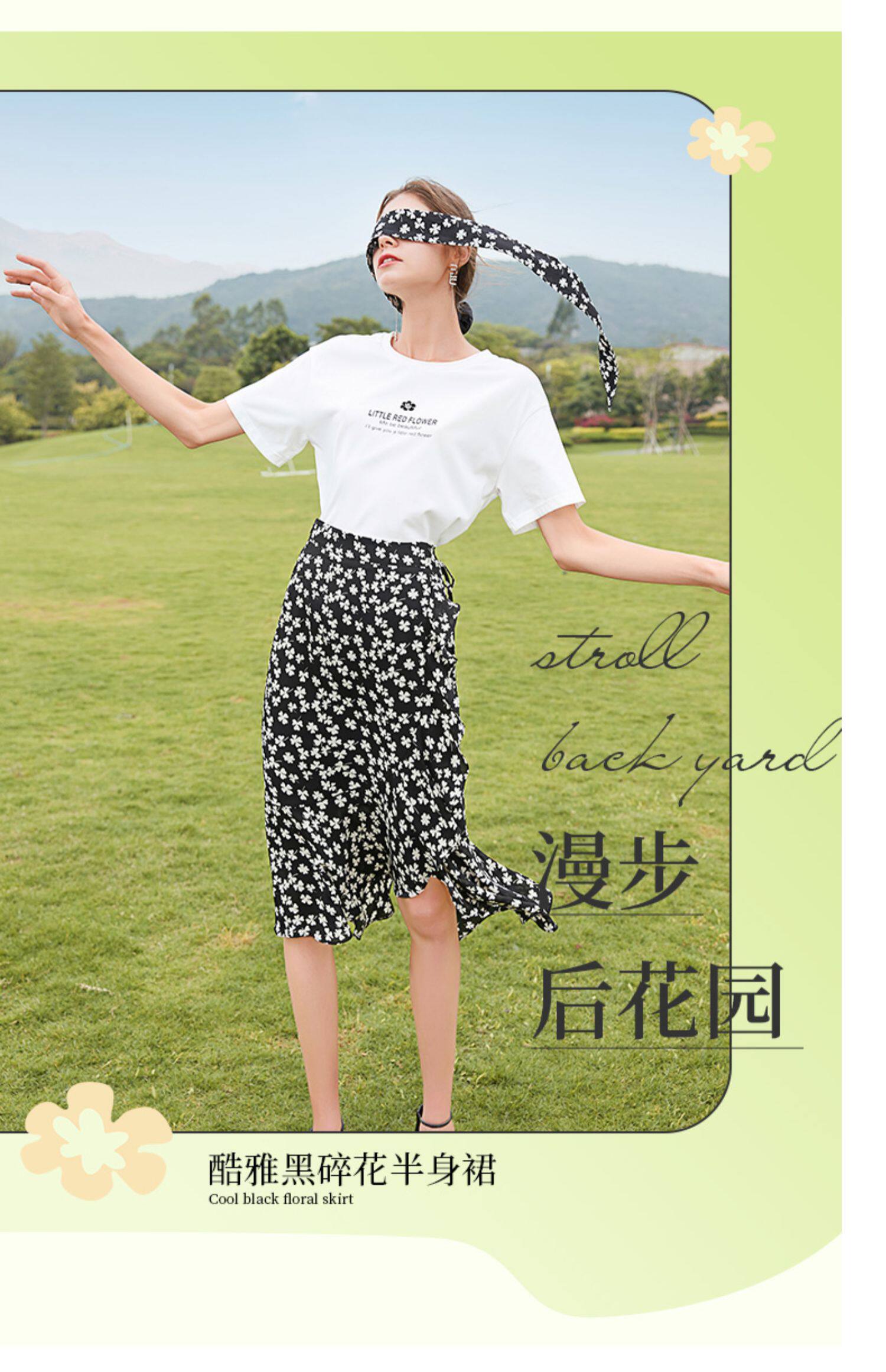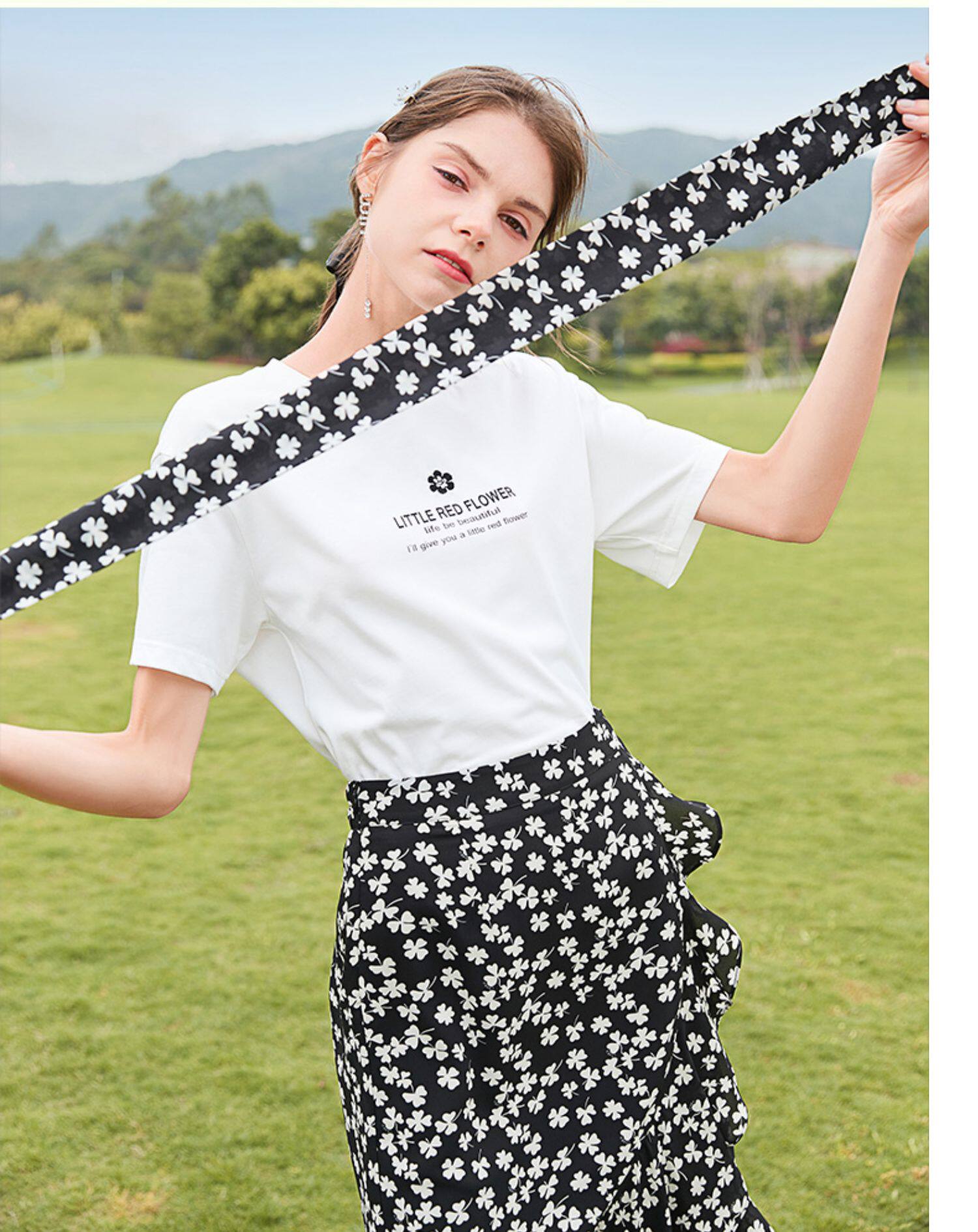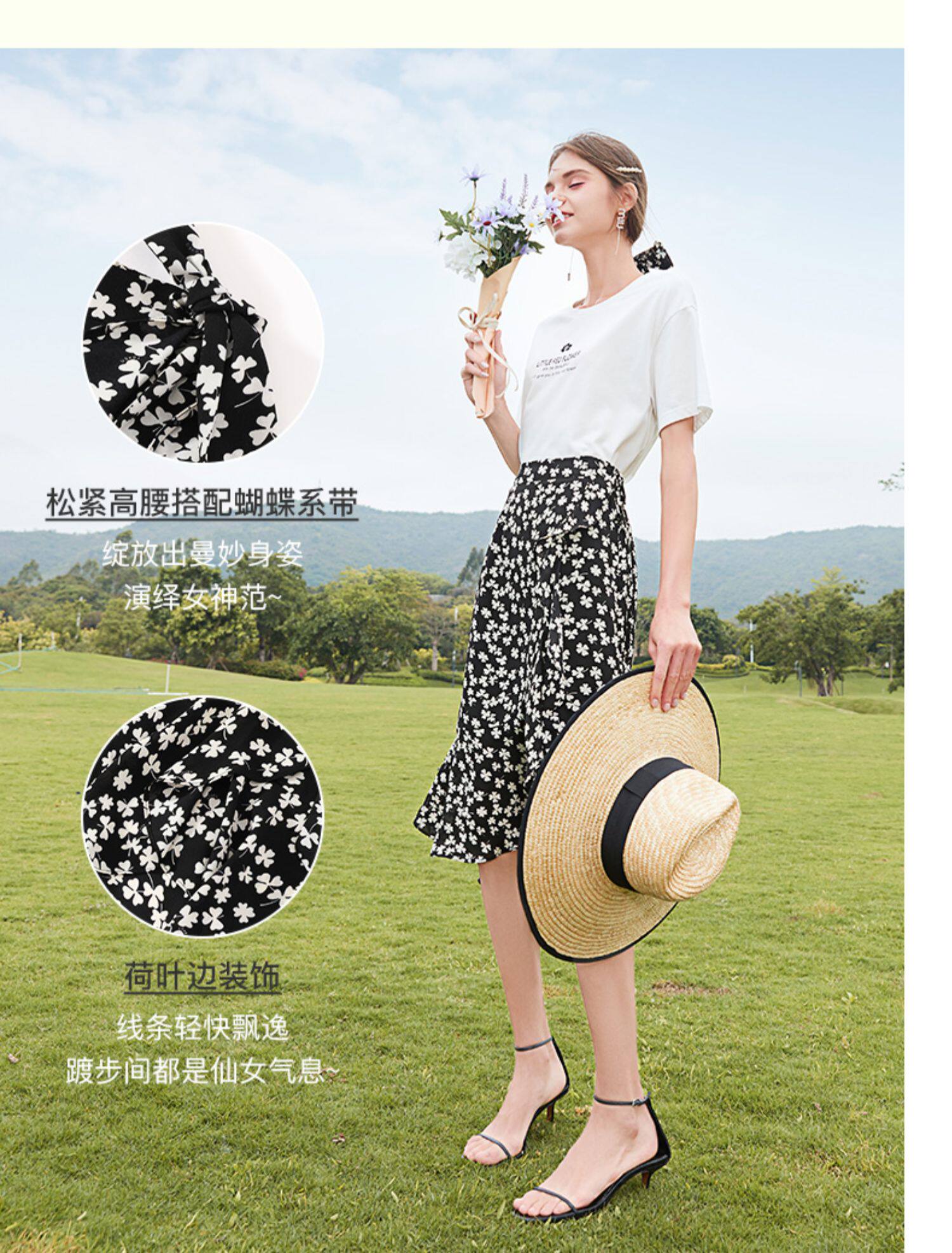 Белая хлопковая футболка с коротким рукавом, черная шифоновая летняя юбка, коллекция 2021, короткий рукав, высокая талия, цветочный принт