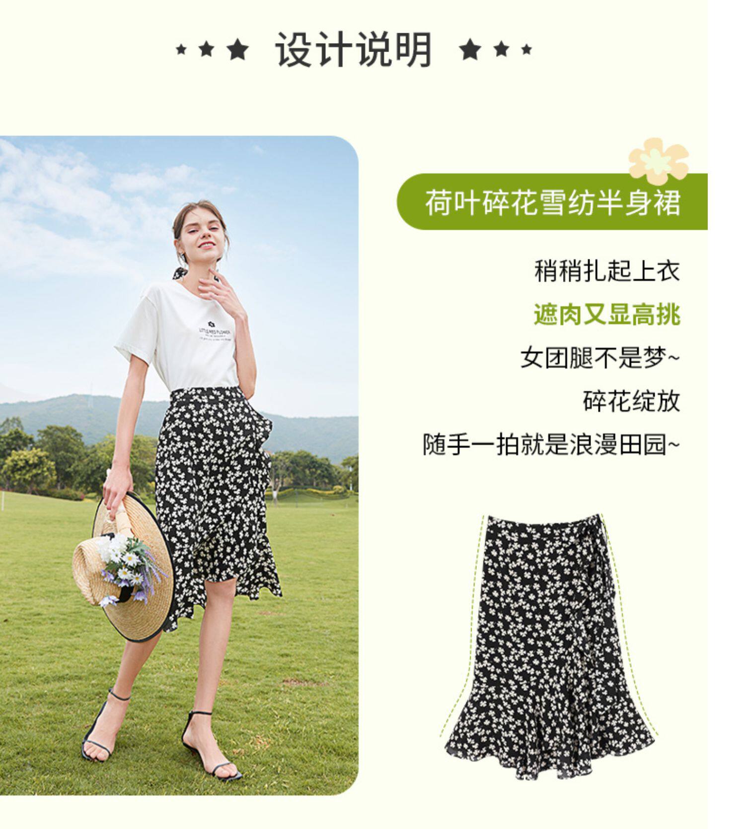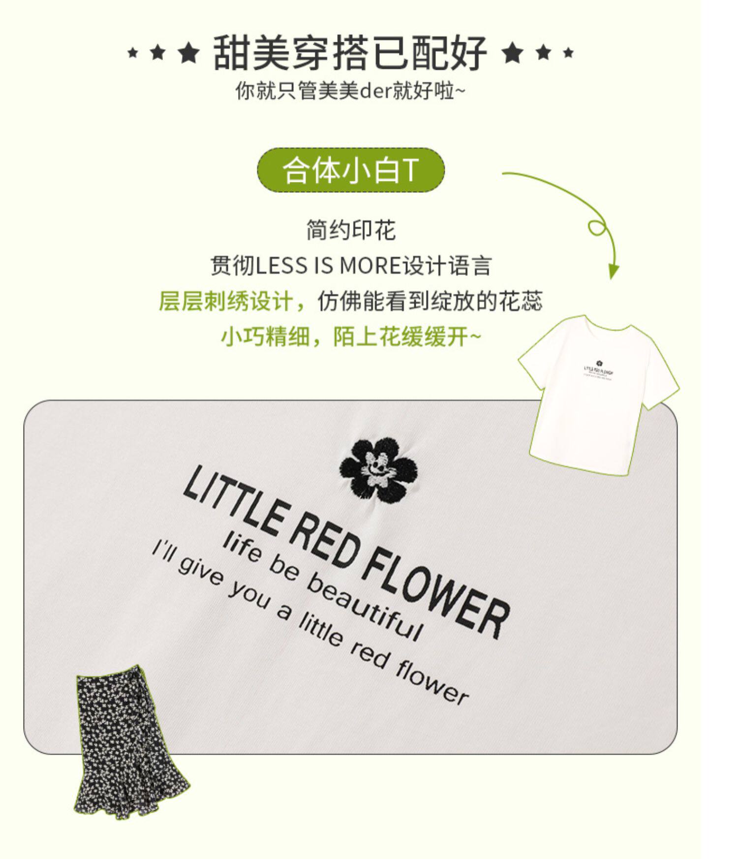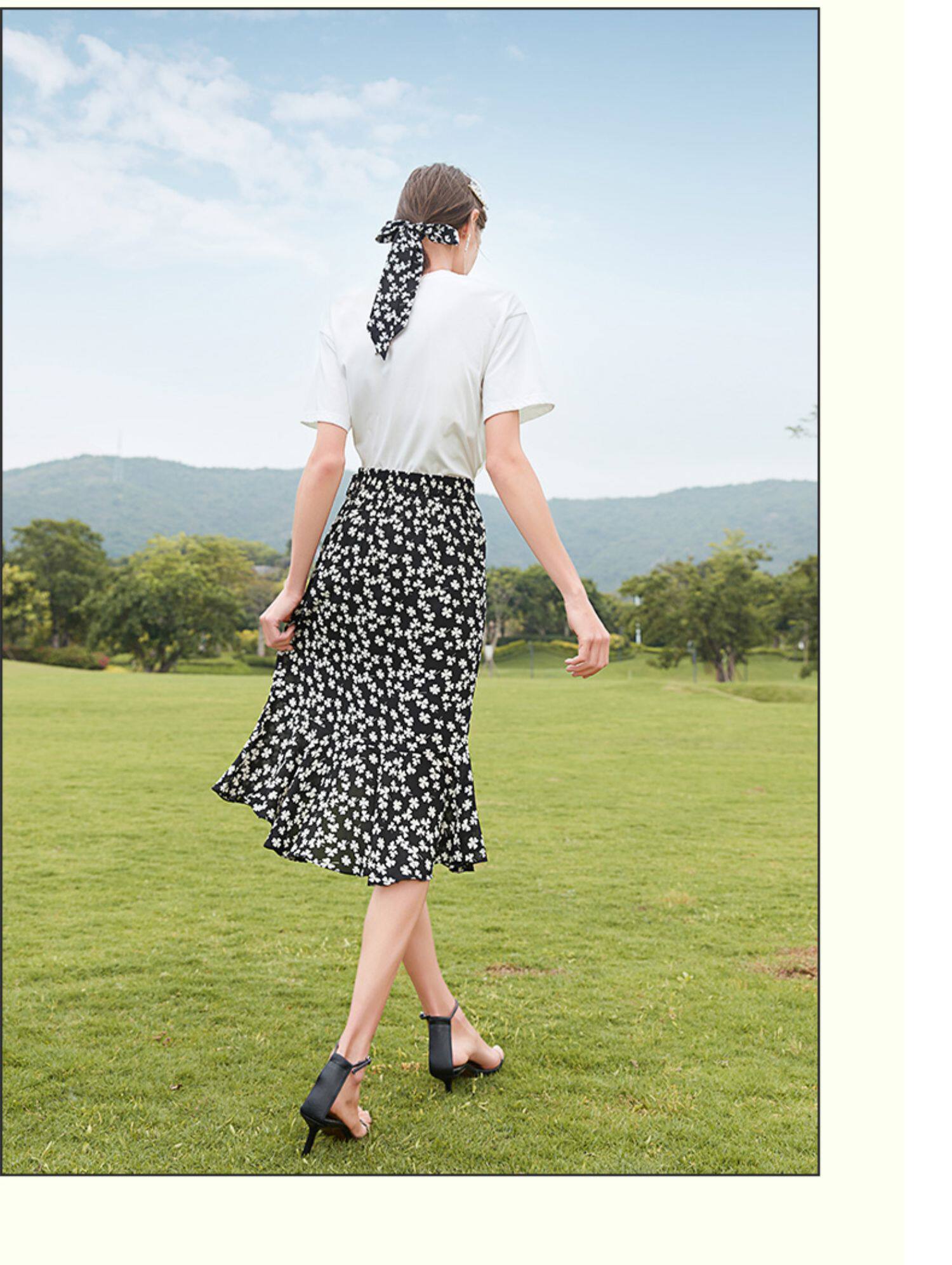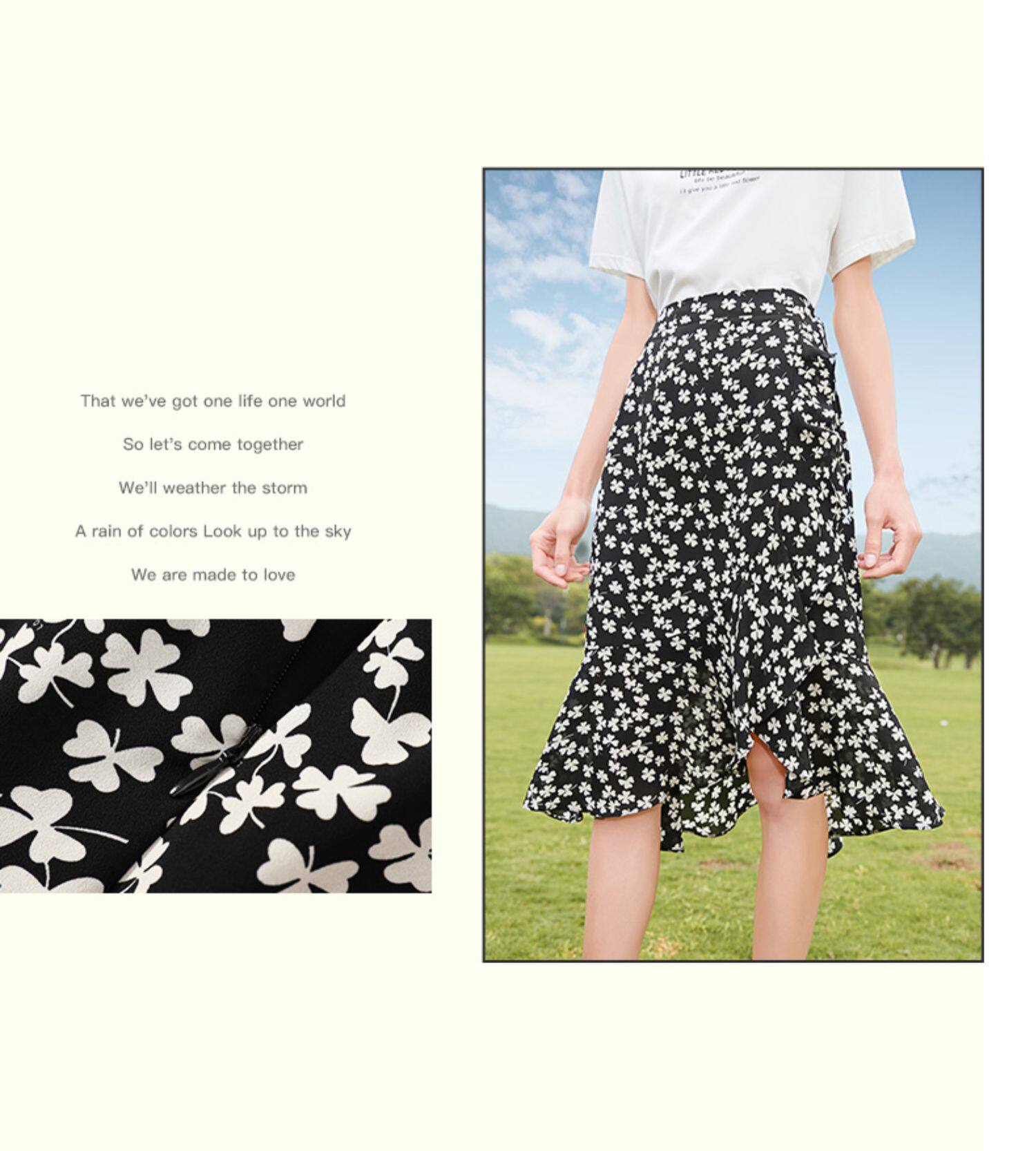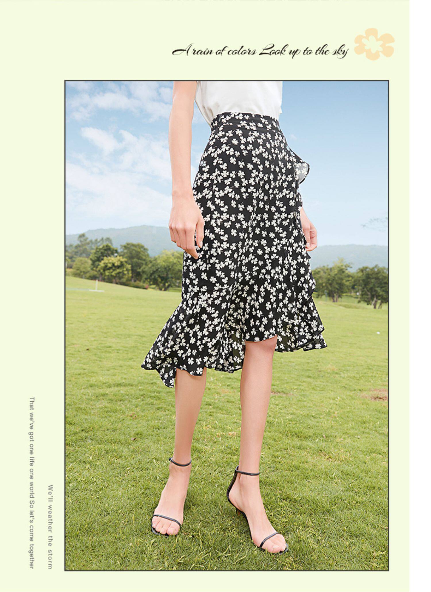 Белая хлопковая футболка с коротким рукавом, черная шифоновая летняя юбка, коллекция 2021, короткий рукав, высокая талия, цветочный принт