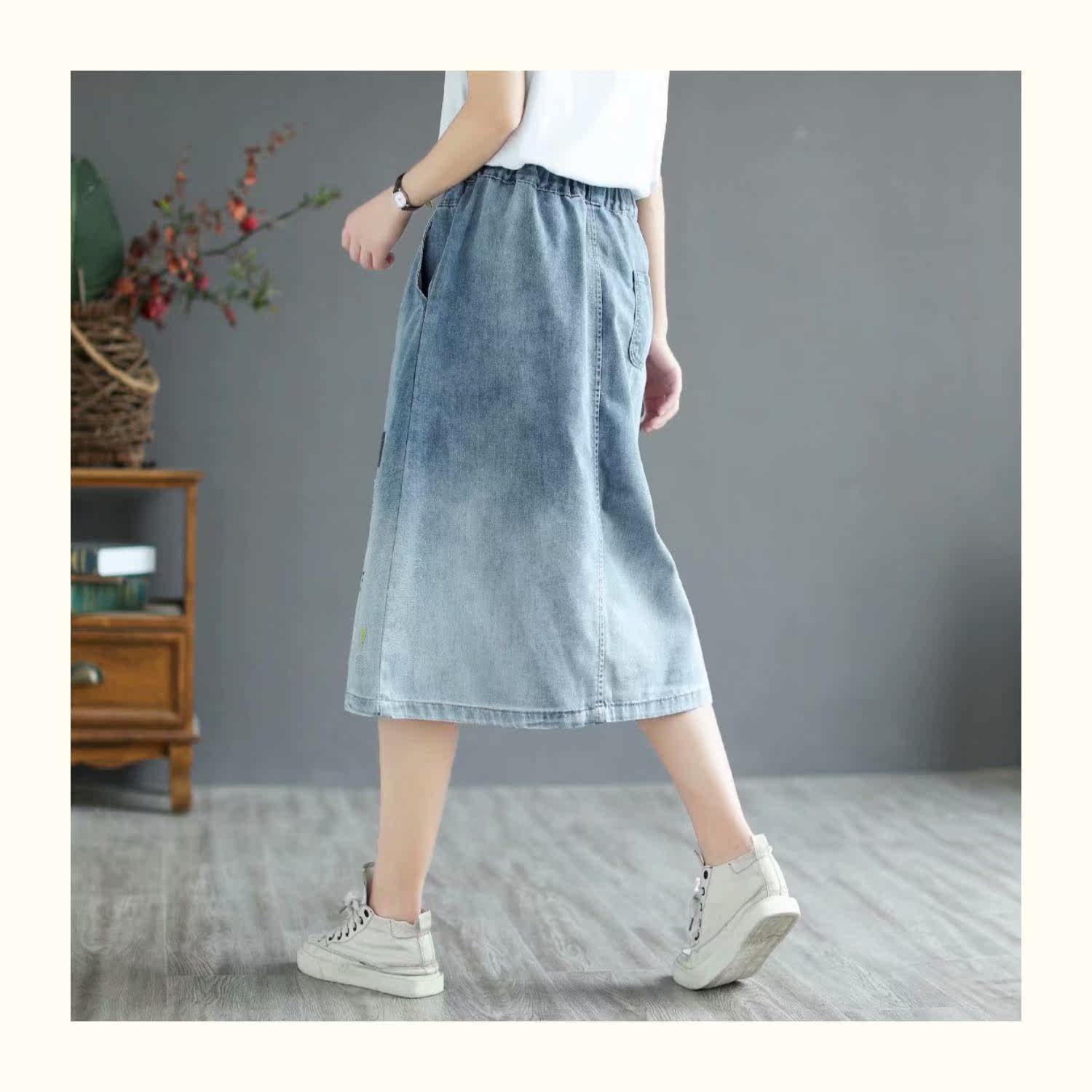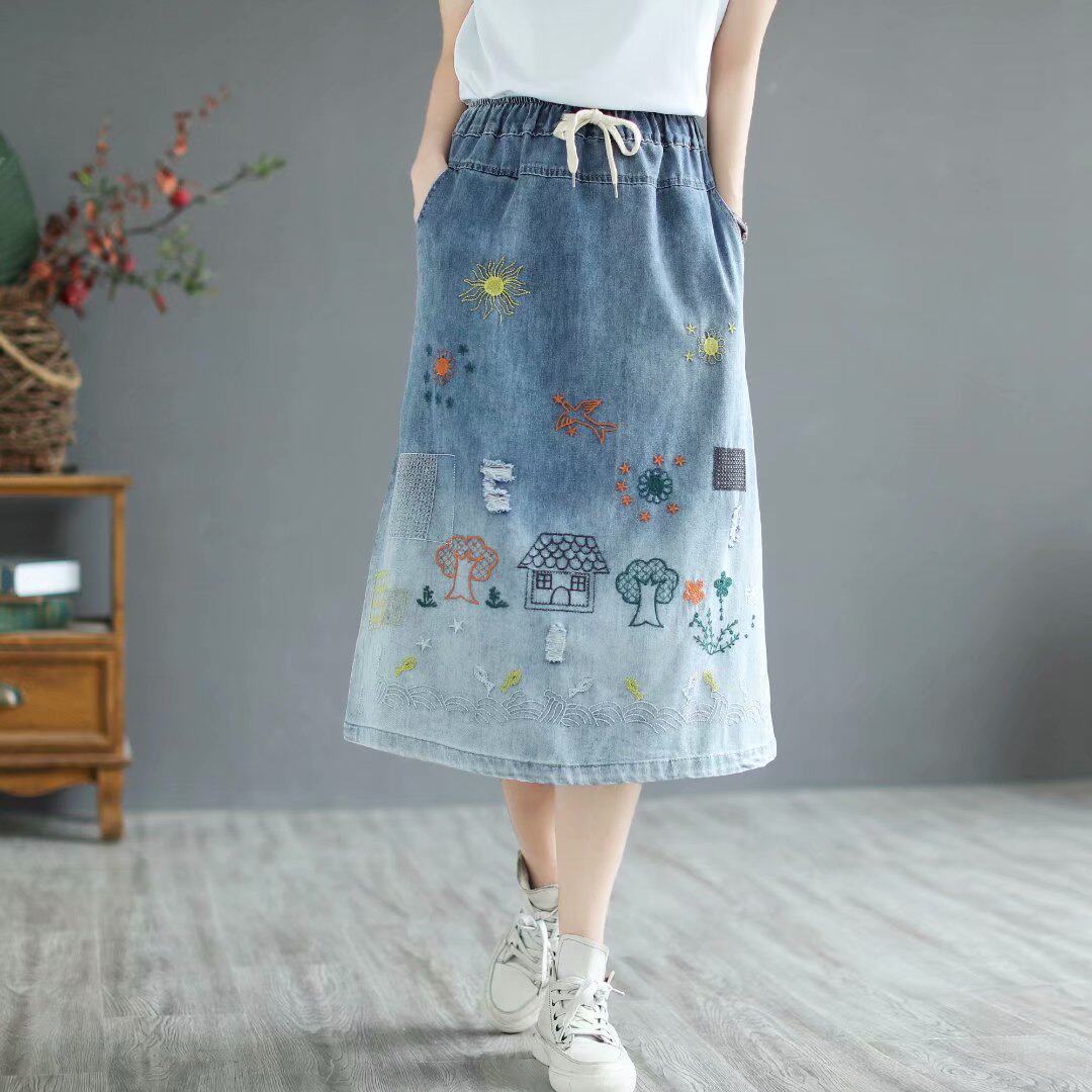 Летняя хлопковая джинсовая юбка для отдыха, коллекция 2021, оверсайз, с вышивкой