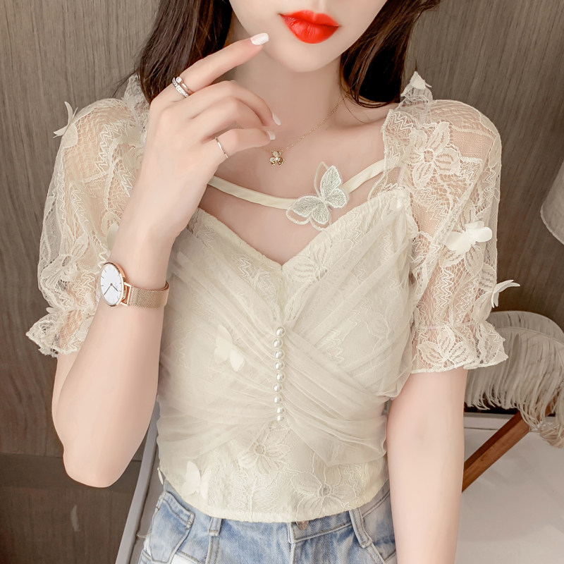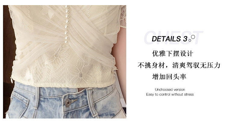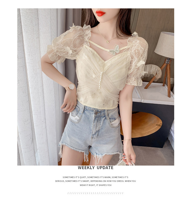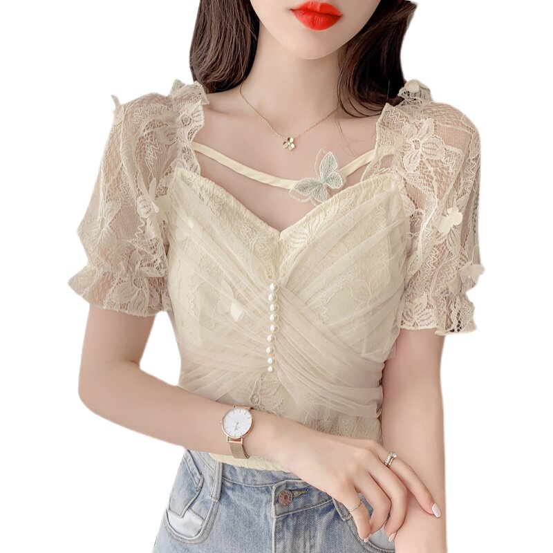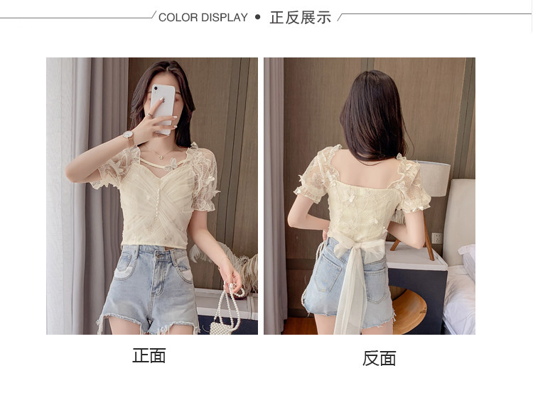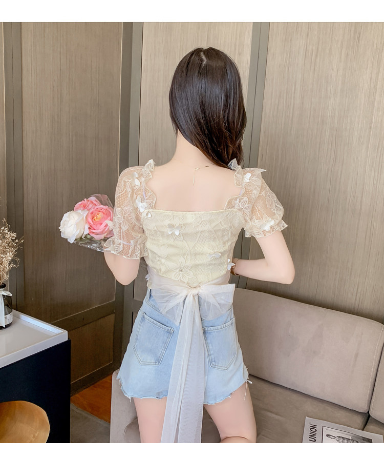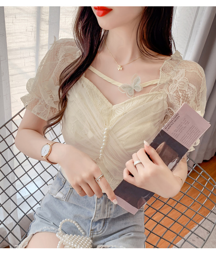 Дизайнерская шифоновая кружевная короткая летняя рубашка с бантиком, тренд сезона, французский стиль