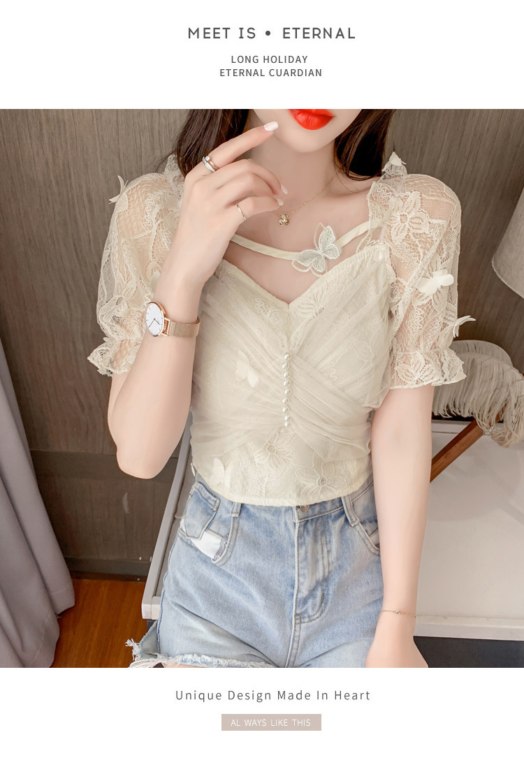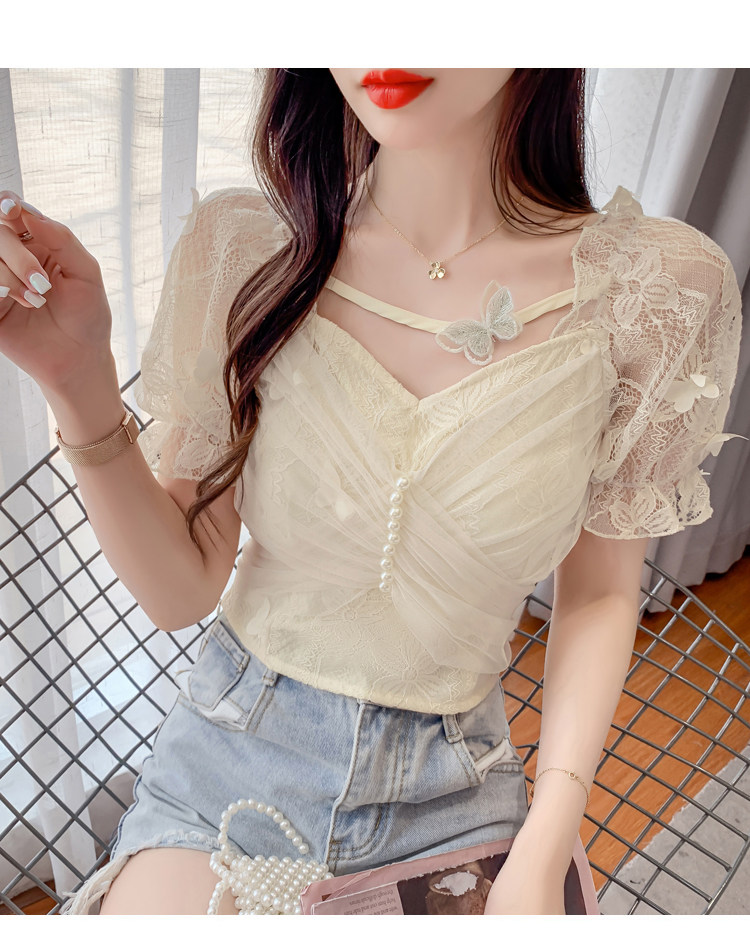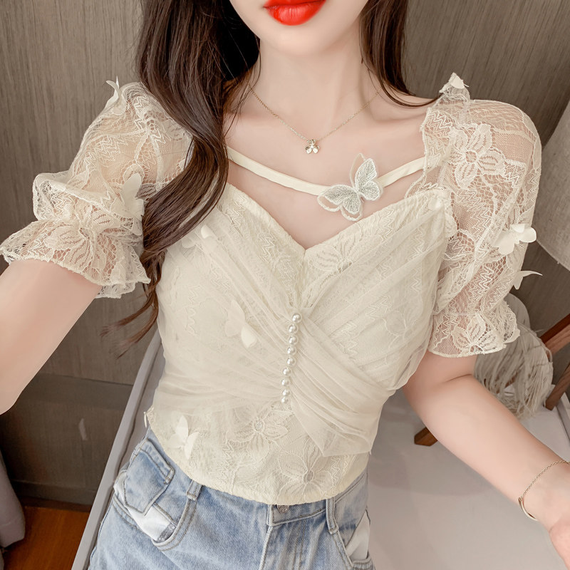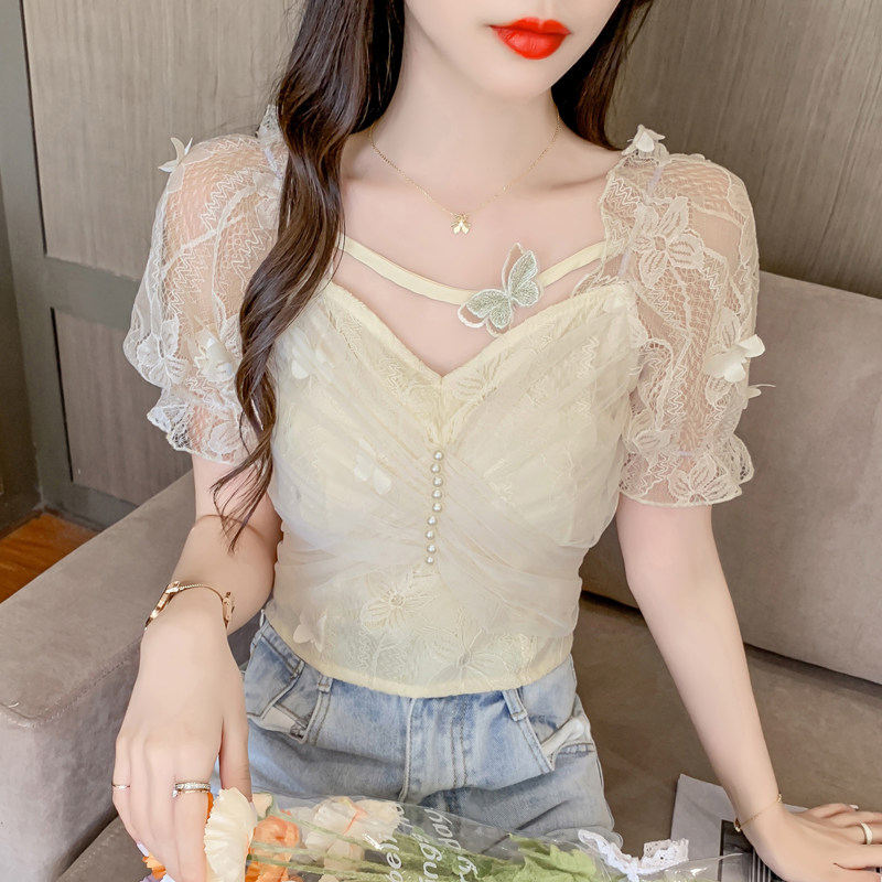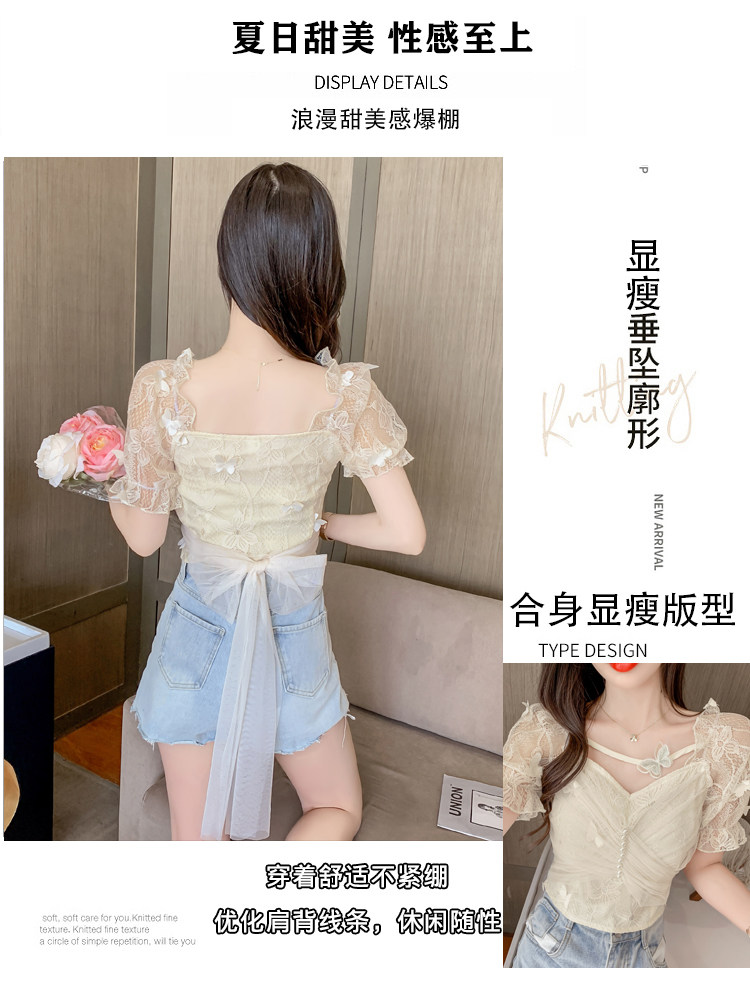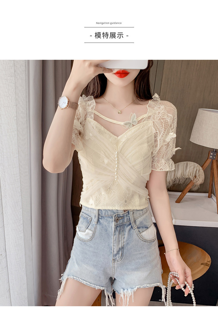 Дизайнерская шифоновая кружевная короткая летняя рубашка с бантиком, тренд сезона, французский стиль