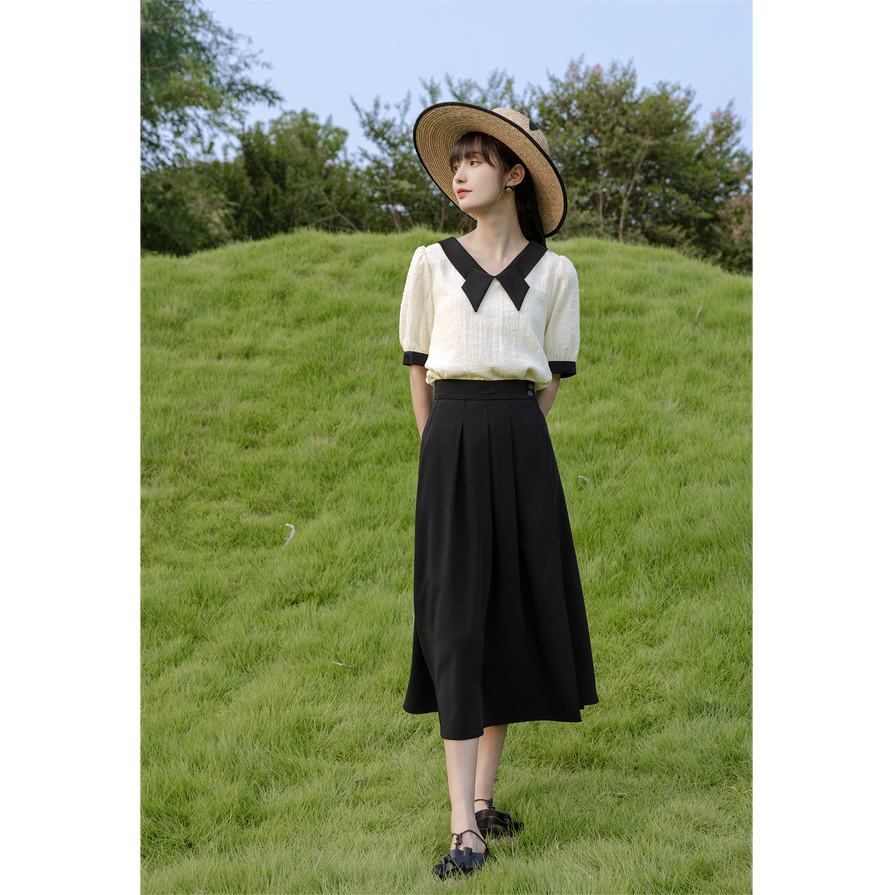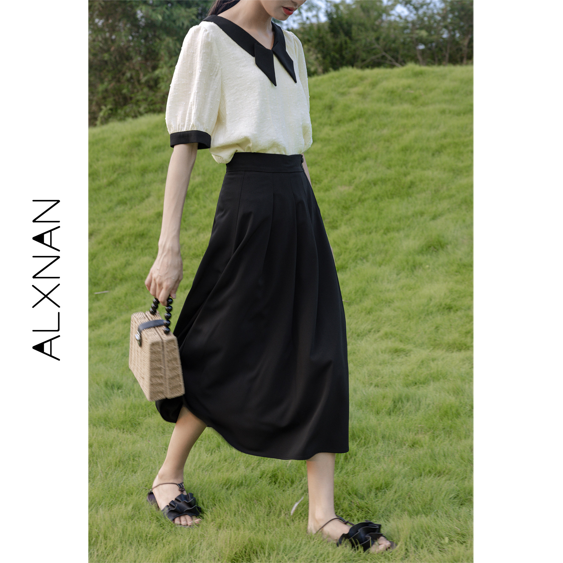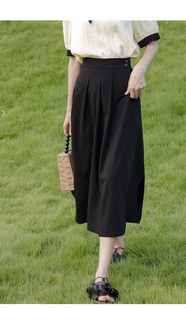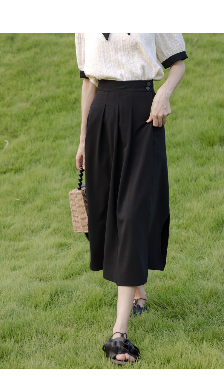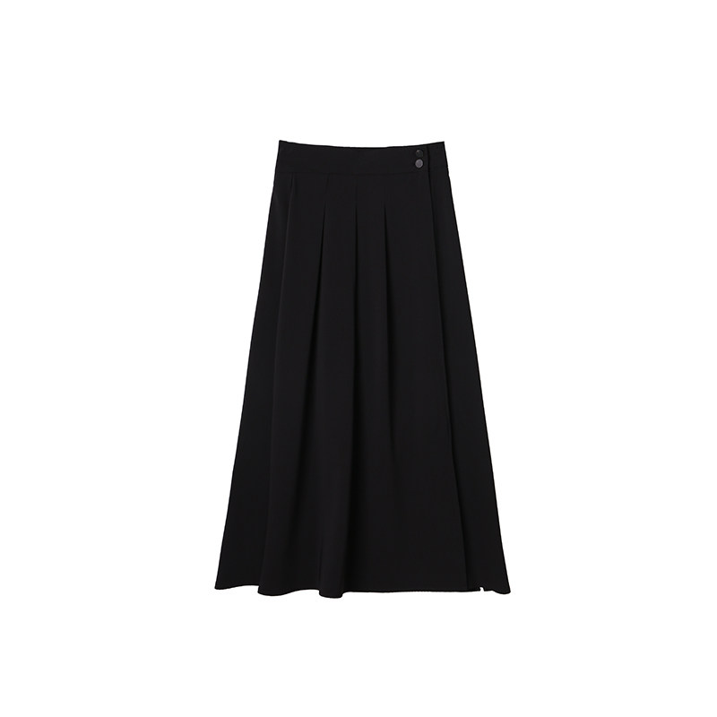 鹿向南 Длинная летняя тонкая черная юбка в складку, средней длины, А-силуэт