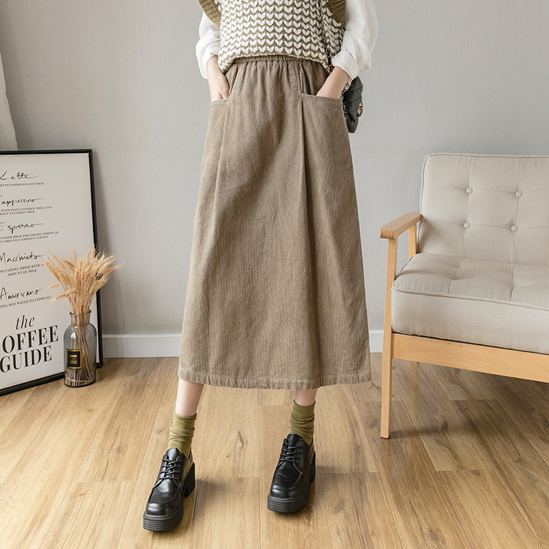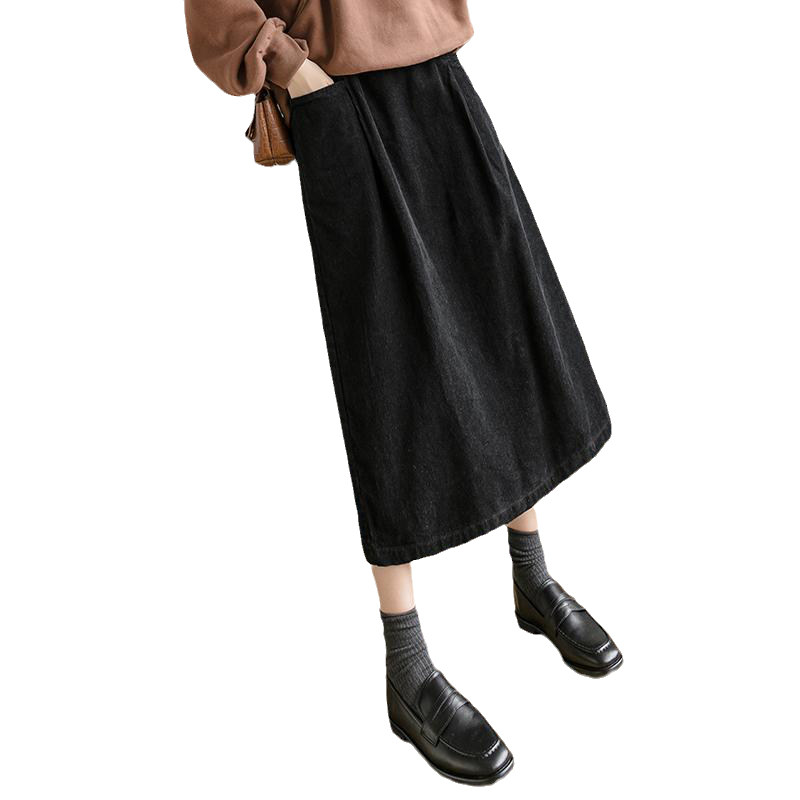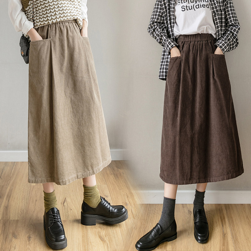 Ретро японская вельветовая демисезонная длинная приталенная длинная юбка, высокая талия, А-силуэт