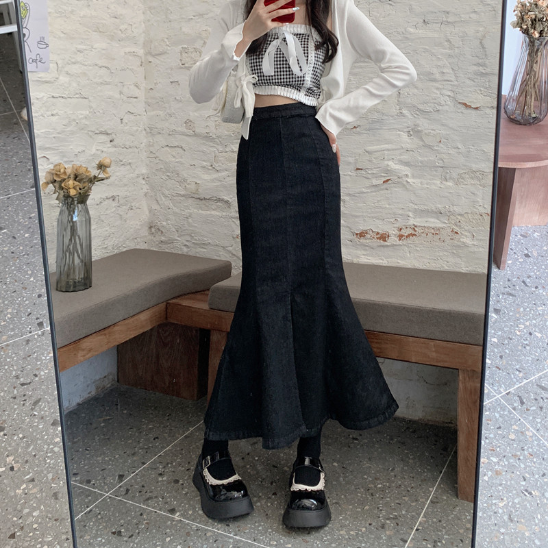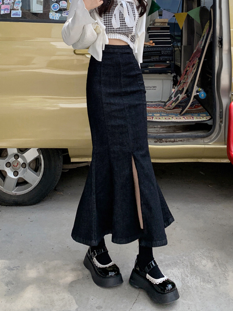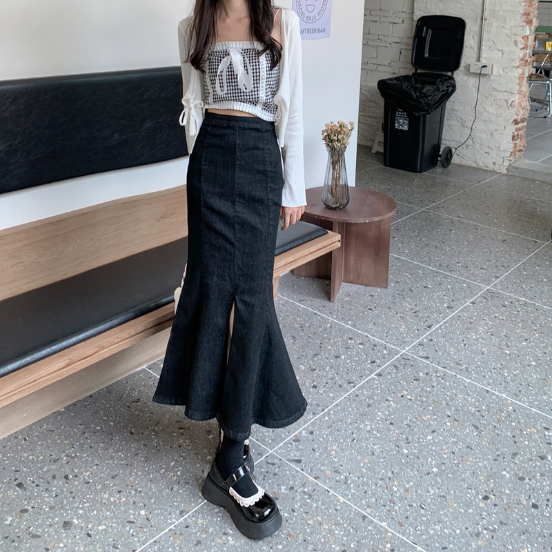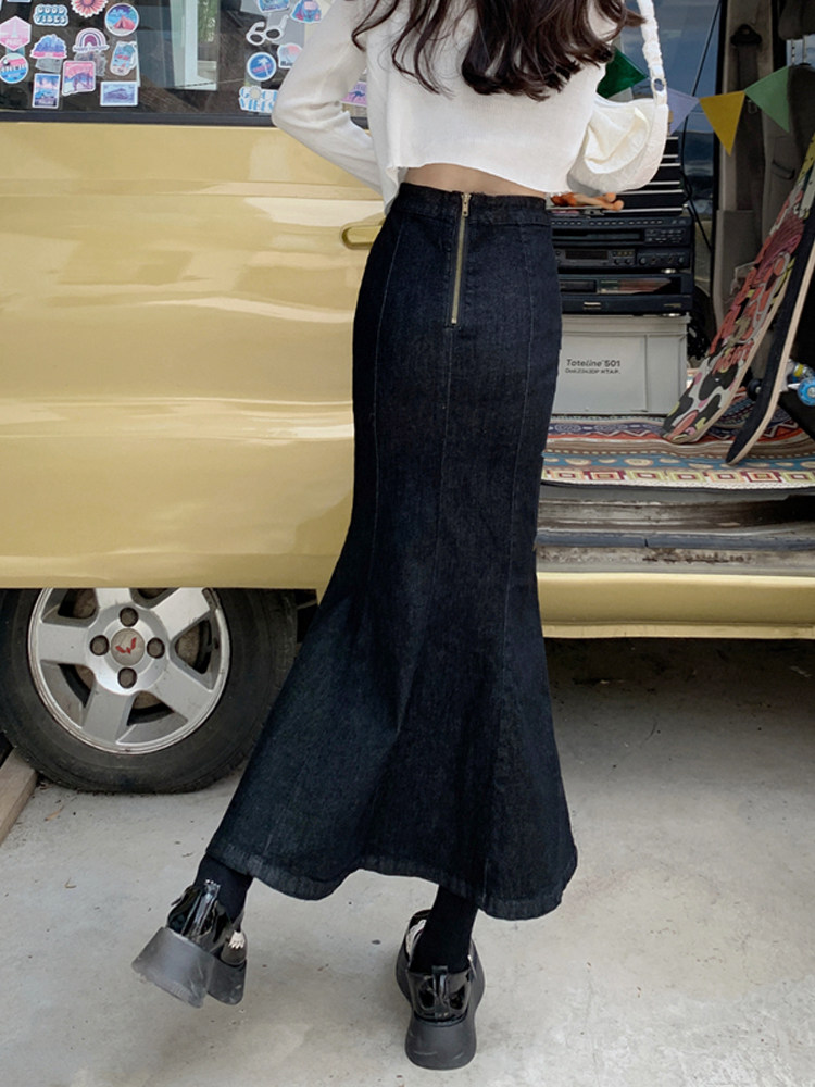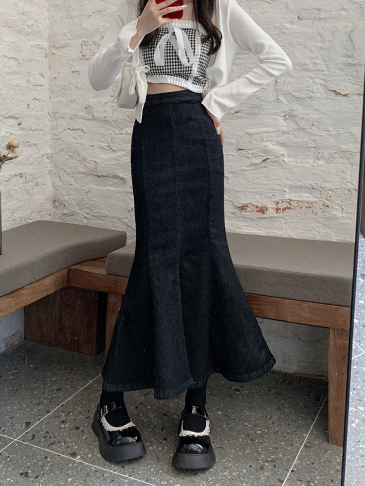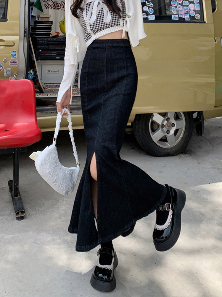 Черная демисезонная джинсовая юбка, с акцентом на бедрах, средней длины, высокая талия, рыбий хвост, А-силуэт