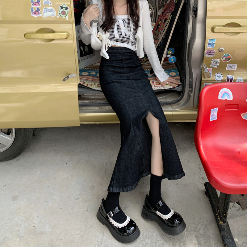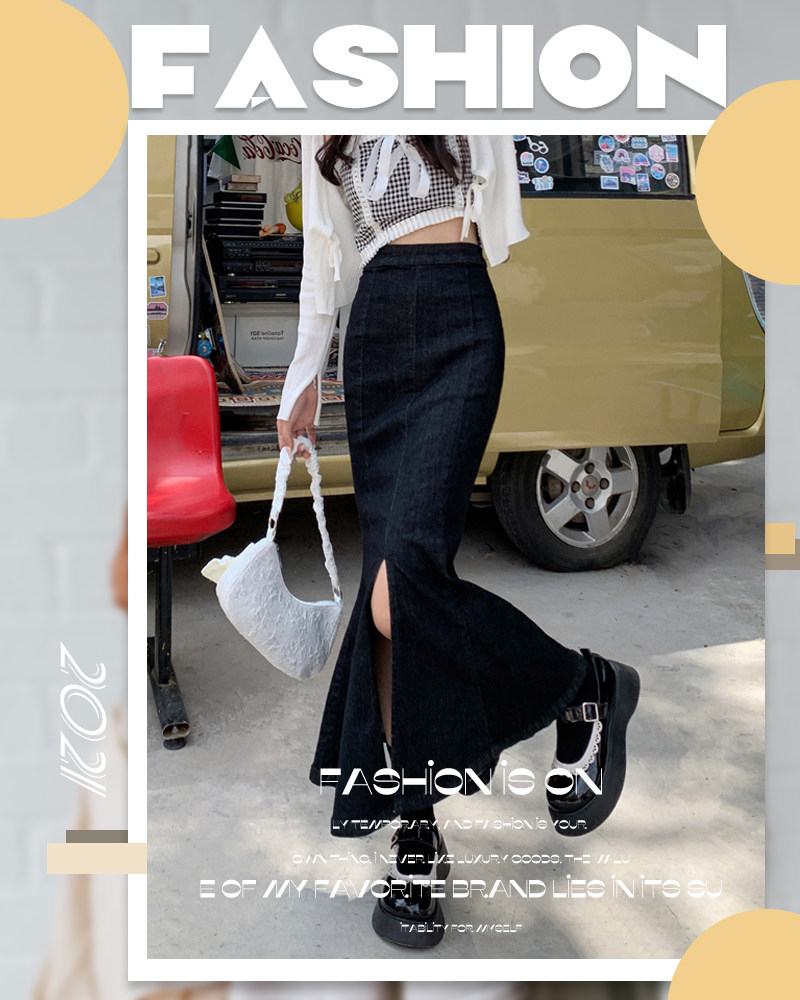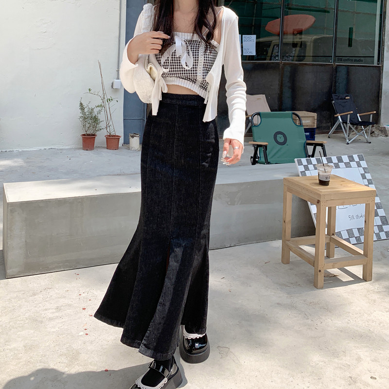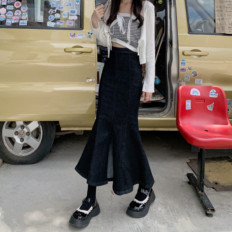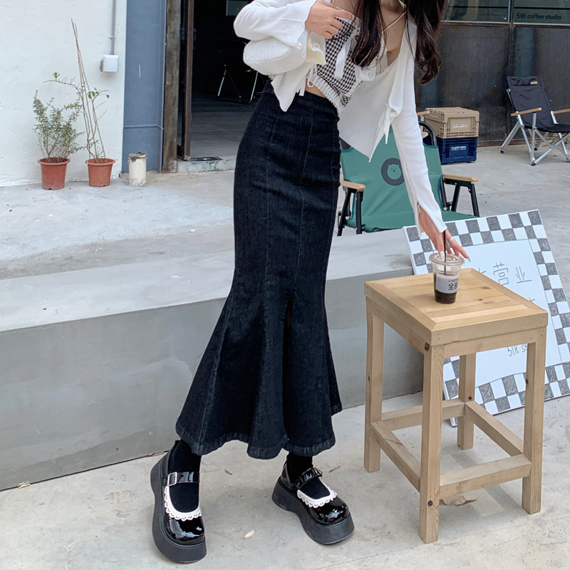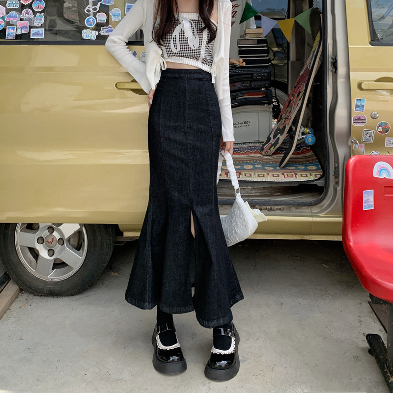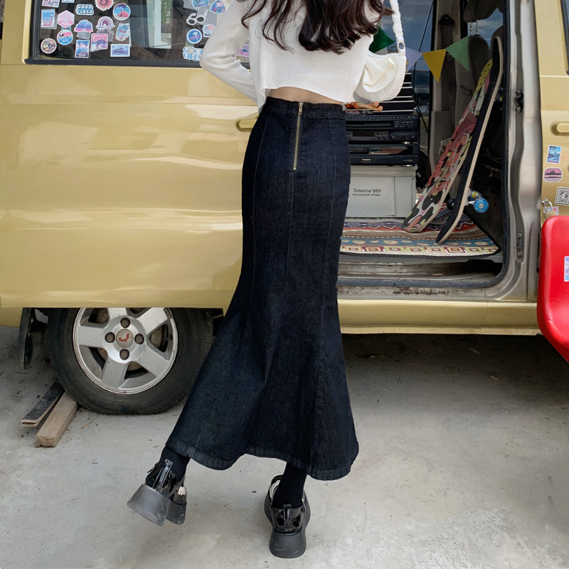 Черная демисезонная джинсовая юбка, с акцентом на бедрах, средней длины, высокая талия, рыбий хвост, А-силуэт