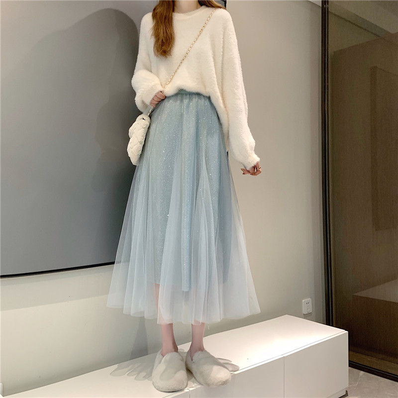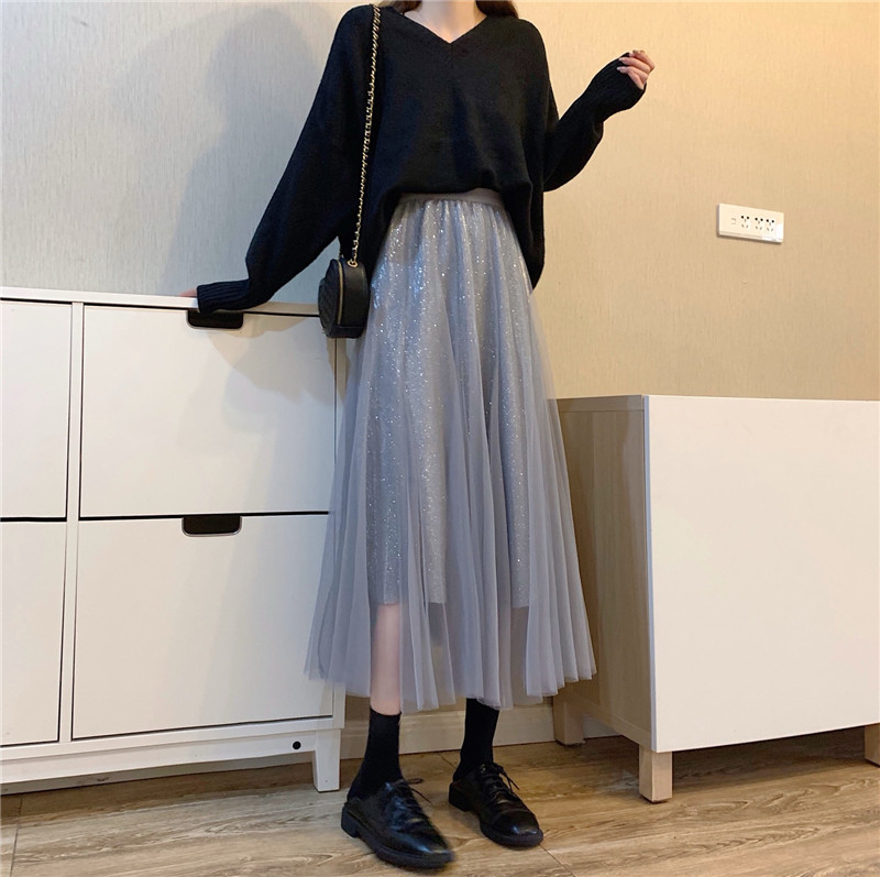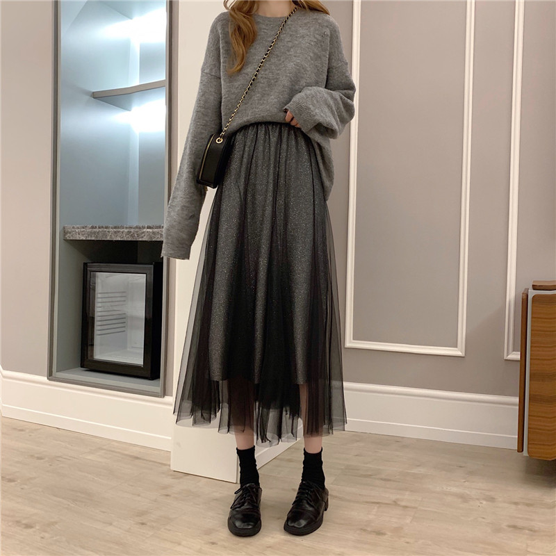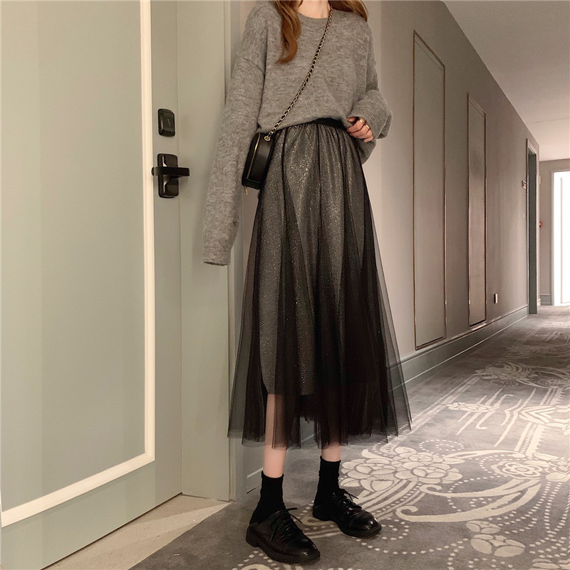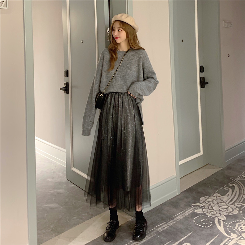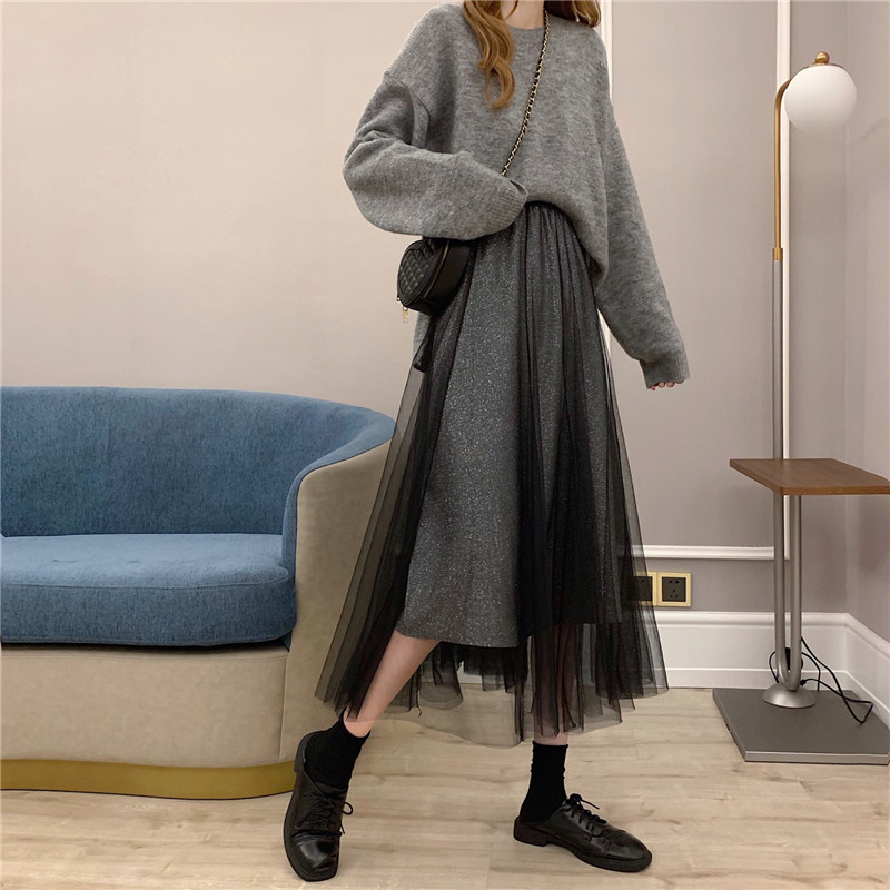 Шерстяной осенний свитер, длинная юбка в складку, коллекция 2022, средней длины, высокая талия