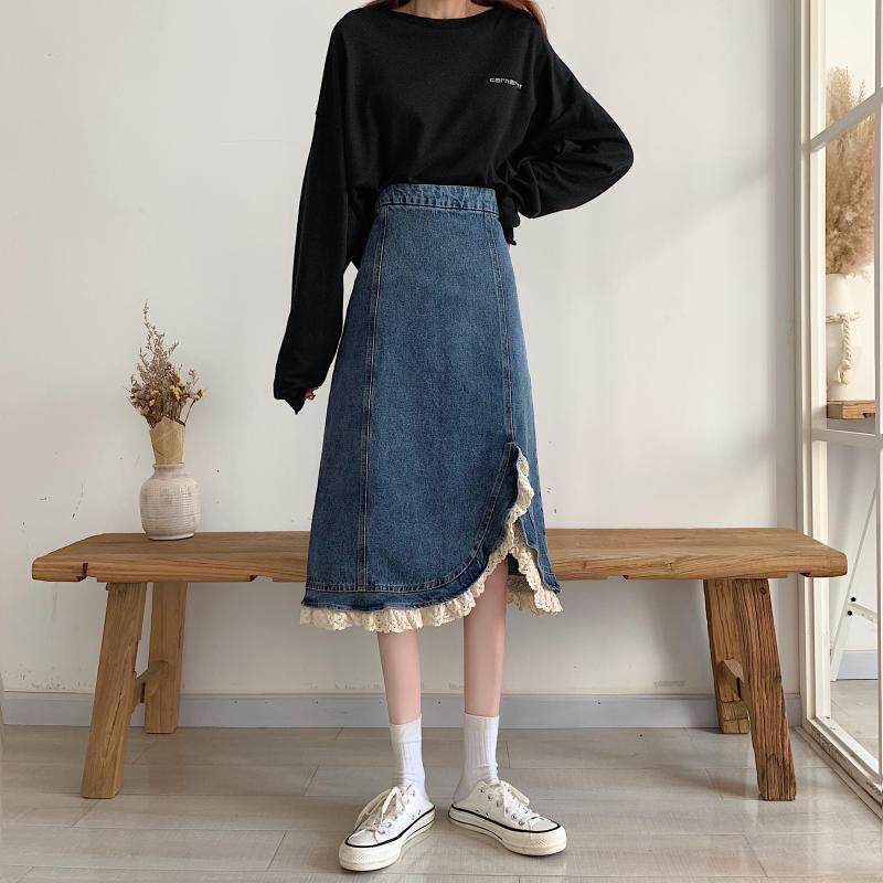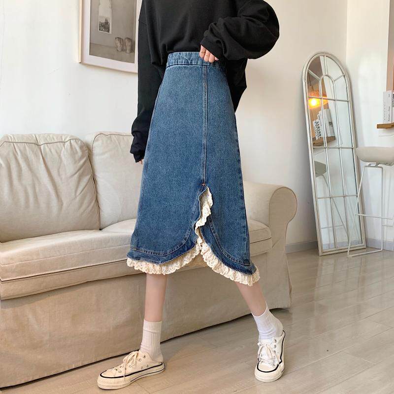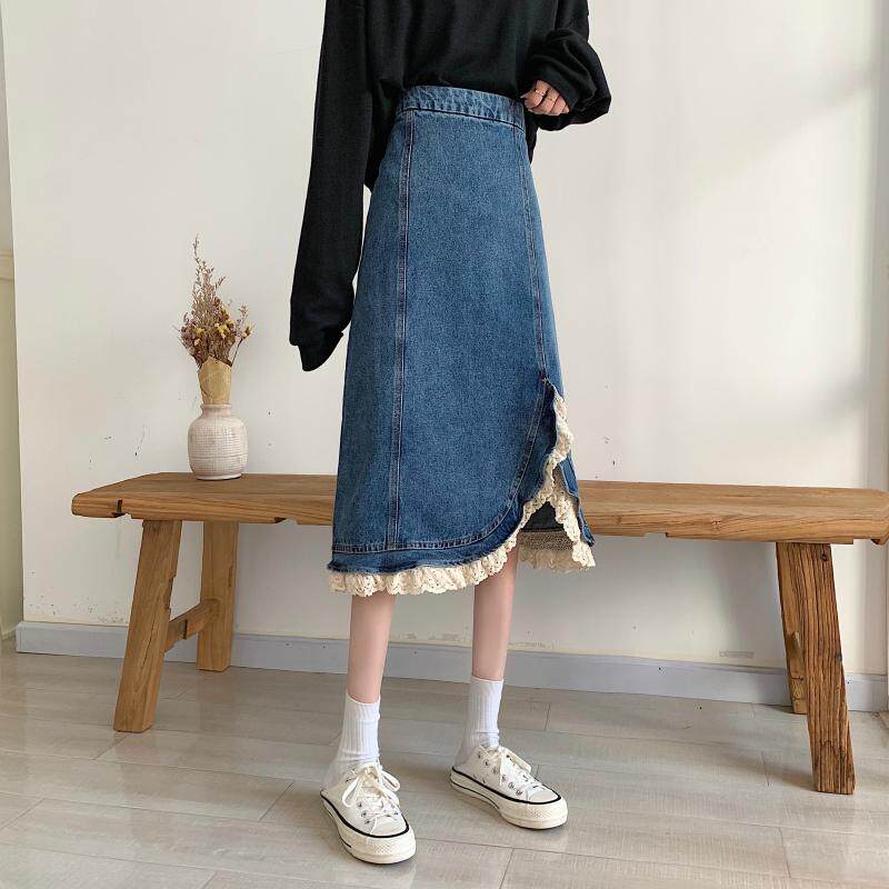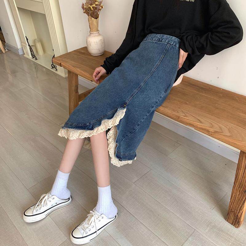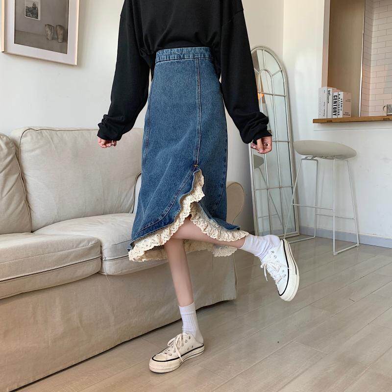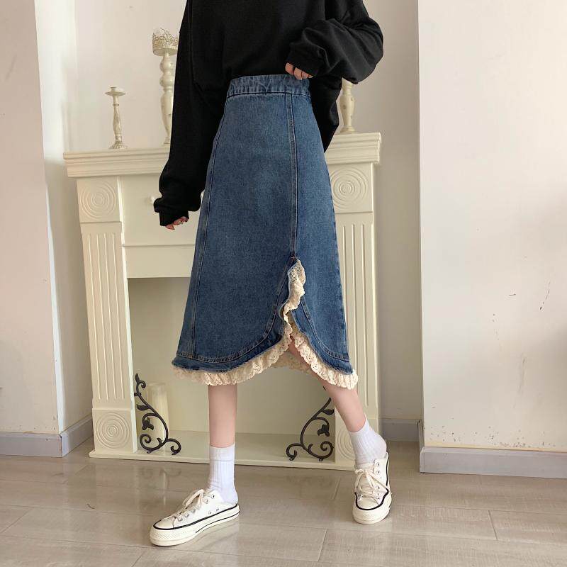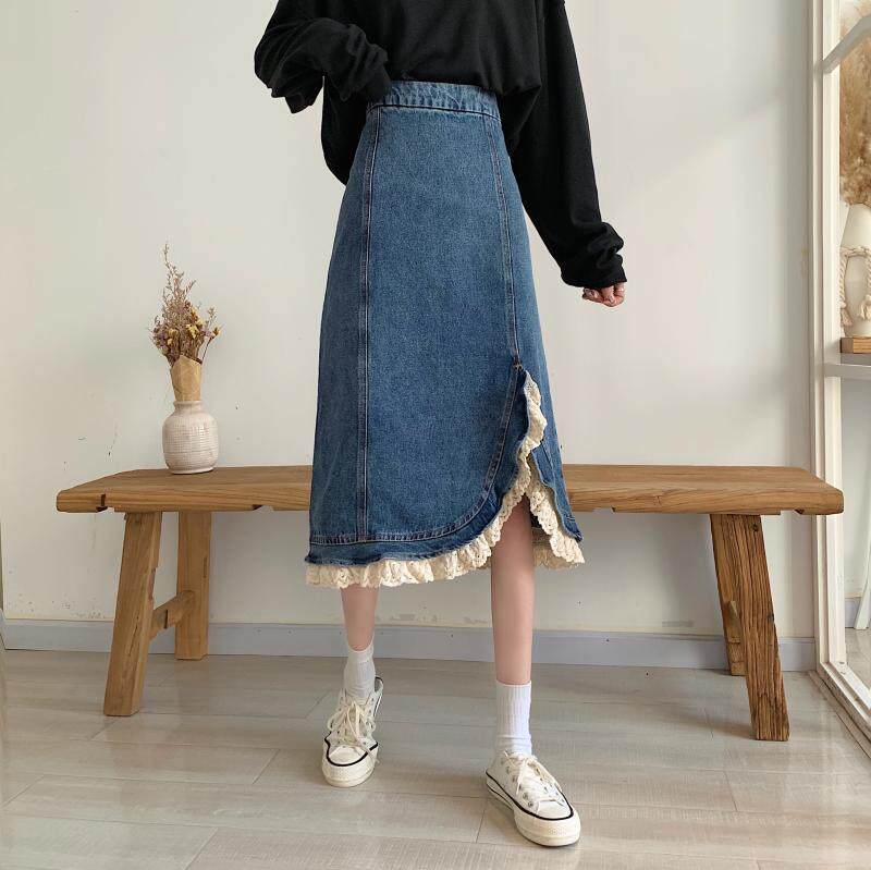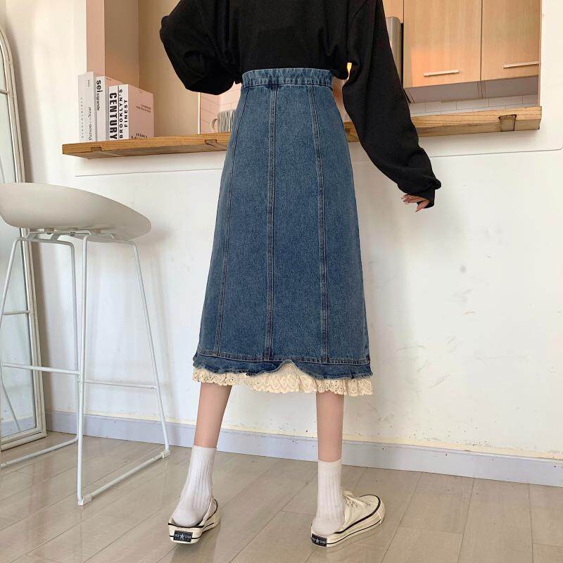 Приталенная ретро кружевная демисезонная длинная дизайнерская джинсовая юбка, высокая талия, тренд сезона, с акцентом на бедрах
