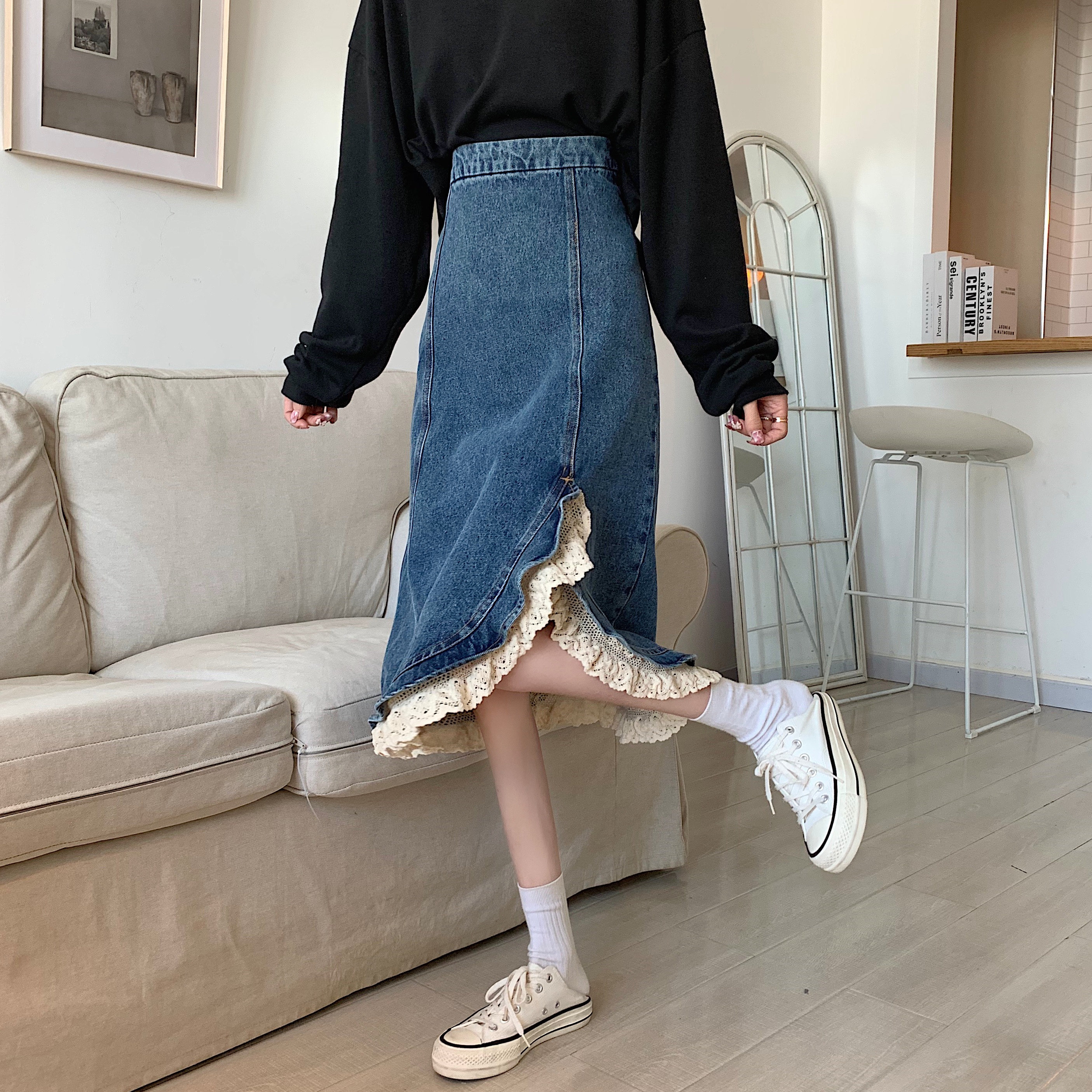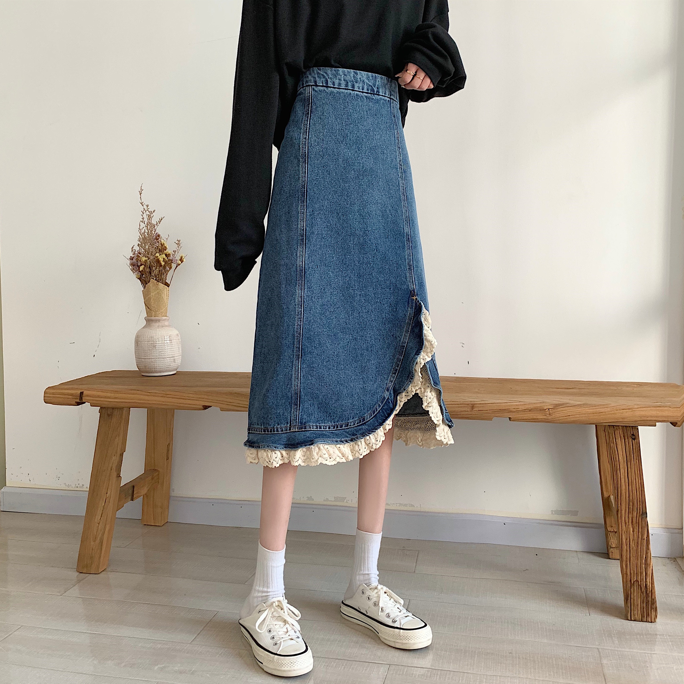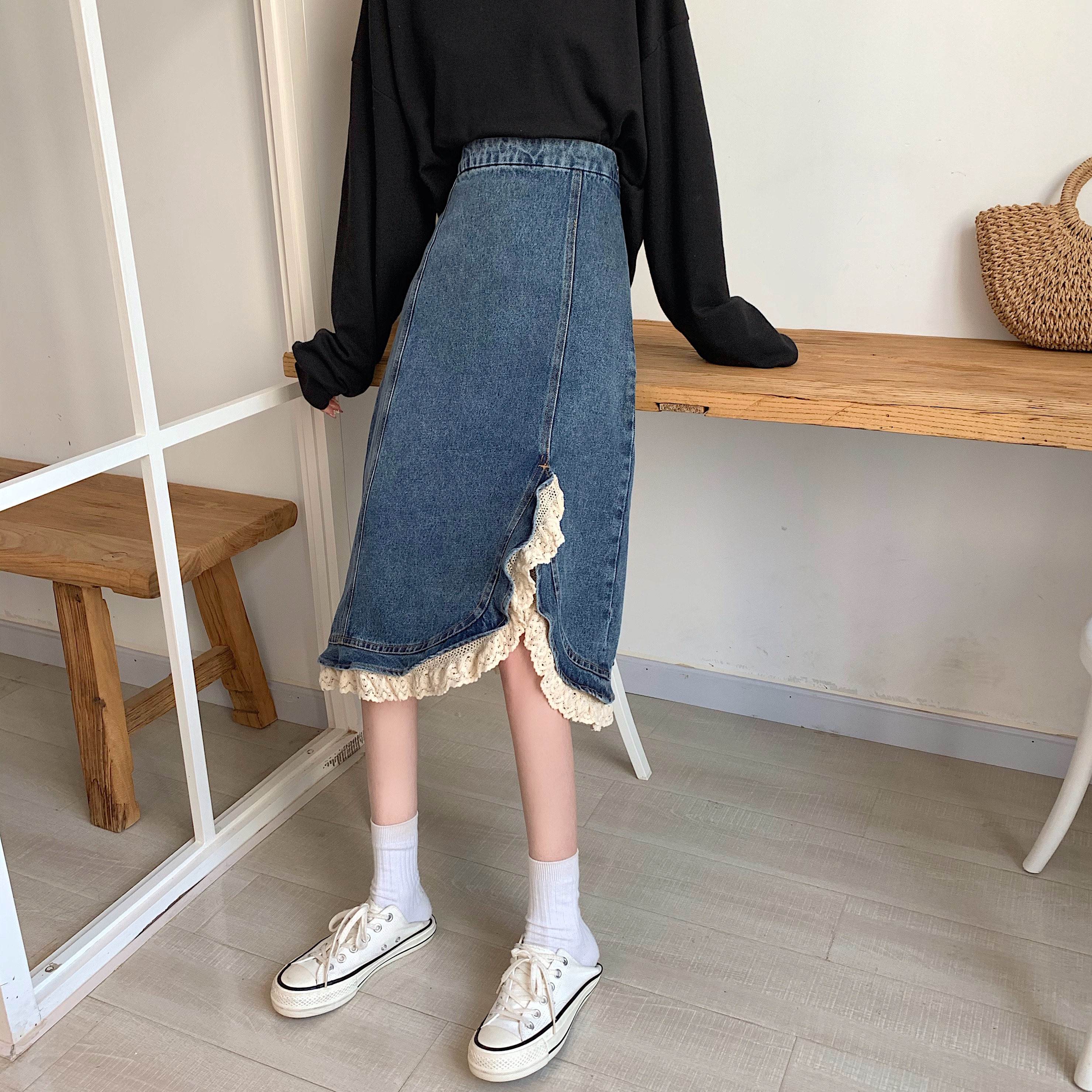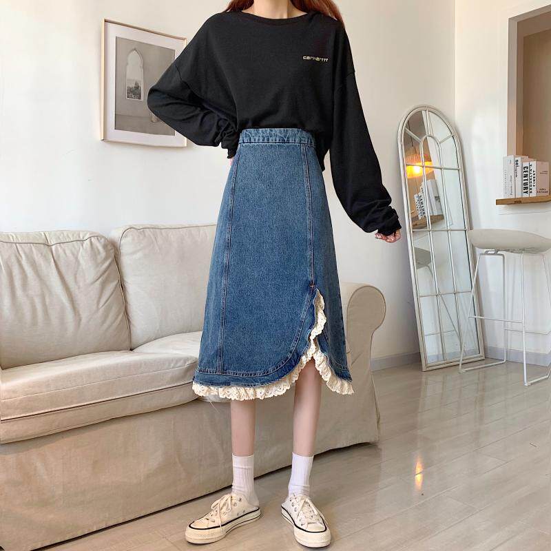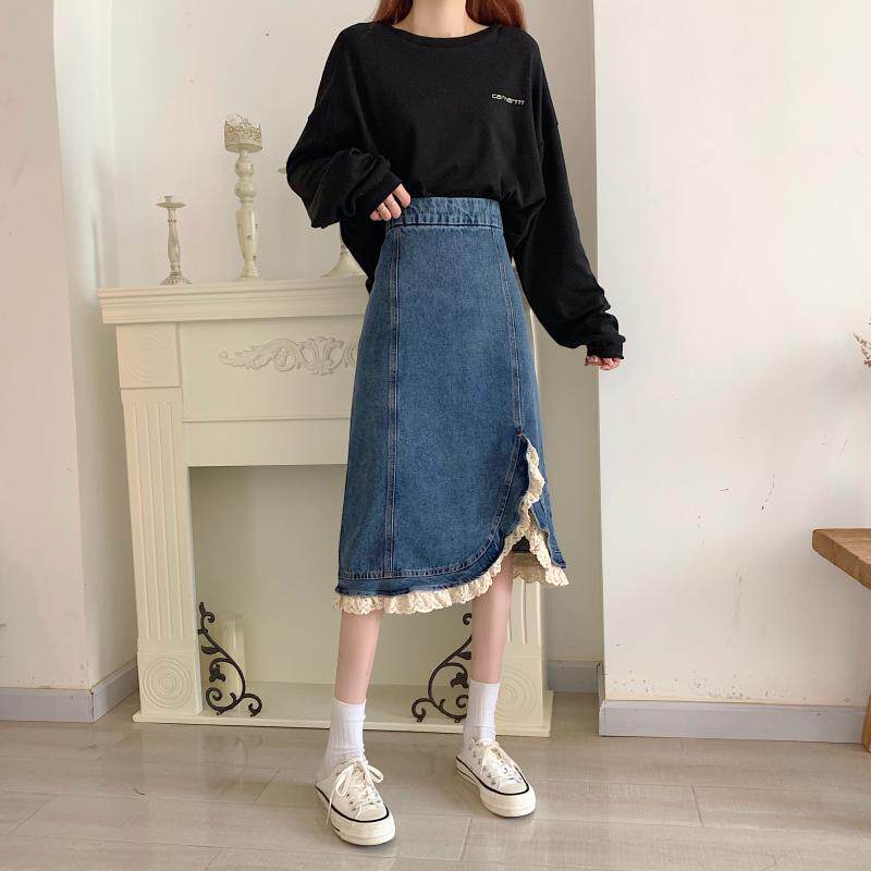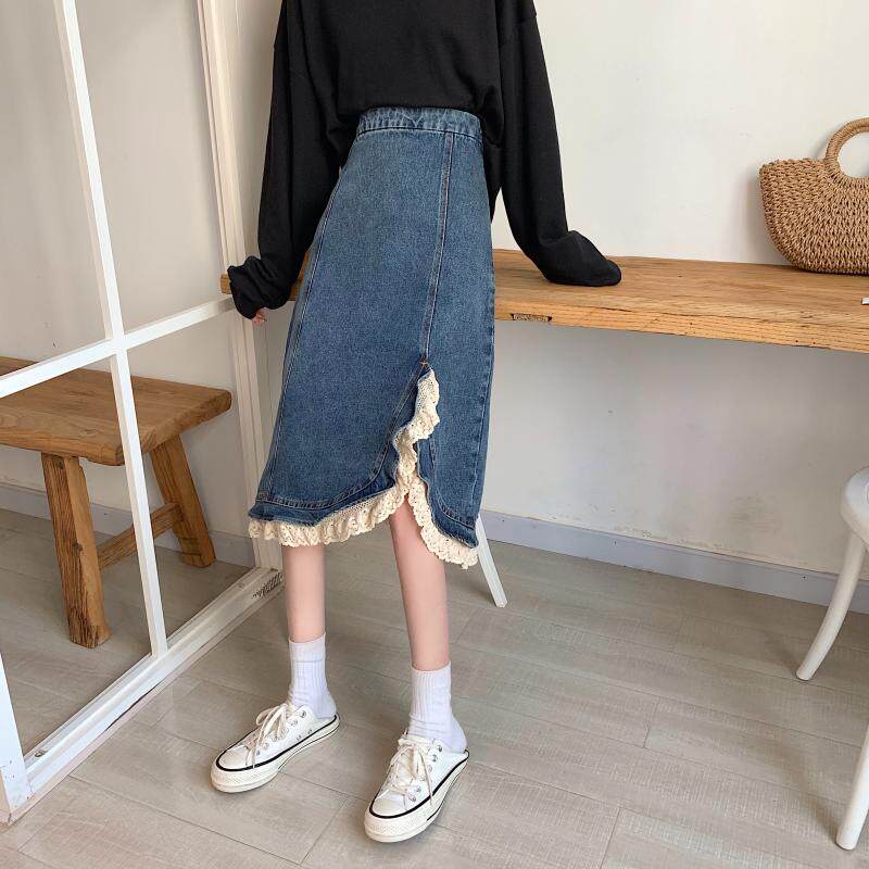 Приталенная ретро кружевная демисезонная длинная дизайнерская джинсовая юбка, высокая талия, тренд сезона, с акцентом на бедрах