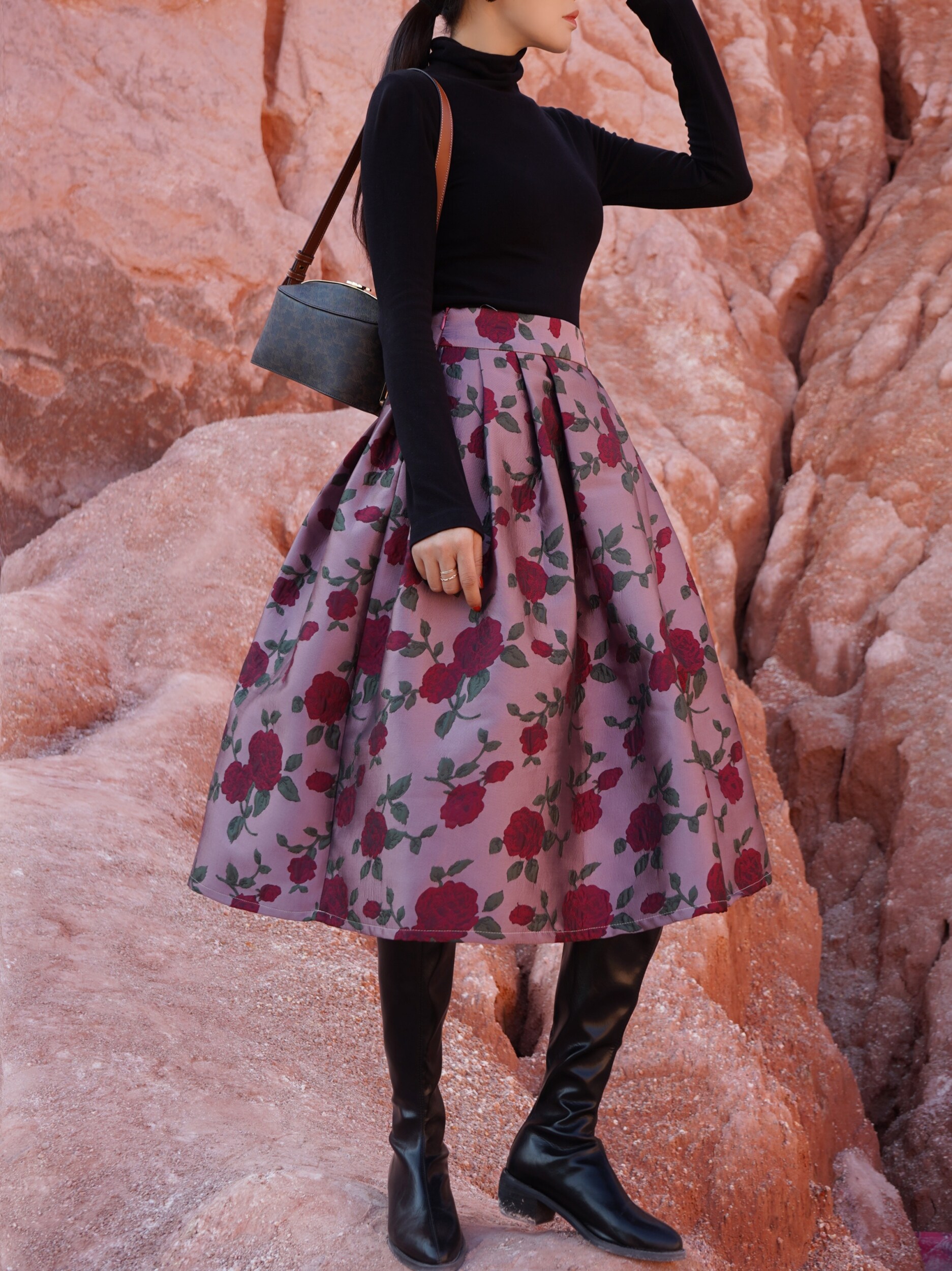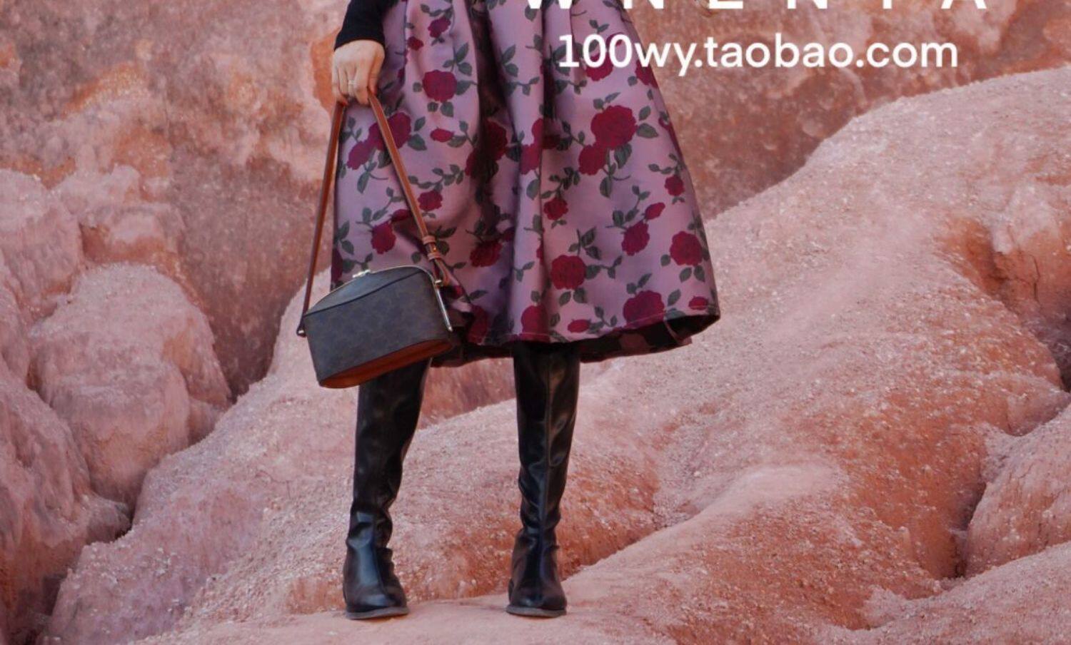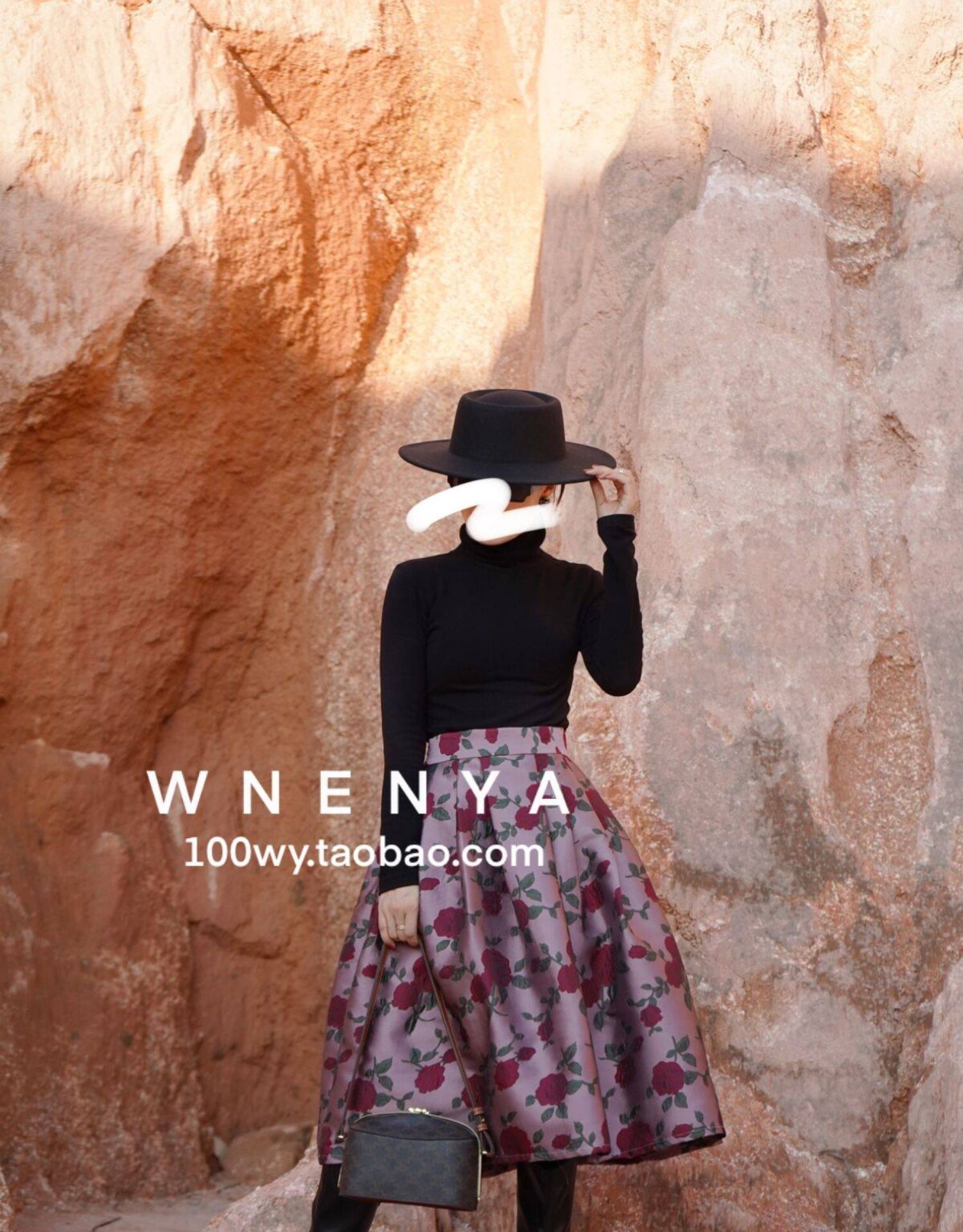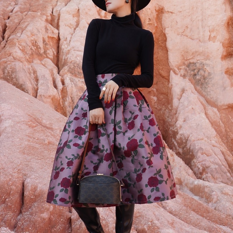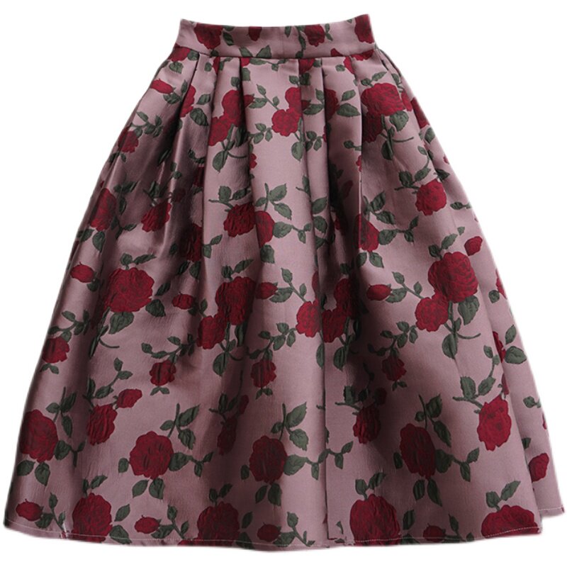 Wenya Palace Пьяная Роза Пышная Юбка Плиссированная Высокая Талия Весна и Осень Жаккардовая Юбка средней длины для зрелого темперамента с зонтиком