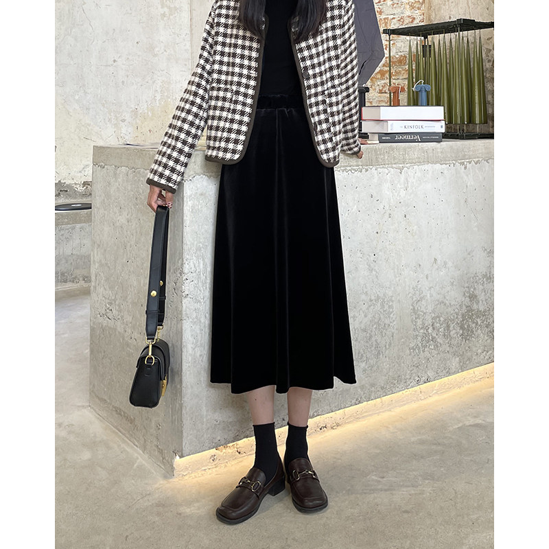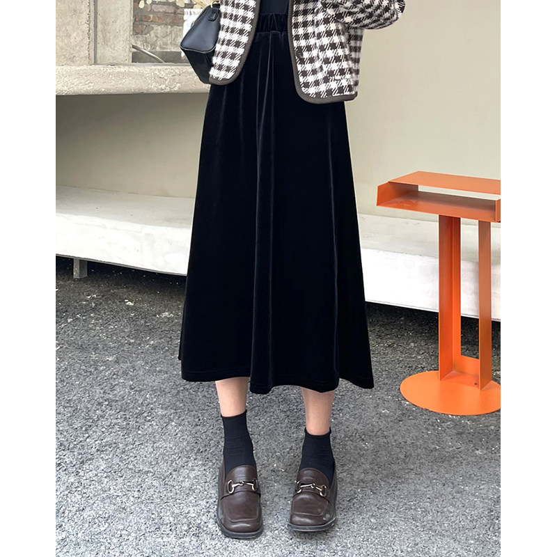 Черная бархатная демисезонная длинная юбка, высокая талия, средней длины, А-силуэт, увеличенная толщина