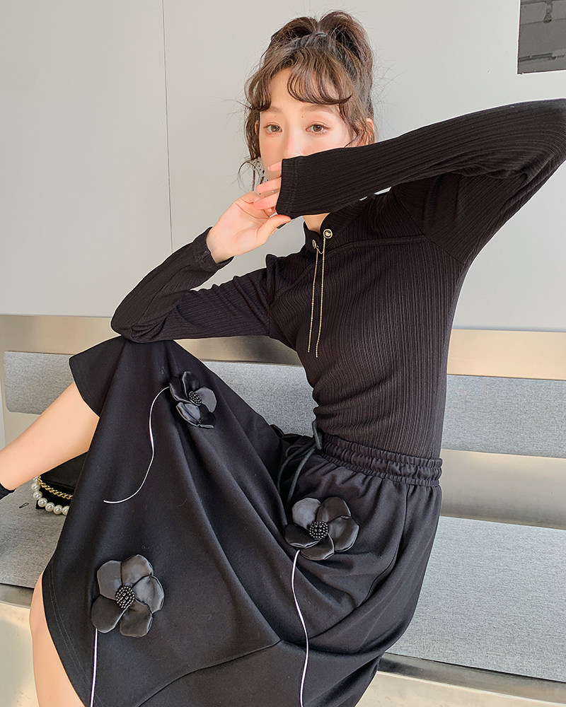 Ретро черная демисезонная трикотажная утепленный лонгслив, свитер, модная юбка, китайский стиль, в цветочек, А-силуэт